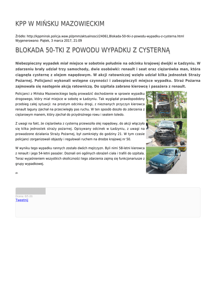 KPP W MIŃSKU MAZOWIECKIM Źródło: http://kppminsk.policja.waw.pl/pmm/aktualnosci/24061,Blokada-50-tki-z-powodu-wypadku-z-cysterna.html Wygenerowano: Piątek, 3 marca 2017, 21:09 BLOKADA 50-TKI Z POWODU WYPADKU Z CYSTERNĄ Niebezpieczny wypadek miał miejsce w sobotnie południe na odcinku krajowej dwójki w Ładzyniu. W zdarzeniu brały udział trzy samochody, dwie osobówki: renault i seat oraz ciężarówka man, która ciągnęła cysternę z olejem napędowym. W akcji ratowniczej wzięło udział kilka jednostek Straży Pożarnej. Policjanci wykonali wstępne czynności i zabezpieczyli miejsce wypadku. Straż Pożarna zajmowała się następnie akcją ratowniczą. Do szpitala zabrano kierowcę i pasażera z renault. Policjanci z Mińska Mazowieckiego będą prowadzić dochodzenie w sprawie wypadku drogowego, który miał miejsce w sobotę w Ładzyniu. Tak wyglądał prawdopodobny przebieg całej sytuacji: na prostym odcinku drogi, z nieznanych przyczyn kierowca renault laguny zjechał na przeciwległy pas ruchu. W ten sposób doszło do zderzenia z ciężarowym manem, który zjechał do przydrożnego rowu i seatem toledo. Z uwagi na fakt, że ciężarówka z cysterną przewoziła olej napędowy, do akcji włączyło się kilka jednostek straży pożarnej. Opisywany odcinek w Ładzyniu, z uwagi na prowadzone działania Straży Pożarnej, był zamknięty do godziny 21. W tym czasie policjanci zorganizowali objazdy i regulowali ruchem na drodze krajowej nr 50. W wyniku tego wypadku rannych zostało dwóch mężczyzn. Byli nimi 58-letni kierowca z renault i jego 54-letni pasażer. Doznali oni ogólnych obrażeń ciała i trafili do szpitala. Teraz wyjaśnieniem wszystkich okoliczności tego zdarzenia zajmą się funkcjonariusze z grupy wypadkowej. dn Ocena: 0/5 (0) Tweetnij