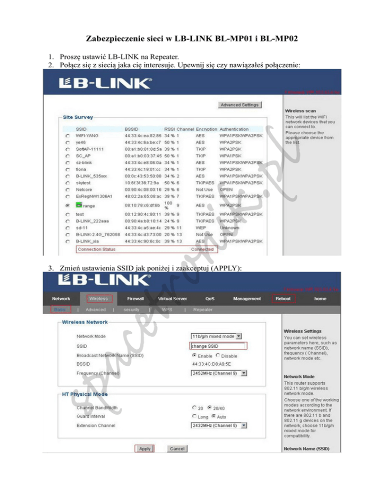 Zabezpieczenie sieci w LB-LINK BL-MP01 i BL-MP02 cet ron ik. p l 1. Proszę ustawić LB-LINK na Repeater. 2. Połącz się z siecią jaka cię interesuje. Upewnij się czy nawiązałeś połączenie: spa 3. Zmień ustawienia SSID jak poniżej i zaakceptuj (APPLY): 4. W ustawieniach sieci bezprzewodowej „Wireless”, wchodzimy w zakładkę zabezpieczenia „Security” i konfigurujemy zabezpieczenie sieci, po czym akceptujemy ustawienia(APPLY): o r t e c a p s k i n l p . 5. Na koniec należy zresetować urządzenie aby zapisać ustawienia, w tym celu klikamy na „Reeboot”, i czekamy na ponowne uruchomienie: