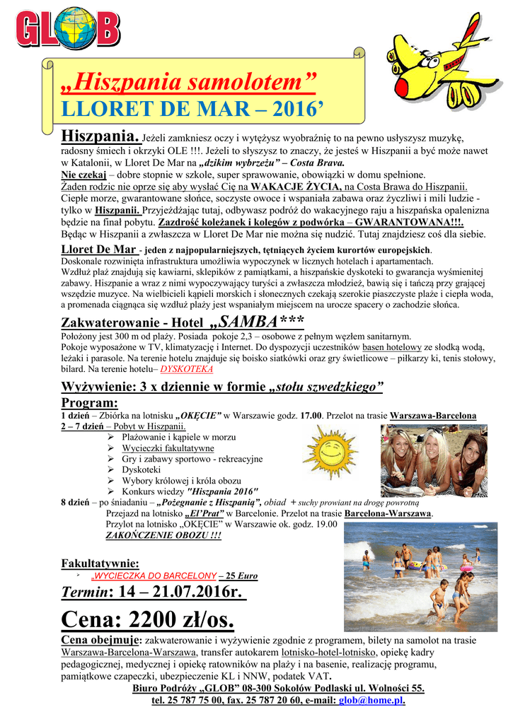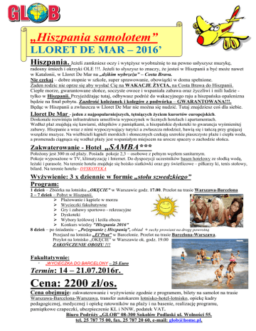 „Hiszpania samolotem” LLORET DE MAR – 2016’ Hiszpania. Jeżeli zamkniesz oczy i wytężysz wyobraźnię to na pewno usłyszysz muzykę, radosny śmiech i okrzyki OLE !!!. Jeżeli to słyszysz to znaczy, że jesteś w Hiszpanii a być może nawet w Katalonii, w Lloret De Mar na „dzikim wybrzeżu” – Costa Brava. Nie czekaj – dobre stopnie w szkole, super sprawowanie, obowiązki w domu spełnione. Żaden rodzic nie oprze się aby wysłać Cię na WAKACJE ŻYCIA, na Costa Brawa do Hiszpanii. Ciepłe morze, gwarantowane słońce, soczyste owoce i wspaniała zabawa oraz życzliwi i mili ludzie tylko w Hiszpanii. Przyjeżdżając tutaj, odbywasz podróż do wakacyjnego raju a hiszpańska opalenizna będzie na finał pobytu. Zazdrość koleżanek i kolegów z podwórka – GWARANTOWANA!!!. Będąc w Hiszpanii a zwłaszcza w Lloret De Mar nie można się nudzić. Tutaj znajdziesz coś dla siebie. Lloret De Mar - jeden z najpopularniejszych, tętniących życiem kurortów europejskich. Doskonale rozwinięta infrastruktura umożliwia wypoczynek w licznych hotelach i apartamentach. Wzdłuż plaż znajdują się kawiarni, sklepików z pamiątkami, a hiszpańskie dyskoteki to gwarancja wyśmienitej zabawy. Hiszpanie a wraz z nimi wypoczywający turyści a zwłaszcza młodzież, bawią się i tańczą przy grającej wszędzie muzyce. Na wielbicieli kąpieli morskich i słonecznych czekają szerokie piaszczyste plaże i ciepła woda, a promenada ciągnąca się wzdłuż plaży jest wspaniałym miejscem na urocze spacery o zachodzie słońca. Zakwaterowanie - Hotel „SAMBA*** Położony jest 300 m od plaży. Posiada pokoje 2,3 – osobowe z pełnym węzłem sanitarnym. Pokoje wyposażone w TV, klimatyzację i Internet. Do dyspozycji uczestników basen hotelowy ze słodką wodą, leżaki i parasole. Na terenie hotelu znajduje się boisko siatkówki oraz gry świetlicowe – piłkarzy ki, tenis stołowy, bilard. Na terenie hotelu– DYSKOTEKA Wyżywienie: 3 x dziennie w formie „stołu szwedzkiego” Program: 1 dzień – Zbiórka na lotnisku „OKĘCIE” w Warszawie godz. 17.00. Przelot na trasie Warszawa-Barcelona 2 – 7 dzień – Pobyt w Hiszpanii. Plażowanie i kąpiele w morzu Wycieczki fakultatywne Gry i zabawy sportowo - rekreacyjne Dyskoteki Wybory królowej i króla obozu Konkurs wiedzy "Hiszpania 2016" 8 dzień – po śniadaniu – „Pożegnanie z Hiszpanią”, obiad + suchy prowiant na drogę powrotną Przejazd na lotnisko „El’Prat” w Barcelonie. Przelot na trasie Barcelona-Warszawa. Przylot na lotnisko „OKĘCIE” w Warszawie ok. godz. 19.00 ZAKOŃCZENIE OBOZU !!! Fakultatywnie: „WYCIECZKA DO BARCELONY – 25 Euro Termin: 14 – 21.07.2016r. Cena: 2200 zł/os. Cena obejmuje: zakwaterowanie i wyżywienie zgodnie z programem, bilety na samolot na trasie Warszawa-Barcelona-Warszawa, transfer autokarem lotnisko-hotel-lotnisko, opiekę kadry pedagogicznej, medycznej i opiekę ratowników na plaży i na basenie, realizację programu, pamiątkowe czapeczki, ubezpieczenie KL i NNW, podatek VAT. Biuro Podróży „GLOB” 08-300 Sokołów Podlaski ul. Wolności 55. tel. 25 787 75 00, fax. 25 787 20 60, e-mail: [email protected].