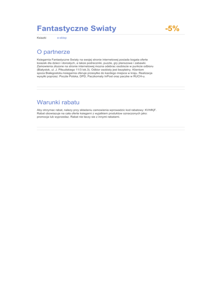 Fantastyczne Swiaty Ksiazki e-sklep O partnerze Ksiegarnia Fantastyczne Swiaty na swojej stronie internetowej posiada bogata oferte ksiazek dla dzieci i dorosłych, a takze podreczniki, puzzle, gry planszowe i zabawki. Zamowienia złozone na stronie internetowej mozna odebrac osobiscie w punkcie odbioru (Białystok, ul. J. Piłsudskiego 11/3 lok.3). Odbior osobisty jest bezpłatny. Klientom spoza Białegostoku ksiegarnia oferuje przesyłke do kazdego miejsca w kraju. Realizacja wysyłki poprzez: Poczte Polska, DPD, Paczkomaty InPost oraz paczke w RUCH-u. Warunki rabatu Aby otrzymac rabat, nalezy przy składaniu zamowienia wprowadzic kod rabatowy: KVhfKjF. Rabat obowiazuje na cała oferte ksiegarni z wyjatkiem produktow oznaczonych jako: promocja lub wyprzedaz. Rabat nie łaczy sie z innymi rabatami. -5%