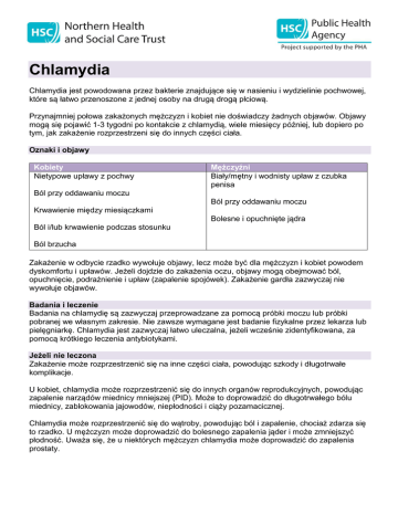 Chlamydia Chlamydia jest powodowana przez bakterie znajdujące się w nasieniu i wydzielinie pochwowej, które są łatwo przenoszone z jednej osoby na drugą drogą płciową. Przynajmniej połowa zakażonych mężczyzn i kobiet nie doświadczy żadnych objawów. Objawy mogą się pojawić 1-3 tygodni po kontakcie z chlamydią, wiele miesięcy później, lub dopiero po tym, jak zakażenie rozprzestrzeni się do innych części ciała. Oznaki i objawy Kobiety Nietypowe upławy z pochwy Mężczyźni Biały/mętny i wodnisty upław z czubka penisa Ból przy oddawaniu moczu Ból przy oddawaniu moczu Krwawienie między miesiączkami Bolesne i opuchnięte jądra Ból i/lub krwawienie podczas stosunku Ból brzucha Zakażenie w odbycie rzadko wywołuje objawy, lecz może być dla mężczyzn i kobiet powodem dyskomfortu i upławów. Jeżeli dojdzie do zakażenia oczu, objawy mogą obejmować ból, opuchnięcie, podrażnienie i upław (zapalenie spojówek). Zakażenie gardła zazwyczaj nie wywołuje objawów. Badania i leczenie Badania na chlamydię są zazwyczaj przeprowadzane za pomocą próbki moczu lub próbki pobranej we własnym zakresie. Nie zawsze wymagane jest badanie fizykalne przez lekarza lub pielęgniarkę. Chlamydia jest zazwyczaj łatwo uleczalna, jeżeli wcześnie zidentyfikowana, za pomocą krótkiego leczenia antybiotykami. Jeżeli nie leczona Zakażenie może rozprzestrzenić się na inne części ciała, powodując szkody i długotrwałe komplikacje. U kobiet, chlamydia może rozprzestrzenić się do innych organów reprodukcyjnych, powodując zapalenie narządów miednicy mniejszej (PID). Może to doprowadzić do długotrwałego bólu miednicy, zablokowania jajowodów, niepłodności i ciąży pozamacicznej. Chlamydia może rozprzestrzenić się do wątroby, powodując ból i zapalenie, chociaż zdarza się to rzadko. U mężczyzn może doprowadzić do bolesnego zapalenia jąder i może zmniejszyć płodność. Uważa się, że u niektórych mężczyzn chlamydia może doprowadzić do zapalenia prostaty. Może również dojść do zapalenia stawów (reaktywne zapalenie stawów), któremu czasem towarzyszy zapalenie cewki moczowej i oczu, nazywane dawniej zespołem Reitera. Zdarza się to rzadki i częściej u mężczyzn niż u kobiet. Zastrzeżenia? W przypadku wszelkich zastrzeżeń należy skontaktować się z kliniką zdrowia układu moczowopłciowego/zdrowia seksualnego. Kliniki zdrowia układu moczowo-płciowego można znaleźć w całej Irlandii Północnej; zob. mapę usług, aby uzyskać więcej informacji.