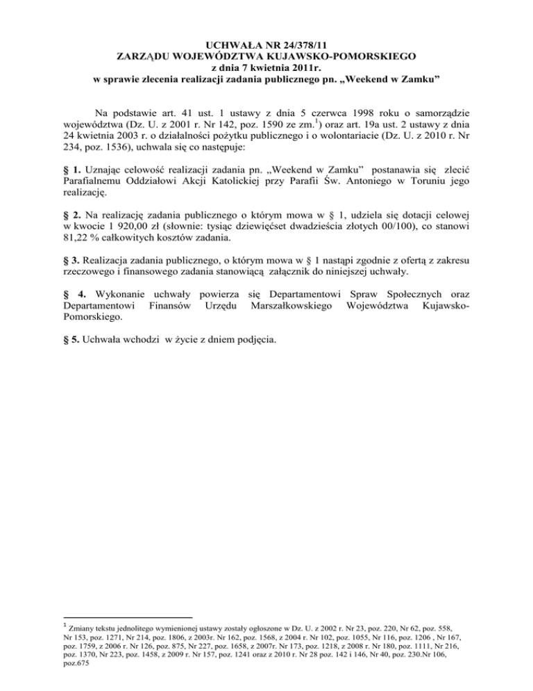 UCHWAŁA NR 24/378/11 ZARZĄDU WOJEWÓDZTWA KUJAWSKO-POMORSKIEGO z dnia 7 kwietnia 2011r. w sprawie zlecenia realizacji zadania publicznego pn. „Weekend w Zamku” Na podstawie art. 41 ust. 1 ustawy z dnia 5 czerwca 1998 roku o samorządzie województwa (Dz. U. z 2001 r. Nr 142, poz. 1590 ze zm.1) oraz art. 19a ust. 2 ustawy z dnia 24 kwietnia 2003 r. o działalności poŜytku publicznego i o wolontariacie (Dz. U. z 2010 r. Nr 234, poz. 1536), uchwala się co następuje: § 1. Uznając celowość realizacji zadania pn. „Weekend w Zamku” postanawia się zlecić Parafialnemu Oddziałowi Akcji Katolickiej przy Parafii Św. Antoniego w Toruniu jego realizację. § 2. Na realizację zadania publicznego o którym mowa w § 1, udziela się dotacji celowej w kwocie 1 920,00 zł (słownie: tysiąc dziewięćset dwadzieścia złotych 00/100), co stanowi 81,22 % całkowitych kosztów zadania. § 3. Realizacja zadania publicznego, o którym mowa w § 1 nastąpi zgodnie z ofertą z zakresu rzeczowego i finansowego zadania stanowiącą załącznik do niniejszej uchwały. § 4. Wykonanie uchwały powierza się Departamentowi Spraw Społecznych oraz Departamentowi Finansów Urzędu Marszałkowskiego Województwa KujawskoPomorskiego. § 5. Uchwała wchodzi w Ŝycie z dniem podjęcia. 1 Zmiany tekstu jednolitego wymienionej ustawy zostały ogłoszone w Dz. U. z 2002 r. Nr 23, poz. 220, Nr 62, poz. 558, Nr 153, poz. 1271, Nr 214, poz. 1806, z 2003r. Nr 162, poz. 1568, z 2004 r. Nr 102, poz. 1055, Nr 116, poz. 1206 , Nr 167, poz. 1759, z 2006 r. Nr 126, poz. 875, Nr 227, poz. 1658, z 2007r. Nr 173, poz. 1218, z 2008 r. Nr 180, poz. 1111, Nr 216, poz. 1370, Nr 223, poz. 1458, z 2009 r. Nr 157, poz. 1241 oraz z 2010 r. Nr 28 poz. 142 i 146, Nr 40, poz. 230.Nr 106, poz.675 UZASADNIENIE Nowelizacja ustawy o działalności poŜytku publicznego i o wolontariacie wprowadza moŜliwość udzielania organizacjom prowadzącym działalność poŜytku publicznego wsparcia finansowego w trybie uproszczonym (bezkonkursowym). Zgodnie z zapisami wyŜej wymienionej ustawy organ wykonawczy jednostki samorządu terytorialnego moŜe na wniosek organizacji pozarządowej zlecić realizację zadania z pominięciem otwartego konkursu ofert. Zadanie takie musi jednak mieć charakter lokalny lub regionalny i spełniać łącznie dwa kryteria: wysokość dofinansowania lub finansowania zadania publicznego nie przekracza kwoty 10 000 zł, a zadanie będzie zrealizowane w okresie nie dłuŜszym niŜ 90 dni. Zarząd Województwa Kujawsko-Pomorskiego uchwałą nr 1/22/2010 z dnia 6 grudnia 2010 r. ogłosił otwarty konkurs ofert nr 6/2011 na wykonywanie w 2011 roku zadania publicznego pn. „Wspieranie zajęć rozwojowych dla dzieci i młodzieŜy zagroŜonych wykluczeniem społecznym”, związanego z realizacją zadań Samorządu Województwa w pomocy społecznej przez organizacje prowadzące działalność poŜytku publicznego. W budŜecie Województwa zaplanowano na ten cel w 2011 roku kwotę w wysokości 300 000,00 zł. Kwota przeznaczona na realizację wybranych ofert wynosi 270 000,00 zł. Pozostała kwota w wysokości 30 000,00 zł przeznaczona jest na wykonanie w roku 2011 przez organizacje prowadzące działalność poŜytku publicznego zadań publicznych związanych z realizacją zadań Samorządu Województwa w zakresie pomocy społecznej w trybie uproszczonym. Mając na uwadze nowe rozwiązania prawne, 22 lutego 2011 r. Parafialny Oddział Akcji Katolickiej przy Parafii Św. Antoniego w Toruniu przedłoŜył wniosek o przyznanie dotacji ze środków publicznych w trybie uproszczonym na realizację zadania w zakresie pomocy społecznej pn. „Weekend w Zamku”. Wspomniana oferta została zgodnie z wymogami ustawy umieszczona na stronie internetowej Urzędu (zakładka „Organizacje Pozarządowe”), w BIP oraz na tablicy ogłoszeń w terminie od 18.03.2011 r. do 25.03.2011 r. Termin ten obowiązywał takŜe dla przedkładania uwag do oferty drogą elektroniczną. W obowiązującym terminie nie zostały wniesione Ŝadne uwagi. Oferta spełnia wymagane kryteria tj. - wnioskowana kwota dotacji wynosi 1 920,00 zł, czyli nie przekracza 10.000,00 zł, - okres realizacji zadania wynosi 22 dni, czyli nie przekracza 90 dni. Parafialny Oddział Akcji Katolickiej przy Parafii Św. Antoniego w Toruniu organizuje integracyjne spotkanie wyjazdowe pn. „Weekend w Zamku”. Zadanie będzie realizowane od 20.03.2011 roku do 10.04.2011 roku. W zadaniu weźmie udział 15 młodych osób będących członkami powstałego we wrześniu 2010 roku Klubu MłodzieŜowego skupiającego młodzieŜ eksperymentującą w zaŜywaniu środków psychoaktywnych. Źródłem finansowania dotacji są wydatki zaplanowane w budŜecie Województwa Kujawsko-Pomorskiego uchwalonym na rok 2011, zadanie: „granty – wspieranie zajęć rozwojowych dla dzieci i młodzieŜy zagroŜonych wykluczeniem społecznym”, Dział 852, rozdział 85295, paragraf 2360– dotacja celowa z budŜetu na finansowanie lub dofinansowanie zadań zleconych do realizacji pozostałym jednostkom nie zaliczanym do sektora finansów publicznych.