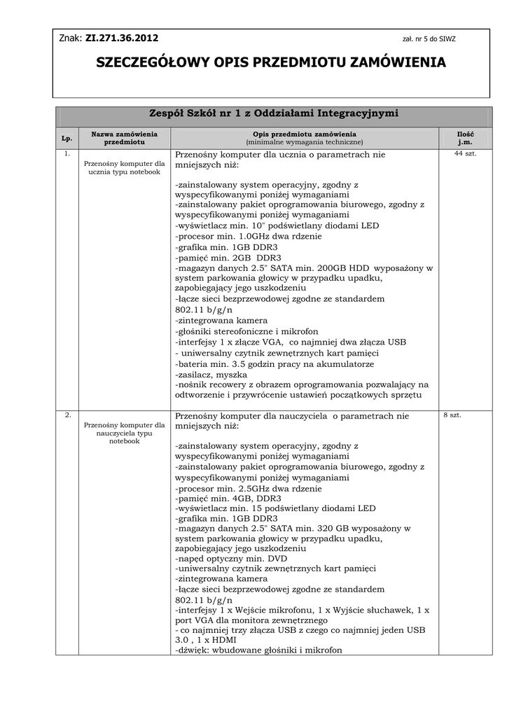 Znak: ZI.271.36.2012 zał. nr 5 do SIWZ SZECZEGÓŁOWY OPIS PRZEDMIOTU ZAMÓWIENIA Zespół Szkół nr 1 z Oddziałami Integracyjnymi Lp. Nazwa zamówienia przedmiotu 1. Przenośny komputer dla ucznia typu notebook Opis przedmiotu zamówienia (minimalne wymagania techniczne) Przenośny komputer dla ucznia o parametrach nie mniejszych niŜ: Ilość j.m. 44 szt. -zainstalowany system operacyjny, zgodny z wyspecyfikowanymi poniŜej wymaganiami -zainstalowany pakiet oprogramowania biurowego, zgodny z wyspecyfikowanymi poniŜej wymaganiami -wyświetlacz min. 10" podświetlany diodami LED -procesor min. 1.0GHz dwa rdzenie -grafika min. 1GB DDR3 -pamięć min. 2GB DDR3 -magazyn danych 2.5" SATA min. 200GB HDD wyposaŜony w system parkowania głowicy w przypadku upadku, zapobiegający jego uszkodzeniu -łącze sieci bezprzewodowej zgodne ze standardem 802.11 b/g/n -zintegrowana kamera -głośniki stereofoniczne i mikrofon -interfejsy 1 x złącze VGA, co najmniej dwa złącza USB - uniwersalny czytnik zewnętrznych kart pamięci -bateria min. 3.5 godzin pracy na akumulatorze -zasilacz, myszka -nośnik recowery z obrazem oprogramowania pozwalający na odtworzenie i przywrócenie ustawień początkowych sprzętu 2. Przenośny komputer dla nauczyciela typu notebook Przenośny komputer dla nauczyciela o parametrach nie mniejszych niŜ: -zainstalowany system operacyjny, zgodny z wyspecyfikowanymi poniŜej wymaganiami -zainstalowany pakiet oprogramowania biurowego, zgodny z wyspecyfikowanymi poniŜej wymaganiami -procesor min. 2.5GHz dwa rdzenie -pamięć min. 4GB, DDR3 -wyświetlacz min. 15 podświetlany diodami LED -grafika min. 1GB DDR3 -magazyn danych 2.5" SATA min. 320 GB wyposaŜony w system parkowania głowicy w przypadku upadku, zapobiegający jego uszkodzeniu -napęd optyczny min. DVD -uniwersalny czytnik zewnętrznych kart pamięci -zintegrowana kamera -łącze sieci bezprzewodowej zgodne ze standardem 802.11 b/g/n -interfejsy 1 x Wejście mikrofonu, 1 x Wyjście słuchawek, 1 x port VGA dla monitora zewnętrznego - co najmniej trzy złącza USB z czego co najmniej jeden USB 3.0 , 1 x HDMI -dźwięk: wbudowane głośniki i mikrofon 8 szt. -bateria min. 3.5 godz. pracy na akumulatorze -zasilacz, torba, myszka -zainstalowane oprogramowanie do obsługi tablicy interaktywnej i innych akcesoriów współpracujących z komputerem (np. wizualizer) -nośnik recowery z obrazem oprogramowania pozwalający na odtworzenie i przywrócenie ustawień początkowych sprzętu 3. 4. 5. Szafka do przechowywania i ładowania sprzętu Sieciowe urządzenie wielofunkcyjne umoŜliwiające co najmniej drukowanie, kopiowanie i skanowanie Drukarka Szafka do przechowywania i ładowania sprzętu o parametrach nie mniejszych niŜ: Szafa z blachy stalowej na kółkach przeznaczona do przechowywania, ładowania i zabezpieczania 16 komputerów uczniowskich (notebooków). -nóŜki poziomujące oraz zestaw jezdny (dwa koła z hamulcem, dwa bez) -zamek z klamką -moŜliwość przypięcia szafy do ściany (uchwyty mocujące) -drzwi wykonane z pełnej blachy -otwory umoŜliwiające wygodny transport -wbudowane urządzenie przeznaczane do bezawaryjnego podłączenia do sieci elektrycznej budynku zestawu informatycznego składającego się z 16 sztuk komputerów wraz z zasilaczami do standardowego gniazda elektrycznego o natęŜeniu max 16A i zabezpieczające instalację elektryczną budynku przed przerwaniem dopływu prądu -montaŜ i podłączenie do sieci elektrycznej Sieciowe urządzenie wielofunkcyjne umoŜliwiające co najmniej drukowanie, kopiowanie i skanowanie o parametrach nie mniejszych niŜ: -technologia druku laserowa kolorowa -format papieru A6 – A4 -interfejs USB 2.0, Ethernet 10/100 Mbps -przewód zasilający, przewód do transmisji danych umoŜliwiający podłączenie do komputera -podłączenie do komputera nauczycielskiego Drukarka o parametrach nie mniejszych niŜ: -format papieru A6 – A4 -interfejs USB 2.0 -technologia druku laserowa kolorowa -przewód zasilający, przewód do transmisji danych umoŜliwiający podłączenie do komputera -podłączenie do komputera nauczycielskiego 3 szt. 1 szt. 4 szt. 6. Tablica interaktywna z systemem mocowania Tablica interaktywna z systemem mocowania o parametrach nie mniejszych niŜ: 5 szt. -obszar interaktywny min. 160,20 x 118,20 cm -przekątna wymiaru interaktywnego min. 199,09 cm, (78,4 ") -wymiar zewnętrzny min. 170,00 x 128,00 cm -oprogramowanie z funkcją tworzenia testów -zasilanie Energia jest pobierana z komputera za pośrednictwem kabla USB -płytka ze sterownikami i oprogramowaniem funkcjonalnym w języku polskim zgodne z systemem operacyjnym komputera nauczycielskiego -kabel usb do połączenia z komputerem (min. 8 mb) -system mocowania do ściany -montaŜ, szkolenie z obsługi tablicy interaktywnej zgodne z wyspecyfikowanymi poniŜej wymaganiami 7. 8. 9. System do zbierania i analizowania odpowiedzi Głośniki Projektor multimedialny NajwaŜniejsze funkcje oprogramowania: 8 szt. -zarządzanie komputerami uczniowskimi (blokowanie komputerów, wygaszanie ekranów, odtwarzanie wybranych plików, nagrywanie wybranych stanowisk) -przesyłanie plików z i do komputerów wybranych komputerów uczniowskich lub grupy tworzenie i przeprowadzanie sprawdzianów, zadań testowych, ankiet z uwzględnieniem elementów graficznych i plików audio/video, -pobieranie prac z komputerów uczniowskich z moŜliwością archiwizacji -automatyzacja wszystkich powyŜszych czynności -system zainstalowany i gotowy do działania na komputerach uczniowskich i nauczycielskich (1 licencja dla komputera nauczycielskiego = 1 szt. w kolumnie „Ilość j.m.”) -szkolenie z obsługi systemu zgodne z wyspecyfikowanymi poniŜej wymaganiami Głośniki o parametrach nie mniejszych niŜ: 6 szt. -w komplecie (1 komplet = 1 szt. w kolumnie „Ilość j.m.” ) dwa głośniki -dwudroŜne kolumny stereofoniczne -moc wyjściowa jednej kolumny min. RMS 12W -kontrola dźwięku (głośność, tony) 