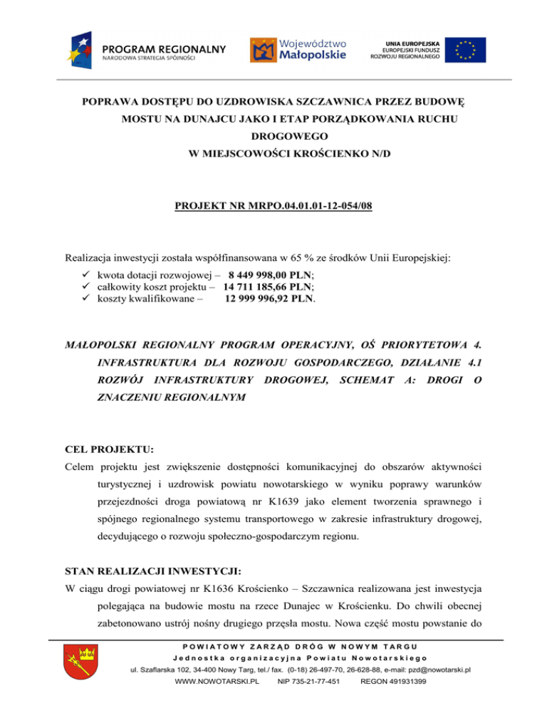 POPRAWA DOSTĘPU DO UZDROWISKA SZCZAWNICA PRZEZ BUDOWĘ MOSTU NA DUNAJCU JAKO I ETAP PORZĄDKOWANIA RUCHU DROGOWEGO W MIEJSCOWOŚCI KROŚCIENKO N/D PROJEKT NR MRPO.04.01.01-12-054/08 Realizacja inwestycji została współfinansowana w 65 % ze środków Unii Europejskiej: kwota dotacji rozwojowej – 8 449 998,00 PLN; całkowity koszt projektu – 14 711 185,66 PLN; koszty kwalifikowane – 12 999 996,92 PLN. MAŁOPOLSKI REGIONALNY PROGRAM OPERACYJNY, OŚ PRIORYTETOWA 4. INFRASTRUKTURA DLA ROZWOJU GOSPODARCZEGO, DZIAŁANIE 4.1 ROZWÓJ INFRASTRUKTURY DROGOWEJ, SCHEMAT A: DROGI O ZNACZENIU REGIONALNYM CEL PROJEKTU: Celem projektu jest zwiększenie dostępności komunikacyjnej do obszarów aktywności turystycznej i uzdrowisk powiatu nowotarskiego w wyniku poprawy warunków przejezdności droga powiatową nr K1639 jako element tworzenia sprawnego i spójnego regionalnego systemu transportowego w zakresie infrastruktury drogowej, decydującego o rozwoju społeczno-gospodarczym regionu. STAN REALIZACJI INWESTYCJI: W ciągu drogi powiatowej nr K1636 Krościenko – Szczawnica realizowana jest inwestycja polegająca na budowie mostu na rzece Dunajec w Krościenku. Do chwili obecnej zabetonowano ustrój nośny drugiego przęsła mostu. Nowa część mostu powstanie do POW IATOW Y ZARZ ĄD DRÓG W NOW YM TARGU Jednostka organizacyjna Powiatu Nowotarskiego ul. Szaflarska 102, 34-400 Nowy Targ, tel./ fax. (0-18) 26-497-70, 26-628-88, e-mail: [email protected] WWW.NOWOTARSKI.PL NIP 735-21-77-451 REGON 491931399 połowy 2010 roku. Następnie wykonawca robót przystąpi do modernizacji istniejącego obiektu, która polegać będzie na częściowej rozbiórce konstrukcji nośnej, jej odtworzeniu oraz spręŜeniu celem podniesienia nośności obiektu. Zakończenie całej inwestycji planowane jest na połowę roku 2011. W III kwartale 2009 roku w miejscu realizacji przedmiotowej inwestycji umieszczono tablice informacyjne opatrzone logo oraz zawierające wymagane informacje. OKRES REALIZACJI: termin rozpoczęcia realizacji – 24.07.2009 planowany termin rzeczowego i finansowego zakończenia realizacji – 22.07.2011 Projekt został wybrany do dofinansowania w dniu 2 grudnia 2008 r. Uchwałą nr 1094/08 Zarządu Województwa Małopolskiego w sprawie wyboru projektów do dofinansowania w ramach Działania 4.1 Rozwój infrastruktury drogowej, Schematu A: Drogi regionalne Małopolskiego Regionalnego Programu Operacyjnego na lata 2007-2013. WAśNE WYDARZENIA: 05.06.2009 r. - podpisanie umowy o dofinansowanie przedmiotowego projektu; 17.12.2009 r. - podpisanie aneksu nr 1 do umowy o dofinansowanie przedmiotowego projektu; 01.03.2010 r. - podpisanie aneksu nr 2 do umowy o dofinansowanie przedmiotowego projektu; 08.09.2009 r. – przekazanie przez IZ MRPO zaliczki w wysokości 2 534 999,40 PLN; do chwili obecnej Beneficjent złoŜył trzy wnioski o płatność: dwa wnioski sprawozdawcze oraz jeden rozliczający zaliczkę i zarazem refundacyjny - na całkowitą kwotę wydatków – 4 292 908,33 PLN, w tym kwota wydatków kwalifikowalnych – 4 292 908,93 PLN, wnioskowana kwota (refundacja) – 255 391,40 PLN. Do tej pory na rachunek Beneficjenta została przekazana transza dofinansowania w wysokości 2 790 390,80 PLN. FOTOGRAFIE: POW IATOW Y ZARZ ĄD DRÓG W NOW YM TARGU Jednostka organizacyjna Powiatu Nowotarskiego ul. Szaflarska 102, 34-400 Nowy Targ, tel./ fax. (0-18) 26-497-70, 26-628-88, e-mail: [email protected] WWW.NOWOTARSKI.PL NIP 735-21-77-451 REGON 491931399