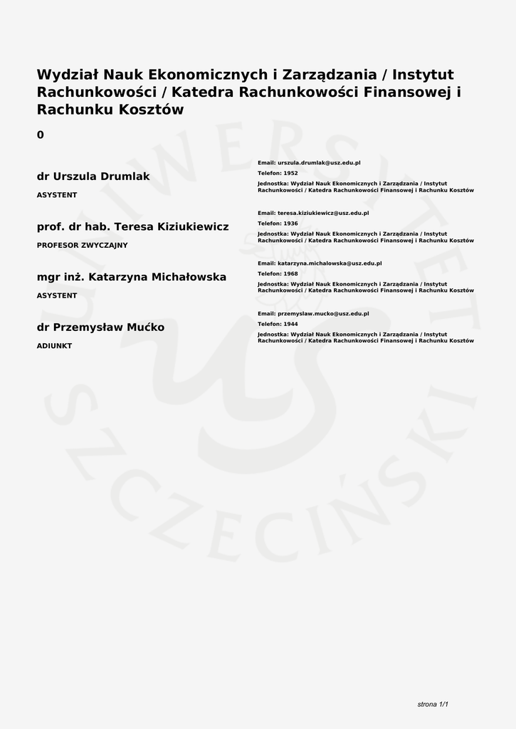 Wydział Nauk Ekonomicznych i Zarządzania / Instytut Rachunkowości / Katedra Rachunkowości Finansowej i Rachunku Kosztów 0 Email: [email protected] dr Urszula Drumlak ASYSTENT Telefon: 1952 Jednostka: Wydział Nauk Ekonomicznych i Zarządzania / Instytut Rachunkowości / Katedra Rachunkowości Finansowej i Rachunku Kosztów Email: [email protected] prof. dr hab. Teresa Kiziukiewicz PROFESOR ZWYCZAJNY Telefon: 1936 Jednostka: Wydział Nauk Ekonomicznych i Zarządzania / Instytut Rachunkowości / Katedra Rachunkowości Finansowej i Rachunku Kosztów Email: [email protected] mgr inż. Katarzyna Michałowska ASYSTENT Telefon: 1968 Jednostka: Wydział Nauk Ekonomicznych i Zarządzania / Instytut Rachunkowości / Katedra Rachunkowości Finansowej i Rachunku Kosztów Email: [email protected] dr Przemysław Mućko ADIUNKT Telefon: 1944 Jednostka: Wydział Nauk Ekonomicznych i Zarządzania / Instytut Rachunkowości / Katedra Rachunkowości Finansowej i Rachunku Kosztów strona 1/1 Powered by TCPDF (www.tcpdf.org)