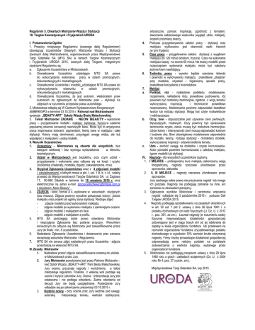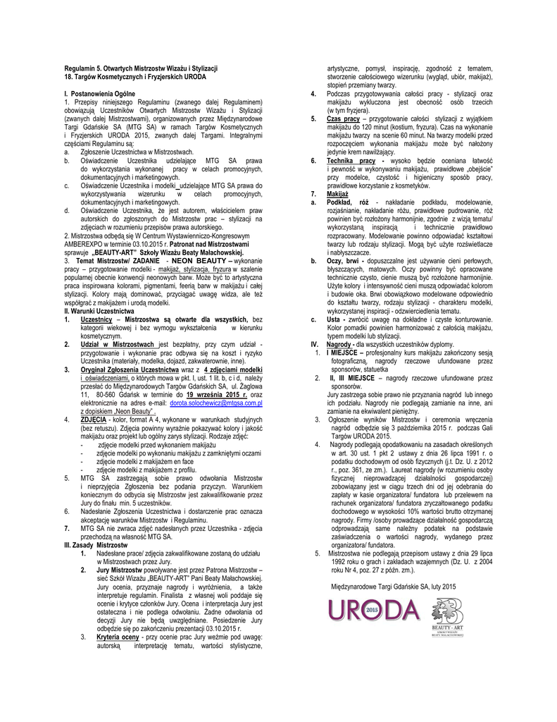 Regulamin 5. Otwartych Mistrzostw Wizażu i Stylizacji 18. Targów Kosmetycznych i Fryzjerskich URODA I. Postanowienia Ogólne 1. Przepisy niniejszego Regulaminu (zwanego dalej Regulaminem) obowiązują Uczestników Otwartych Mistrzostw Wizażu i Stylizacji (zwanych dalej Mistrzostwami), organizowanych przez Międzynarodowe Targi Gdańskie SA (MTG SA) w ramach Targów Kosmetycznych i Fryzjerskich URODA 2015, zwanych dalej Targami. Integralnymi częściami Regulaminu są: a. Zgłoszenie Uczestnictwa w Mistrzostwach. b. Oświadczenie Uczestnika udzielające MTG SA prawa do wykorzystania wykonanej pracy w celach promocyjnych, dokumentacyjnych i marketingowych. c. Oświadczenie Uczestnika i modelki udzielające MTG SA prawa do wykorzystywania wizerunku w celach promocyjnych, dokumentacyjnych i marketingowych. d. Oświadczenie Uczestnika, że jest autorem, właścicielem praw autorskich do zgłoszonych do Mistrzostw prac – stylizacji na zdjęciach w rozumieniu przepisów prawa autorskiego. 2. Mistrzostwa odbędą się W Centrum Wystawienniczo-Kongresowym AMBEREXPO w terminie 03.10.2015 r. Patronat nad Mistrzostwami sprawuje „BEAUTY-ART” Szkoły Wizażu Beaty Małachowskiej. 3. Temat Mistrzostw/ ZADANIE - NEON BEAUTY – wykonanie pracy – przygotowanie modelki - makijaż, stylizacja, fryzura w szalenie popularnej obecnie konwencji neonowych barw. Może być to artystyczna praca inspirowana kolorami, pigmentami, feerią barw w makijażu i całej stylizacji. Kolory mają dominować, przyciągać uwagę widza, ale też współgrać z makijażem i urodą modelki. II. Warunki Uczestnictwa 1. Uczestnicy – Mistrzostwa są otwarte dla wszystkich, bez kategorii wiekowej i bez wymogu wykształcenia w kierunku kosmetycznym. 2. Udział w Mistrzostwach jest bezpłatny, przy czym udział przygotowanie i wykonanie prac odbywa się na koszt i ryzyko Uczestnika (materiały, modelka, dojazd, zakwaterownie, inne). 3. Oryginał Zgłoszenia Uczestnictwa wraz z 4 zdjęciami modelki i oświadczeniami, o których mowa w pkt. I, ust. 1 lit. b, c i d, należy przesłać do Międzynarodowych Targów Gdańskich SA, ul. Żaglowa 11, 80-560 Gdańsk w terminie do 19 września 2015 r. oraz elektronicznie na adres e-mail: [email protected] z dopiskiem „Neon Beauty” . 4. ZDJĘCIA - kolor, format A 4, wykonane w warunkach studyjnych (bez retuszu). Zdjęcia powinny wyraźnie pokazywać kolory i jakość makijażu oraz projekt lub ogólny zarys stylizacji. Rodzaje zdjęć: zdjęcie modelki przed wykonaniem makijażu zdjęcie modelki po wykonaniu makijażu z zamkniętymi oczami zdjęcie modelki z makijażem en face zdjęcie modelki z makijażem z profilu. 5. MTG SA zastrzegają sobie prawo odwołania Mistrzostw i nieprzyjęcia Zgłoszenia bez podania przyczyn. Warunkiem koniecznym do odbycia się Mistrzostw jest zakwalifikowanie przez Jury do finału min. 5 uczestników. 6. Nadesłanie Zgłoszenia Uczestnictwa i dostarczenie prac oznacza akceptację warunków Mistrzostw i Regulaminu. 7. MTG SA nie zwraca zdjęć nadesłanych przez Uczestnika - zdjęcia przechodzą na własność MTG SA. III. Zasady Mistrzostw 1. Nadesłane prace/ zdjęcia zakwalifikowane zostaną do udziału w Mistrzostwach przez Jury. 2. Jury Mistrzostw powoływane jest przez Patrona Mistrzostw – sieć Szkół Wizażu „BEAUTY-ART” Pani Beaty Małachowskiej. Jury ocenia, przyznaje nagrody i wyróżnienia, a także interpretuje regulamin. Finalista z własnej woli poddaje się ocenie i krytyce członków Jury. Ocena i interpretacja Jury jest ostateczna i nie podlega odwołaniu. Żadne odwołania od decyzji Jury nie będą uwzględniane. Posiedzenie Jury odbędzie się po zakończeniu prezentacji 03.10.2015 r. 3. Kryteria oceny - przy ocenie prac Jury weźmie pod uwagę: autorską interpretację tematu, wartości stylistyczne, 4. 5. 6. 7. a. b. c. IV. 1. 2. 3. 4. 5. artystyczne, pomysł, inspirację, zgodność z tematem, stworzenie całościowego wizerunku (wygląd, ubiór, makijaż), stopień przemiany twarzy. Podczas przygotowywania całości pracy - stylizacji oraz makijażu wykluczona jest obecność osób trzecich (w tym fryzjera). Czas pracy – przygotowanie całości stylizacji z wyjątkiem makijażu do 120 minut (kostium, fryzura). Czas na wykonanie makijażu twarzy na scenie 60 minut. Na twarzy modelki przed rozpoczęciem wykonania makijażu może być nałożony jedynie krem nawilżający. Technika pracy - wysoko będzie oceniana łatwość i pewność w wykonywaniu makijażu, prawidłowe „obejście” przy modelce, czystość i higieniczny sposób pracy, prawidłowe korzystanie z kosmetyków. Makijaż Podkład, róż - nakładanie podkładu, modelowanie, rozjaśnianie, nakładanie różu, prawidłowe pudrowanie, róż powinien być rozłożony harmonijnie, zgodnie z wizją tematu/ wykorzystaną inspiracją i technicznie prawidłowo rozpracowany. Modelowanie powinno odpowiadać kształtowi twarzy lub rodzaju stylizacji. Mogą być użyte rozświetlacze i nabłyszczacze. Oczy, brwi - dopuszczalne jest używanie cieni perłowych, błyszczących, matowych. Oczy powinny być opracowane technicznie czysto, cienie muszą być rozłożone harmonijnie. Użyte kolory i intensywność cieni muszą odpowiadać kolorom i budowie oka. Brwi obowiązkowo modelowane odpowiednio do kształtu twarzy, rodzaju stylizacji - charakteru modelki, wykorzystanej inspiracji - odzwierciedlenia tematu. Usta - zwrócić uwagę na dokładne i czyste konturowanie. Kolor pomadki powinien harmonizować z całością makijażu, typem modelki lub stylizacji. Nagrody - dla wszystkich uczestników dyplomy. I MIEJSCE – profesjonalny kurs makijażu zakończony sesją fotograficzną, nagrody rzeczowe ufundowane przez sponsorów, statuetka II, III MIEJSCE – nagrody rzeczowe ufundowane przez sponsorów. Jury zastrzega sobie prawo nie przyznania nagród lub innego ich podziału. Nagrody nie podlegają zamianie na inne, ani zamianie na ekwiwalent pieniężny. Ogłoszenie w