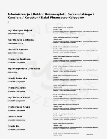 Administracja / Rektor Uniwersytetu Szczecińskiego / Kanclerz / Kwestor / Dział Finansowo-Księgowy 0 Email: [email protected] mgr Grażyna Hajduk KIEROWNIK DZIAĹU Telefon: 1108 Jednostka: Administracja / Rektor Uniwersytetu Szczecińskiego / Kanclerz / Kwestor / Dział Finansowo-Księgowy Email: [email protected] mgr Danuta Gertruda KIEROWNIK SEKCJI Telefon: 1007 Jednostka: Administracja / Rektor Uniwersytetu Szczecińskiego / Kanclerz / Kwestor / Dział Finansowo-Księgowy Email: [email protected] Barbara Rudzka KIEROWNIK SEKCJI Telefon: 1200 Jednostka: Administracja / Rektor Uniwersytetu Szczecińskiego / Kanclerz / Kwestor / Dział Finansowo-Księgowy Email: [email protected] Marzena Bagińska STARSZA KSIÄGOWA Telefon: 1116 Jednostka: Administracja / Rektor Uniwersytetu Szczecińskiego / Kanclerz / Kwestor / Dział Finansowo-Księgowy Email: [email protected] mgr Małgorzata Grabowicz KSIÄGOWA Telefon: 1115 Jednostka: Administracja / Rektor Uniwersytetu Szczecińskiego / Kanclerz / Kwestor / Dział Finansowo-Księgowy Email: [email protected] Maria Jaworska STARSZA KSIÄGOWA Telefon: Jednostka: Administracja / Rektor Uniwersytetu Szczecińskiego / Kanclerz / Kwestor / Dział Finansowo-Księgowy Email: [email protected] Marzena Juras STARSZA KSIÄGOWA Telefon: 1002 Jednostka: Administracja / Rektor Uniwersytetu Szczecińskiego / Kanclerz / Kwestor / Dział Finansowo-Księgowy Email: [email protected] mgr Danuta Kmieć STARSZA KSIÄGOWA Telefon: 1200 Jednostka: Administracja / Rektor Uniwersytetu Szczecińskiego / Kanclerz / Kwestor / Dział Finansowo-Księgowy Email: [email protected] Małgorzata Krupa STARSZA KSIÄGOWA Telefon: 1109 Jednostka: Administracja / Rektor Uniwersytetu Szczecińskiego / Kanclerz / Kwestor / Dział Finansowo-Księgowy Email: [email protected] Anna Lasek STARSZA KSIÄGOWA Telefon: 1309 Jednostka: Administracja / Rektor Uniwersytetu Szczecińskiego / Kanclerz / Kwestor / Dział Finansowo-Księgowy Email: [email protected] Maria Lis STARSZA KSIÄGOWA Telefon: 1303 Jednostka: Administracja / Rektor Uniwersytetu Szczecińskiego / Kanclerz / Kwestor / Dział Finansowo-Księgowy Email: [email protected] Telefon: 1204 strona 1/2 mgr Czesława Naściuk Jednostka: Administracja / Rektor Uniwersytetu Szczecińskiego / Kanclerz / Kwestor / Dział Finansowo-Księgowy SAMODZIELNA KSIÄGOWA Email: [email protected] Andrzej Opatowicz STARSZY KSIÄGOWY Telefon: 1309 Jednostka: Administracja / Rektor Uniwersytetu Szczecińskiego / Kanclerz / Kwestor / Dział Finansowo-Księgowy Email: [email protected] mgr Mirosława Rządkowska STARSZA KSIÄGOWA Telefon: 1116 Jednostka: Administracja / Rektor Uniwersytetu Szczecińskiego / Kanclerz / Kwestor / Dział Finansowo-Księgowy Email: [email protected] Sylwia Salamon STARSZA KSIÄGOWA Telefon: 1204 Jednostka: Administracja / Rektor Uniwersytetu Szczecińskiego / Kanclerz / Kwestor / Dział Finansowo-Księgowy Email: [email protected] Magdalena Smolińska STARSZA KSIÄGOWA Telefon: 1109 Jednostka: Administracja / Rektor Uniwersytetu Szczecińskiego / Kanclerz / Kwestor / Dział Finansowo-Księgowy Email: [email protected] mgr Tatiana Sobiło STARSZA KSIÄGOWA Telefon: 1110 Jednostka: Administracja / Rektor Uniwersytetu Szczecińskiego / Kanclerz / Kwestor / Dział Finansowo-Księgowy Email: [email protected] Aneta Stępień STARSZA KSIÄGOWA Telefon: 1109 Jednostka: Administracja / Rektor Uniwersytetu Szczecińskiego / Kanclerz / Kwestor / Dział Finansowo-Księgowy Email: [email protected] mgr Anna Stępień KSIÄGOWA Telefon: 1309 Jednostka: Administracja / Rektor Uniwersytetu Szczecińskiego / Kanclerz / Kwestor / Dział Finansowo-Księgowy Email: [email protected] mgr Elżbieta Tkaczyk KASJER Telefon: 1122 Jednostka: Administracja / Rektor Uniwersytetu Szczecińskiego / Kanclerz / Kwestor / Dział Finansowo-Księgowy Email: [email protected] mgr Anna Łój SAMODZIELNA KSIÄGOWA Telefon: 1303 Jednostka: Administracja / Rektor Uniwersytetu Szczecińskiego / Kanclerz / Kwestor / Dział Finansowo-Księgowy strona 2/2 Powered by TCPDF (www.tcpdf.org)