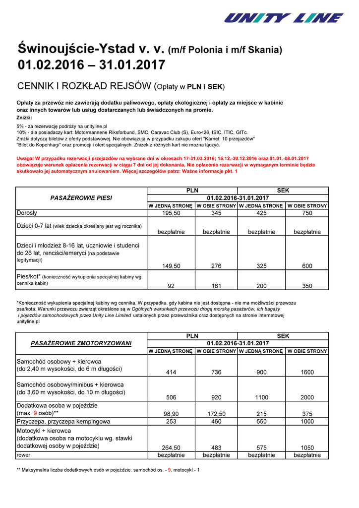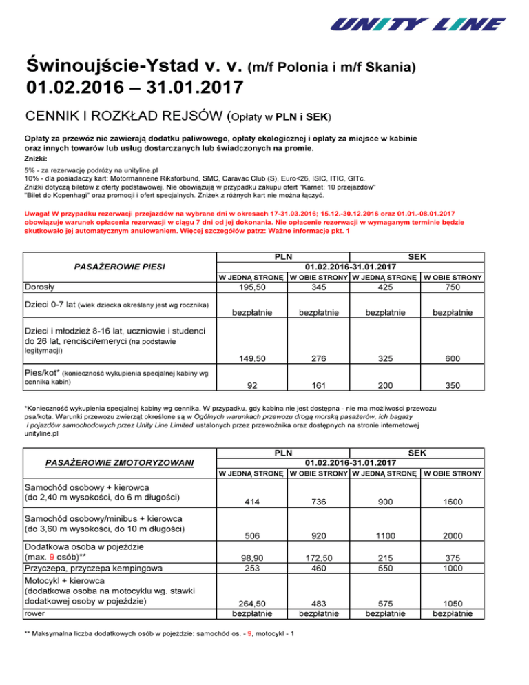 Świnoujście-Ystad v. v. (m/f Polonia i m/f Skania) 01.02.2016 – 31.01.2017 CENNIK I ROZKŁAD REJSÓW (Opłaty w PLN i SEK) Opłaty za przewóz nie zawierają dodatku paliwowego, opłaty ekologicznej i opłaty za miejsce w kabinie oraz innych towarów lub usług dostarczanych lub świadczonych na promie. Zniżki: 5% - za rezerwację podróży na unityline.pl 10% - dla posiadaczy kart: Motormannene Riksforbund, SMC, Caravac Club (S), Euro<26, ISIC, ITIC, GITc. Zniżki dotyczą biletów z oferty podstawowej. Nie obowiązują w przypadku zakupu ofert "Karnet: 10 przejazdów" "Bilet do Kopenhagi" oraz promocji i ofert specjalnych. Zniżek z różnych kart nie można łączyć. Uwaga! W przypadku rezerwacji przejazdów na wybrane dni w okresach 17-31.03.2016; 15.12.-30.12.2016 oraz 01.01.-08.01.2017 obowiązuje warunek opłacenia rezerwacji w ciągu 7 dni od jej dokonania. Nie opłacenie rezerwacji w wymaganym terminie będzie skutkowało jej automatycznym anulowaniem. Więcej szczegółów patrz: Ważne informacje pkt. 1 PLN PASAŻEROWIE PIESI SEK 01.02.2016-31.01.2017 W JEDNĄ STRONĘ W OBIE STRONY W JEDNĄ STRONĘ Dorosły Dzieci 0-7 lat (wiek dziecka określany jest wg rocznika) W OBIE STRONY 195,50 345 425 750 bezpłatnie bezpłatnie bezpłatnie bezpłatnie 149,50 276 325 600 92 161 200 350 Dzieci i młodzież 8-16 lat, uczniowie i studenci do 26 lat, renciści/emeryci (na podstawie legitymacji) Pies/kot* (konieczność wykupienia specjalnej kabiny wg cennika kabin) *Konieczność wykupienia specjalnej kabiny wg cennika. W przypadku, gdy kabina nie jest dostępna - nie ma możliwości przewozu psa/kota. Warunki przewozu zwierząt określone są w Ogólnych warunkach przewozu drogą morską pasażerów, ich bagaży i pojazdów samochodowych przez Unity Line Limited ustalonych przez przewoźnika oraz dostępnych na stronie internetowej unityline.pl PLN PASAŻEROWIE ZMOTORYZOWANI SEK 01.02.2016-31.01.2017 W JEDNĄ STRONĘ W OBIE STRONY W JEDNĄ STRONĘ Samochód osobowy + kierowca (do 2,40 m wysokości, do 6 m długości) Samochód osobowy/minibus + kierowca (do 3,60 m wysokości, do 10 m długości) Dodatkowa osoba w pojeździe (max. 9 osób)** Przyczepa, przyczepa kempingowa Motocykl + kierowca (dodatkowa osoba na motocyklu wg. stawki dodatkowej osoby w pojeździe) rower W OBIE STRONY 414 736 900 1600 506 920 1100 2000 98,90 253 172,50 460 215 550 375 1000 264,50 bezpłatnie 483 bezpłatnie 575 bezpłatnie 1050 bezpłatnie ** Maksymalna liczba dodatkowych osób w pojeździe: samochód os. - 9, motocykl - 1 Ostateczne dane osób korzystających z ofert dla pasażerów zmotoryzowanych, muszą być podane nie później niż 24 godz. robocze (pn-pt. 8:00-18:00 i w sb 9:00-14:00) przed rozpoczęciem rejsu, wynikającym z rozkładu. Wielkość samochodów osobowych określona jest w Ogólnych warunkach przewozu drogą morską pasażerów, ich bagaży i pojazdów samochodowych przez Unity Line Limited ustalonych przez przewoźnika oraz dostępnych na stronie internetowej unityline.pl Taryfy uwzględniające przewóz samochodu mają zastosowanie tylko i wyłącznie do pojazdów, których dopuszczalna masa całkowita nie przekracza 3,5 tony oraz których długość nie przekracza 10 m (w przypadku pojazdów z przyczepą, zestawów samochód plus przyczepa kempingowa - długość zestawu nie może przekroczyć 12m). BILET DO KOPENHAGI PLN Rozpoczęcie podróży ze Świnoujścia lub Ystad codziennie. Bilet nie podlega zwrotowi. Liczba ofert limitowana. Dorosły, emeryt, rencista, uczniowie i studenci do 26 lat *** Samochód osobowy**** + kierowca (do 6m długości) Dodatkowa osoba w pojeździe (max. 9 osób)* SEK 01.02.2016-31.01.2017 W JEDNĄ STRONĘ W OBIE STRONY W JEDNĄ STRONĘ W OBIE STRONY 218,50 402,50 475 875 460 851 1000 1850 98,90 172,50 215 375 Opłata zawiera: przewóz promem Polonia lub Skania, opłatę za przejazd mostem Oresund (Malmo-Kopenhaga) lub bilet na autobus 866 na trasie Ystad-Kopenhaga (opcja dla pasażera pieszego). Bilety nie podlegają zwrotowi. Liczba ofert limitowana. *** Z oferty "Bilet do Kopenhagi' dla pasażera pieszego można skorzystać tylko i wyłącznie w dniach kursowania autobusu 866. Rozkład jazdy autobusu dostępny na unityline.pl **** Samochód osobowy do 6 m długości; w sprawie przewozu samochodu powyżej 6 m długości, samochodu z przyczepą lub motocyklu skontaktuj się z Call Center +48 91 35 95 600, [email protected] Podczas rejsów nocnych 50% zniżki na ceny kabin na promach Polonia i Skania. Rabat obowiązuje na kabiny zarezerwowane min. 24 godziny robocze przed planowanym rejsem. Rabat nie obowiązuje przy wykupie kabiny bezpośrednio na promie. Warunkiem skorzystania z oferty jest dokonanie i wykupienie rezerwacji przejazdu oraz podanie ostatecznej listy osób korzystających z oferty nie później niż 24 godz. robocze (pn-pt. 8:00-18:00 i w sb 9:00-14:00) przed rozpoczęciem rejsu, wynikającym z rozkładu. Bilet po wykupieniu nie podlega zwrotowi. W przypadku zgłoszenia dodatkowych osób w samochodzie w dniu wyjazdu (bezpośrednio na Terminalu), osoby te będą zobowiązane do wykupienia biletu według cennika z taryfy bez samochodu (bilet dla osoby pieszej). Ofertę można wykupić poprzez Call Center, w Biurze Podróży Unity Travel w Szczecinie oraz biurach Agentów w Polsce i za granicą. Lista Agentów dostępna jest na stronie internetowej unityline.pl. Oferta "Bilet do Kopenhagi" nie stanowi oferty w rozumieniu art. 66 i nast. Kodeksu cywilnego. 01.02.2016-31.01.2017 KARNET 10-PRZEJAZDOWY Karnet ważny 12 miesięcy od daty pierwszego rejsu, do wykorzystaniu na promach Polonia i Skania. Karnet nie podlega zwrotowi, jak i przedłużeniu ważności. Nie wystawia się duplikatów za zniszczone lub zgubione karnety. Liczba ofert limitowana Samochód osobowy (do 2,40 m wysokości, do 6 m długości) plus kierowca - 10 przejazdów w jedną stronę Samochód osobowy (do 2,40 m wysokości, do 6 m długości) plus 2 osoby plus kabina 2-os