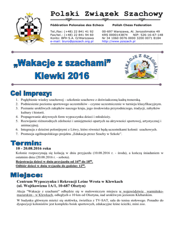 Polski Związek Szachowy Fédération Polonaise des Echecs Polish Chess Federation Tel./fax: (+48) 22 841 41 92 00-697 Warszawa, Al. Jerozolimskie 49 Fax/tel.: (+48) 22 841 94 60 KRS 0000143874 NIP: 526-16-67-148 Konto: BPH S.A. O/Warszawa Nr 34 1060 0076 0000 3200 0071 8184 e-mail: [email protected] http://www.pzszach.pl *************************************************************************************************** 1. Pogłębienie wiedzy szachowej - szkolenie szachowe z doświadczoną kadrą trenerską. 2. Podniesienie poziomu sportowego uczestników - czynne uczestniczenie w turnieju klasyfikacyjnym. 3. Poznanie urokliwych zakątków naszego kraju, jego środowiska przyrodniczego, tradycji, zabytków kultury i historii. 4. Propagowanie aktywnych form wypoczynku dzieci i młodzieży. 5. Rozwijanie różnorodnych zdolności i umiejętności opartych na aktywności sportowej, artystycznej i animacyjnej. 6. Integracja z dziećmi polonijnymi z Litwy, które również będą uczestnikami kolonii szachowych. 7. Promocja ogólnopolskiego projektu „Edukacja przez Szachy w Szkole”. 10 - 20.08.2016 roku Kolonie rozpoczynają się kolacją w dniu przyjazdu (10.08.2016 r. - środa), a kończą śniadaniem w ostatnim dniu (20.08.2016 r. - sobota). Rejestracja dzieci w dniu przyjazdu od 1600 do 1800. Odbiór dzieci w dniu wyjazdu do godziny 1200. Centrum Wypoczynku i Rekreacji Leśne Wrota w Klewkach (ul. Wojtkowizna 1A/1, 10-687 Olsztyn) Akcja "Wakacje z szachami" odbędzie się w malowniczym miejscu w województwie warmińskomazurskim - w Klewkach, odległych o 10 km od Olsztyna, nad urokliwym jeziorem Klebarskim. W budynku głównym mieści się stołówka, świetlica z TV-SAT, sala do tenisa stołowego. Ponadto do dyspozycji kolonistów jest kompleks boisk sportowych, edukacyjne leśne ścieżki, mini zoo. 1. Miejsca dotowane: a) Ilość miejsc dotowanych - 80 dzieci - limit miejsc na województwo: 5 dzieci (w przypadku większej ilości chętnych tworzona jest lista rezerwowa). b) Dotację mogą otrzymać dzieci w wieku od 9 do 14 lat (roczniki 2007 - 2002), posiadające maksimum kategorię szachową II+. UWAGA – warunki do otrzymania dotacji: Uczestnik kolonii musi posiadać licencję zawodniczą Polskiego Związku Szachowego. W ramach miejsc dotowanych nie mogą brać udziału członkowie kadr wojewódzkich w dyscyplinie sportowej - szachy. Reprezentowany przez uczestnika klub szachowy nie może zalegać z opłatami składek członkowskich za rok 2015 na rzecz PZSzach. 2. Miejsca pełnopłatne: a) Dzieci w wieku od 7 do 15 lat (roczniki 2009 – 2001), w tym dzieci z projektu „Edukacja przez Szachy w Szkole” oraz „Wars i Sawa grają w Szachy”. 1. Odpłatność z uwzględnieniem dotacji jednego uczestnika wynosi 600 zł. 2. Uczestniczenie w akcji kolonijnej za pełną odpłatnością - koszt 1100 zł. 3. Osoby towarzyszące zainteresowane pobytem w Klewkach - koszt 700 zł za jedną osobę (70 zł/dzień - zakwaterowanie + wyżywienie) w Centrum. Cena kolonii zawiera: zakwaterowanie w pokojach 2 – 4-osobowych z pełnym węzłem sanitarnym wyżywienie - 3 posiłki dziennie + podwieczorek opiekę pedagogiczną, instruktorską, medyczną oraz ratownika wodnego ubezpieczenie NNW (pobyt) szkolenie szachowe - przydział do grup zgodnie z posiadanymi umiejętnościami i wiekiem dziecka rywalizację w turnieju klasyfikacyjnym całodniową wycieczkę dodatkowe atrakcje: wizyta w mini zoo – opieka nad zwierzętami, zajęcia sportowe na świeżym powietrzu: Wielka Kolonijna Olimpiada Sportowa, wyścig w 3-osobowych spodniach, przeciąganie liny, itp. pływanie kajakami (wyłącznie dla starszej grupy), zabawa w kuli wodnej (dla młodszych grup) Dojazd i powrót: we własnym zakresie Zgłoszenia na miejsca dotowane prosimy kierować wyłącznie do wojewódzkich związków szachowych. Zgłoszenia zainteresowanych udziałem w koloniach za pełną odpłatnością prosimy kierować bezpośrednio na adres: [email protected] Zgłoszenie musi zawierać: imię i nazwisko dziecka, rok urodzenia, przynależność klubową, kategorię szachową oraz telefon kontaktowy Zgłoszenia wojewódzkie (miejsca dotowane + rezerwa) do 20 maja 2016 r. Przydzielenie miejsc dotowanych do 31 maja 2016 r. Opłatę za pobyt należy uiścić na konto PZSzach 34 1060 0076 0000 3200 0071 8184 z dopiskiem: „Wakacje z szachami - imię i nazwisko uczestnika” - do 10 czerwca 2016 r. Kartę kolonijną każdego uczestnika (załącznik nr 2 - wydrukowany i podpisany przez prawnych opiekunów dziecka) należy nadesłać w terminie do 10 czerwca 2016 r. na adres: Kamila Kałużna ul. Włoska 11/8 30- 638 Kraków Lista przyjętych na kolonie „Wakacje z szachami” ukaże się na stronie internetowej PZSzach oraz na www.wakacjezszachami.com.pl do 10 lipca 2016 r. Niedopełnienie w terminie któregokolwiek z wyżej wymienionych wymogów oznaczać będzie rezygnację z przydzielonego miejsca. Serdecznie zapraszamy Kamila Kałużna- dyrektor projektu Telefon: 693-046-440 e- mail: [email protected] Krzysztof Góra- koordynator PZSzach Telefon: 786-165-187 e- mail: [email protected]