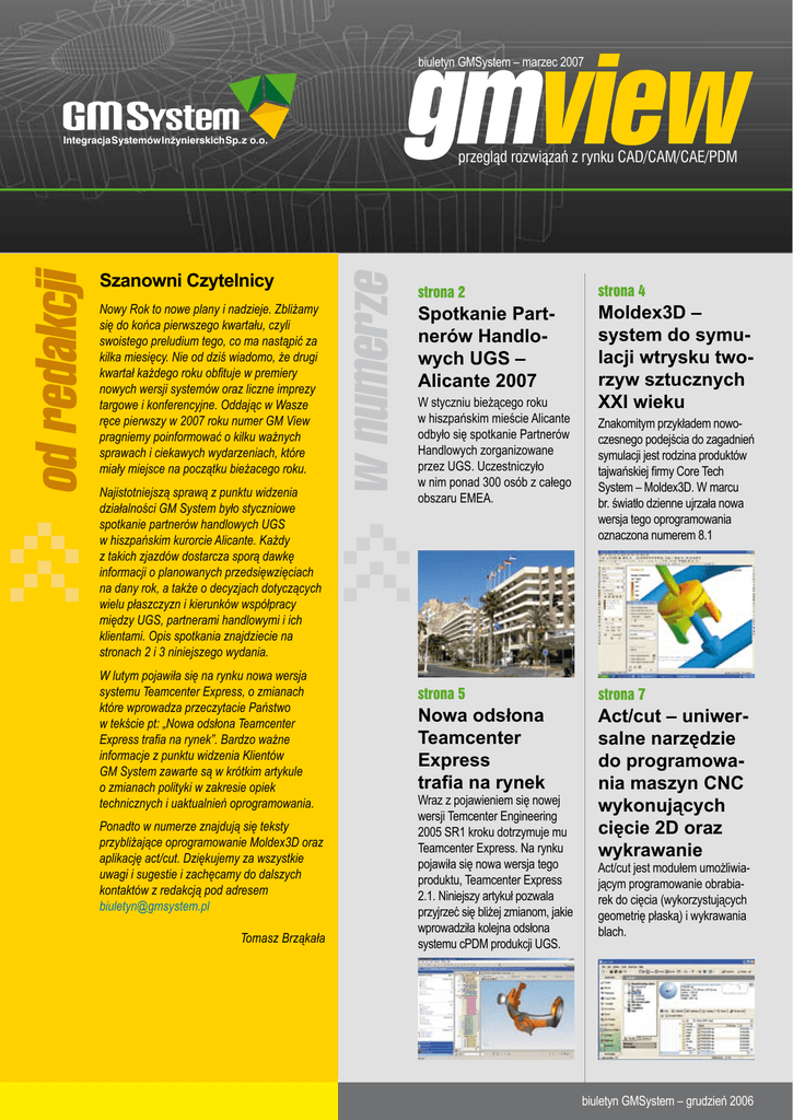 marzec 2007 gmview biuletyn GMSystem – marzec 2007 Integracja Systemów Inżynierskich Sp. z o.o. Szanowni Czytelnicy Nowy Rok to nowe plany i nadzieje. Zbliżamy się do końca pierwszego kwartału, czyli swoistego preludium tego, co ma nastąpić za kilka miesięcy. Nie od dziś wiadomo, że drugi kwartał każdego roku obfituje w premiery nowych wersji systemów oraz liczne imprezy targowe i konferencyjne. Oddając w Wasze ręce pierwszy w 2007 roku numer GM View pragniemy poinformować o kilku ważnych sprawach i ciekawych wydarzeniach, które miały miejsce na początku bieżacego roku. Najistotniejszą sprawą z punktu widzenia działalności GM System było styczniowe spotkanie partnerów handlowych UGS w hiszpańskim kurorcie Alicante. Każdy z takich zjazdów dostarcza sporą dawkę informacji o planowanych przedsięwzięciach na dany rok, a także o decyzjach dotyczących wielu płaszczyzn i kierunków współpracy między UGS, partnerami handlowymi i ich klientami. Opis spotkania znajdziecie na stronach 2 i 3 niniejszego wydania. W lutym pojawiła się na rynku nowa wersja systemu Teamcenter Express, o zmianach które wprowadza przeczytacie Państwo w tekście pt: „Nowa odsłona Teamcenter Express trafia na rynek”. Bardzo ważne informacje z punktu widzenia Klientów GM System zawarte są w krótkim artykule o zmianach polityki w zakresie opiek technicznych i uaktualnień oprogramowania. Ponadto w numerze znajdują się teksty przybliżające oprogramowanie Moldex3D oraz aplikację act/cut. Dziękujemy za wszystkie uwagi i sugestie i zachęcamy do dalszych kontaktów z redakcją pod adresem [email protected] Tomasz Brząkała w numerze od redakcji przegląd rozwiązań z rynku CAD/CAM/CAE/PDM strona 2 Spotkanie Partnerów Handlowych UGS – Alicante 2007 W styczniu bieżącego roku w hiszpańskim mieście Alicante odbyło się spotkanie Partnerów Handlowych zorganizowane przez UGS. Uczestniczyło w nim ponad 300 osób z całego obszaru EMEA. strona 5 Nowa odsłona Teamcenter Express trafia na rynek Wraz z pojawieniem się nowej wersji Temcenter Engineering 2005 SR1 kroku dotrzymuje mu Teamcenter Express. Na rynku pojawiła się nowa wersja tego produktu, Teamcenter Express 2.1. Niniejszy artykuł pozwala przyjrzeć się bliżej zmianom, jakie wprowadziła kolejna odsłona systemu cPDM produkcji UGS. strona 4 Moldex3D – system do symulacji wtrysku tworzyw sztucznych XXI wieku Znakomitym przykładem nowoczesnego podejścia do zagadnień symulacji jest rodzina produktów tajwańskiej firmy Core Tech System – Moldex3D. W marcu br. światło dzienne ujrzała nowa wersja tego oprogramowania oznaczona numerem 8.1 strona 7 Act/cut – uniwersalne narzędzie do programowania maszyn CNC wykonujących cięcie 2D oraz wykrawanie Act/cut jest modułem umożliwiającym programowanie obrabiarek do cięcia (wykorzystujących geometrię płaską) i wykrawania blach. biuletyn GMSystem – grudzień 2006 marzec 2007 Spotkanie Partnerów Handlowych UGS – Alicante 2007 W 2005 roku UGS wprowadził nową koncepcję sprzedaży części swoich produktów pod nazwą Velocity Series. Równocześnie firma poinformowała o zmianie zasad współpracy ze swoimi Partnerami Handlowymi. Zasady te zakładają ściślejszą niż poprzednio koordynację działań, czego wyrazem stało się między innymi organizowanie przez UGS dorocznych spotkań dla Partnerów. W 2006 roku spotkanie takie odbyło się w Wiedniu, kolejne miało miejsce w styczniu bieżącego roku w hiszpańskim mieście Alicante. Uczestniczyło w nim ponad 300 osób z całego obszaru EMEA (Europa, Bliski Wschód i Afryka), zaś sponsorami konferencji byli: Microsoft, HP, Intel, AMD oraz 3Dconnexion. Spotkanie trwało trzy dni; uczestnicy mieli w tym czasie możliwość przeprowadzenia dyskusji z przedstawicielami Zarządu firmy UGS, wysłuchania szeregu prezentacji dotyczących zarówno obecnej sytuacji firmy, jak i dalszych planów jej rozwoju oraz zapoznania się z najnowszymi wersjami produktów UGS. Ważną częścią spotkania były szkolenia i wykłady przeprowadzone przez zaproszonych gości, a także wystąpienia niektórych Partnerów Handlowych UGS, którzy podzielili się swoimi doświadczeniami w sprzedaży. Oczywiście, nie zabrakło czasu na wieczór integracyjny oraz na wręczenie nagród wyróżniającym się Partnerom. Rok 2006 był dla UGS rokiem bardzo udanym – świadczy o tym wzrost wyników sprzedaży produktów z grupy Velocity w porównaniu z poprzednimi okresami. W stosunku do roku 2005 wzrost ten wyniósł 34%; jeszcze korzystniej wypada porównanie czwartego kwartału roku 2006 z Q4 w roku poprzedzającym – w tym przypadku wzrost wynosi 65%. W sukcesie tym duży – i wciąż rosnący – udział mają Partnerzy Handlowi UGS. Wzrost sprzedaży produktów Velocity za pośrednictwem Partnerów wyniósł odpowiednio: 21% (2006 w stosunku do 2005) i 38% (Q4 2006 w stosunku do Q4 2005). Warto przy tej okazji podkreślić, że firma GM System jest jednym z wyróżniających się Partnerów Handlowych UGS. Podczas spotkania w Alicante odebraliśmy trzy nagrody: dla najlepszego partnera UGS w Polsce w 2006 r. dla najlepszego handlowca w Polsce w 2006 r. dla najlepszego handlowca na obszarze EMEA w czwartym kwartale 2006 r. Sukces UGS nie jest działem przypadku – to wynik konsekwentnie realizowanej polityki rozwoju firmy. W czasie konferencji pokrótce przypomniano poszczególne etapy najnowszej historii UGS: od przejęcia w roku 2001 firmy SDRC (producenta systemu I-DEAS), poprzez usamodzielnienie i wydzielenie ze struktur EDS w roku 2004, aż po opracowanie i wdrożenie nowej linii produktów (Velocity) i stworzenie nowego systemu współpracy z Partnerami Handlowymi. Efektami tej polityki są wymierne sukcesy, których przykładami mogą być: 14 kolejnych kwartałów wzrostu sprzedaży zwiększenie liczby zainstalowanych licencji produktów UGS z 3 mln do 4,4 mln zwiększenie liczby klientów z 42 tys. do