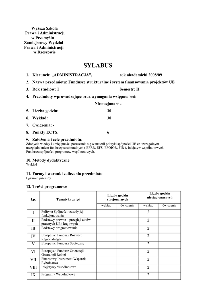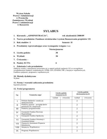 WyŜsza Szkoła Prawa i Administracji w Przemyślu Zamiejscowy Wydział Prawa i Administracji w Rzeszowie SYLABUS 1. Kierunek: „ADMINISTRACJA”, rok akademicki 2008/09 2. Nazwa przedmiotu: Fundusze strukturalne i system finansowania projektów UE 3. Rok studiów: I Semestr: II 4. Przedmioty wprowadzające oraz wymagania wstępne: brak Niestacjonarne 5. Liczba godzin: 30 6. Wykład: 30 7. Ćwiczenia: 8. Punkty ECTS: 6 9. ZałoŜenia i cele przedmiotu: Zdobycie wiedzy i umiejętności poruszania się w materii polityki spójności UE ze szczególnym uwzględnieniem funduszy strukturalnych ( EFRR, EFS, EFOIGR, FIR ), Inicjatyw wspólnotowych, Funduszu spójności, programów wspólnotowych. 10. Metody dydaktyczne Wykład 11. Formy i warunki zaliczenia przedmiotu Egzamin pisemny 12. Treści programowe Lp. Tematyka zajęć Liczba godzin stacjonarnych wykład I II III IV V VI VII VIII IX ćwiczenia Liczba godzin niestacjonarnych wykład Polityka Spójności- zasady jej funkcjonowania Podstawy prawne – przegląd aktów prawnych UE i krajowych Podstawy programowania 2 Europejski Fundusz Rozwoju Regionalnego Europejski Fundusz Społeczny 2 Europejski Fundusz Orientacji i Gwarancji Rolnej Finansowy Instrument Wsparcia Rybołóstwa Inicjatywy Wspólnotowe 2 2 Programy Wspólnotowe 2 2 2 2 2 ćwiczenia X XI XII XIII XIV Zarządzanie programami- system instytucjonalny, analiza dokumentów celem opracowania projektów Analiza porównawcza okres programowania 2004-2006 i 20072013 Sposób opracowania, realizacji i rozliczania projektów współfinansowanych ze środków UE Pojecie kosztów kwalifikowanych 4 Podsumowanie zajęć i przygotowanie do egzaminu 1 2 3 2 13. Literatura podstawowa Rozporządzenie Rady (WE) nr 1260/1999 z dnia 21 czerwca 1999 r. wprowadzające ogólne przepisy dotyczące Funduszy strukturalnych Rozporządzenie Parlamentu Europejskiego i Rady (WE) nr 1783/1999 z 12 lipca 1999 r. w sprawie Europejskiego Funduszu Rozwoju Regionalnego Rozporządzenie Parlamentu Europejskiego i Rady (WE) nr 1784/1999 z 12 lipca 1999 r. w sprawie Europejskiego Funduszu Społecznego Rozporządzenie Rady (WE) NR 1257/1999 z dnia 17 maja 1999 r. w sprawie wsparcia rozwoju obszarów wiejskich ze środków Europejskiego Funduszu Orientacji i Gwarancji Rolnej (EFOGR) oraz zmieniające i uchylające niektóre rozporządzenia Rozporządzenie Rady (Ec) Nr 1263/99 z dnia 21 czerwca 1999 w sprawie Finansowego Instrumentu Sterowania Rybołówstwem Rozporządzenie Komisji (WE) nr 448/2004 z dnia 10 marca 2004 r. zmieniające rozporządzenie (WE) nr 1685/2000 ustanawiające szczegółowe zasady wprowadzenia rozporządzenia Rady (WE) nr 1260/1999 w sprawie kwalifikowania wydatków związanych z projektami współfinansowanymi z Funduszy strukturalnych i uchylające rozporządzenie (WE) nr 1145/2003 Decyzja Komisji nr 3424/2006 w sprawie wytycznych dotyczących zamknięcia pomocy(2000-2006) finansowanej z Funduszy strukturalnych Ustawa z dnia 20 kwietnia 2004 r.o Narodowym Planie Rozwoju - wersja robocza uwzględniająca (wytłuszczonym drukiem) zmiany wprowadzone ustawą z dnia 13 lipca 2006 r. o zmianie ustawy o Narodowym Planie Rozwoju oraz niektórych innych ustaw Rozporządzenie Rady (WE) nr 1083/2006 z dnia 11 lipca 2006 r. ustanawiające przepisy ogólne dotyczące Europejskiego Funduszu Rozwoju Regionalnego, Europejskiego Funduszu Społecznego oraz Funduszu Spójności i uchylające rozporządzenie (WE) nr 1260/1999 Rozporządzenie (WE) nr 1080/2006 Parlamentu Europejskiego i Rady z dnia 5 lipca 2006 r. w sprawie Europejskiego Funduszu Rozwoju Regionalnego i uchylające rozporządzenie (WE) nr 1783/1999 Rozporządzenie (WE) nr 1081/2006 Parlamentu Europejskiego i Rady a dnia 5 lipca 2006 r. w sprawie Europejskiego Funduszu Społecznego i uchylające rozporządzenie (WE) nr 1784/1999 Rozporządzenie Rady (WE) nr 1084/2006 z dnia 11 lipca 2006 r. ustanawiające Fundusz Spójności i uchylające rozporządzenie (WE) 1164/94 Rozporządzenie (WE) nr 1082/2006 Parlamentu Europejskiego i Rady z dnia 5 lipca 2006 r. w sprawie europejskiego ugrupowania współpracy terytorialnej (EUWT) PROGRAMY OPERACYJNE 2004 – 2006 Zintegrowany Program Operacyjny Rozwoju Regionalnego ,Sektorowy Program Operacyjny Rozwój Zasobów Ludzkich Inicjatywa Wspólnotowa EQUAL Sektorowy Program Operacyjny Wzrost Konkurencyjności Przedsiębiorstw Sektorowy Program Operacyjny Transport Sektorowy Program Operacyjny Pomoc Techniczna Inicjatywa Wspólnotowa INTERREG Sektorowy Program Operacyjny Restrukturyzacja i Modernizacja Sektora śywnościowego oraz Rozwój Obszarów Wiejskich Sektorowy Program Operacyjny Rybołówstwo i Przetwórstwo Ryb PROGRAMY OPERACYJNE 2007 - 2013 Program Operacyjny Infrastruktura i Środowisko Program Operacyjny Kapitał Ludzki Program Operacyjny Innowacyjna Gospodarka Program Operacyjny Rozwój Polski Wschodniej Europejska Współpraca Terytorialna Program Rozwoju Obszarów Wiejskich 14. Literatura uzupełniająca Biuletyn informacyjny "Fundusze strukturalne w Polsce" Słowniczek pojęć na temat funduszy strukturalnych dostępny na stronie www.funduszestrukturalne.gov.pl Wytyczne Unii Europejskiej Wytyczne Ministra Rozwoju Regionalnego Komentarze do aktów prawnych Wspólnot Europejskich w zakresie funduszy strukturalnych i Funduszu Spójności na lata 2007-2013 15. Nazwisko osoby prowadzącej zajęcia: - wykład: mgr Teresa Kubas - Hul
