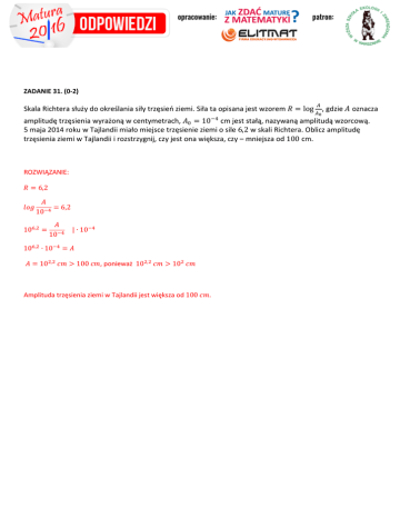 ZADANIE 31. (0-2) Skala Richtera służy do określania siły trzęsień ziemi. Siła ta opisana jest wzorem , gdzie oznacza amplitudę trzęsienia wyrażoną w centymetrach, cm jest stałą, nazywaną amplitudą wzorcową. 5 maja 2014 roku w Tajlandii miało miejsce trzęsienie ziemi o sile w skali Richtera. Oblicz amplitudę trzęsienia ziemi w Tajlandii i rozstrzygnij, czy jest ona większa, czy – mniejsza od cm. ROZWIĄZANIE: , ponieważ Amplituda trzęsienia ziemi w Tajlandii jest większa od .