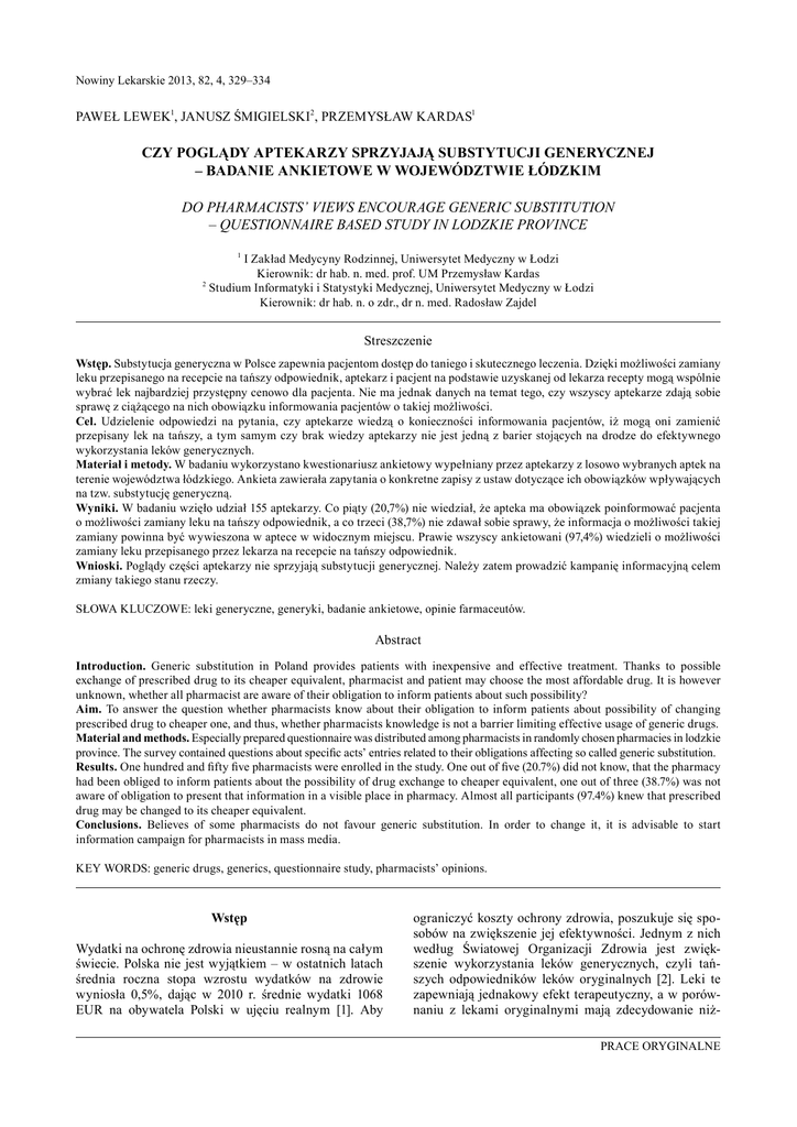 Nowiny Lekarskie 2013, 82, 4, 329–334 PAWEŁ LEWEK1, JANUSZ ŚMIGIELSKI2, PRZEMYSŁAW KARDAS1 CZY POGLĄDY APTEKARZY SPRZYJAJĄ SUBSTYTUCJI GENERYCZNEJ – BADANIE ANKIETOWE W WOJEWÓDZTWIE ŁÓDZKIM DO PHARMACISTS’ VIEWS ENCOURAGE GENERIC SUBSTITUTION – QUESTIONNAIRE BASED STUDY IN LODZKIE PROVINCE 1 I Zakład Medycyny Rodzinnej, Uniwersytet Medyczny w Łodzi Kierownik: dr hab. n. med. prof. UM Przemysław Kardas 2 Studium Informatyki i Statystyki Medycznej, Uniwersytet Medyczny w Łodzi Kierownik: dr hab. n. o zdr., dr n. med. Radosław Zajdel Streszczenie Wstęp. Substytucja generyczna w Polsce zapewnia pacjentom dostęp do taniego i skutecznego leczenia. Dzięki możliwości zamiany leku przepisanego na recepcie na tańszy odpowiednik, aptekarz i pacjent na podstawie uzyskanej od lekarza recepty mogą wspólnie wybrać lek najbardziej przystępny cenowo dla pacjenta. Nie ma jednak danych na temat tego, czy wszyscy aptekarze zdają sobie sprawę z ciążącego na nich obowiązku informowania pacjentów o takiej możliwości. Cel. Udzielenie odpowiedzi na pytania, czy aptekarze wiedzą o konieczności informowania pacjentów, iż mogą oni zamienić przepisany lek na tańszy, a tym samym czy brak wiedzy aptekarzy nie jest jedną z barier stojących na drodze do efektywnego wykorzystania leków generycznych. Materiał i metody. W badaniu wykorzystano kwestionariusz ankietowy wypełniany przez aptekarzy z losowo wybranych aptek na terenie województwa łódzkiego. Ankieta zawierała zapytania o konkretne zapisy z ustaw dotyczące ich obowiązków wpływających na tzw. substytucję generyczną. Wyniki. W badaniu wzięło udział 155 aptekarzy. Co piąty (20,7%) nie wiedział, że apteka ma obowiązek poinformować pacjenta o możliwości zamiany leku na tańszy odpowiednik, a co trzeci (38,7%) nie zdawał sobie sprawy, że informacja o możliwości takiej zamiany powinna być wywieszona w aptece w widocznym miejscu. Prawie wszyscy ankietowani (97,4%) wiedzieli o możliwości zamiany leku przepisanego przez lekarza na recepcie na tańszy odpowiednik. Wnioski. Poglądy części aptekarzy nie sprzyjają substytucji generycznej. Należy zatem prowadzić kampanię informacyjną celem zmiany takiego stanu rzeczy. SŁOWA KLUCZOWE: leki generyczne, generyki, badanie ankietowe, opinie farmaceutów. Abstract Introduction. Generic substitution in Poland provides patients with inexpensive and effective treatment. Thanks to possible exchange of prescribed drug to its cheaper equivalent, pharmacist and patient may choose the most affordable drug. It is however unknown, whether all pharmacist are aware of their obligation to inform patients about such possibility? Aim. To answer the question whether pharmacists know about their obligation to inform patients about possibility of changing prescribed drug to cheaper one, and thus, whether pharmacists knowledge is not a barrier limiting effective usage of generic drugs. Material and methods. Especially prepared questionnaire was distributed among pharmacists in randomly chosen pharmacies in lodzkie province. The survey contained questions about specific acts’ entries related to their obligations affecting so called generic substitution. Results. One hundred and fifty five pharmacists were enrolled in the study. One out of five (20.7%) did not know, that the pharmacy had been obliged to inform patients about the possibility of drug exchange to cheaper equivalent, one out of three (38.7%) was not aware of obligation to present that information in a visible place in pharmacy. Almost all participants (97.4%) knew that prescribed drug may be changed to its cheaper equivalent. Conclusions. Believes of some pharmacists do not favour generic substitution. In order to change it, it is advisable to start information campaign for pharmacists in mass media. KEY WORDS: generic drugs, generics, questionnaire study, pharmacists’ opinions. Wstęp Wydatki na ochronę zdrowia nieustannie rosną na całym świecie. Polska nie jest wyjątkiem – w ostatnich latach średnia roczna stopa wzrostu wydatków na zdrowie wyniosła 0,5%, dając w 2010 r. średnie wydatki 1068 EUR na obywatela Polski w ujęciu realnym [1]. Aby ograniczyć koszty ochrony zdrowia, poszukuje się sposobów na zwiększenie jej efektywności. Jednym z nich według Światowej Organizacji Zdrowia jest zwiększenie wykorzystania leków generycznych, czyli tańszych odpowiedników leków oryginalnych [2]. Leki te zapewniają jednakowy efekt terapeutyczny, a w porównaniu z lekami oryginalnymi mają zdecydowanie niżPRACE ORYGINALNE 330 Paweł Lewek, Janusz Śmigielski, Przemysław Kardas sze ceny [3]. Barierą do zastosowania leków generycznych w praktyce może być brak informacji o możliwości wykupienia tańszego odpowiednika. O tym, jaki lek ostatecznie wykupi pacjent, oryginalny czy generyczny, decydują trzy osoby: lekarz przepisujący medykament, farmaceuta wydający go w aptece i sam kupujący. O ile lekarz podejmuje decyzję, jaką substancję terapeutyczną otrzyma pacjent, o tyle w kwestii konkretnego preparatu wiele do powiedzenia mają aptekarz i pacjent. Dzieje się tak za sprawą dozwolonej przez polskie prawo substytucji generycznej, czyli możliwości zamiany preparatu wypisanego na recepcie przez lekarza na tańszy odpowiednik tego leku. W kraju, w którym 12% obywateli deklaruje zaprzestanie leczenia z powodów finansowych, a 21% w ogóle nie wykupuje przepisanych leków, możliwość zamiany preparatu na tańszy wydaje się niezbędna [4]. Jednym z elementów właściwie działającej substytucji generycznej jest wiedza aptekarzy o obowiązku informowania pacjentów o możliwej zamianie leku. W niniejszej pracy postanowiliśmy zadać aptekarzom trzy pytania koncentrujące się na ich znajomości przepisów prawnych dotyczących substytucji generycznej. Chcieliśmy sprawdzić, czy wiedza aptekarzy może być barierą na drodze do efektywnej zamiany leku na tańszy odpowiednik w 
