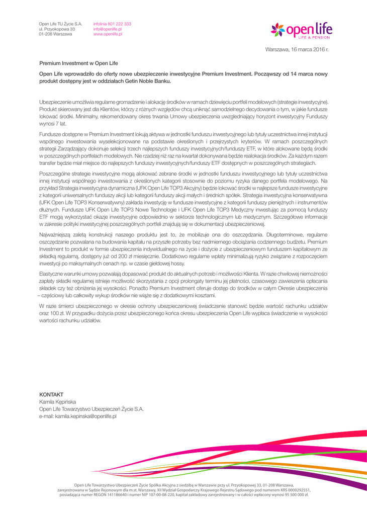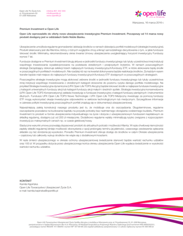 Open Life TU Życie S.A. ul. Przyokopowa 33 01-208 Warszawa infolinia 801 222 333 [email protected] www.openlife.pl Warszawa, 16 marca 2016 r. Premium Investment w Open Life Open Life wprowadziło do oferty nowe ubezpieczenie inwestycyjne Premium Investment. Począwszy od 14 marca nowy produkt dostępny jest w oddziałach Getin Noble Banku. Ubezpieczenie umożliwia regularne gromadzenie i alokację środków w ramach dziewięciu portfeli modelowych (strategie inwestycyjne). Produkt skierowany jest dla Klientów, którzy z różnych względów chcą uniknąć samodzielnego decydowania o tym, w jakie fundusze lokować środki. Minimalny, rekomendowany okres trwania Umowy ubezpieczenia uwzgledniający horyzont inwestycyjny Funduszy wynosi 7 lat. Fundusze dostępne w Premium Investment lokują aktywa w jednostki funduszu inwestycyjnego lub tytuły uczestnictwa innej instytucji wspólnego inwestowania wyselekcjonowane na podstawie określonych i przejrzystych kryteriów. W ramach poszczególnych strategii Zarządzający dokonuje selekcji trzech najlepszych funduszy inwestycyjnych/funduszy ETF, w które alokowane będą środki w poszczególnych portfelach modelowych. Nie rzadziej niż raz na kwartał dokonywana będzie realokacja środków. Za każdym razem transfer będzie miał miejsce do najlepszych funduszy inwestycyjnych/funduszy ETF dostępnych w poszczególnych strategiach. Poszczególne strategie inwestycyjne mogą alokować zebrane środki w jednostki funduszu inwestycyjnego lub tytuły uczestnictwa innej instytucji wspólnego inwestowania z określonych kategorii stosownie do poziomu ryzyka danego portfela modelowego. Na przykład Strategia inwestycyjna dynamiczna (UFK Open Life TOP3 Akcyjny) będzie lokować środki w najlepsze fundusze inwestycyjne z kategorii uniwersalnych funduszy akcji lub kategorii funduszy akcji małych i średnich spółek. Strategia inwestycyjna konserwatywna (UFK Open Life TOP3 Konserwatywny) zakłada inwestycję w fundusze inwestycyjne z kategorii funduszy pieniężnych i instrumentów dłużnych. Fundusze UFK Open Life TOP3 Nowe Technologie i UFK Open Life TOP3 Medyczny inwestując za pomocą funduszy ETF mogą wykorzystać okazje inwestycyjne odpowiednio w sektorze technologicznym lub medycznym. Szczegółowe informacje w zakresie polityki inwestycyjnej poszczególnych portfeli znajdują się w dokumentacji ubezpieczeniowej. Najważniejszą zaletą konstrukcji naszego produktu jest to, że mobilizuje ona do oszczędzania. Długoterminowe, regularne oszczędzanie pozwalana na budowania kapitału na przyszłe potrzeby bez nadmiernego obciążania codziennego budżetu. Premium Investment to produkt w formie ubezpieczenia indywidualnego na życie i dożycie z ubezpieczeniowym funduszem kapitałowym ze składką regularną, dostępny już od 200 zł miesięcznie. Dodatkowo regularne wpłaty minimalizują ryzyko związane z rozpoczęciem inwestycji po maksymalnych cenach np. w czasie giełdowej hossy. Elastyczne warunki umowy pozwalają dopasować produkt do aktualnych potrzeb i możliwości Klienta. W razie chwilowej niemożności zapłaty składki regularnej istnieje możliwość skorzystania z opcji prolongaty terminu jej płatności, czasowego zawieszenia opłacania składek czy też obniżenia jej wysokości. Ponadto Premium Investment oferuje dostęp do środków w całym Okresie ubezpieczenia – częściowy lub całkowity wykup środków nie wiąże się z dodatkowymi kosztami. W razie śmierci ubezpieczonego w okresie ochrony ubezpieczeniowej świadczenie stanowić będzie wartość rachunku udziałów oraz 100 zł. W przypadku dożycia przez ubezpieczonego końca okresu ubezpieczenia Open Life wypłaca świadczenie w wysokości wartości rachunku udziałów. KONTAKT Kamila Kępińska Open Life Towarzystwo Ubezpieczeń Życie S.A. e-mail: [email protected] Open Life Towarzystwo Ubezpieczeń Życie Spółka Akcyjna z siedzibą w Warszawie przy ul. Przyokopowej 33, 01-208 Warszawa, zarejestrowana w Sądzie Rejonowym dla m.st. Warszawy, XII Wydział Gospodarczy Krajowego Rejestru Sądowego pod numerem KRS 0000292551, posiadająca numer REGON 141186640 i numer NIP 107-00-08-220, kapitał zakładowy zarejestrowany i w całości wpłacony wynosi 95 500 000 zł.