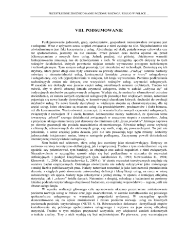 PRZESTRZENNE ZRÓŻNICOWANIE POZIOMU ROZWOJU USŁUG W POLSCE … VIII. PODSUMOWANIE Funkcjonowanie jednostek, grup, społeczeństw, gospodarek nierozerwalnie związane jest z usługami. Wraz z upływem czasu stopień związania z nimi zyskuje na sile. Niejednokrotnie nie uświadamianym jest fakt korzystania z usług. Abstrahując od skali, pojedynczego człowieka czy też społeczeństwa, jesteśmy na nie skazani. Przez pewien czas można opierać się przed (s)korzystaniem z nowych form usług. Jednak prędzej, niż później, obiektywne warunki funkcjonowania zmuszają nas do (s)korzystania z nich. W szczególny sposób dotyczy to tych rodzajów działalności, których powstanie niejako zostało wymuszone postępem technicznym i technologicznym. Tym samym usługi przestają być niezależne od technologii. Zmieniają się ich atrybuty, które przez długi czas były uznawane za prawdy absolutne. „Padają” ostatnie bastiony mówiące o niematerialności usług, konieczności kontaktu „twarzą w twarz” usługodawcy i usługobiorcy, czy ich (s)pożytkowania w miejscu, lub kraju wytworzenia. Pomimo podkreślania zachodzących zmian nie dotyczą one wszystkich rodzajów usług, czynności usługowych. W zasadzie nie dotknęły one jeszcze części usług określanych mianem osobistych, Trudno też mówić, aby w chwili obecnej istniała czynność usługowa, która w całości „odrywa się” od tradycyjnych atrybutów przypisywanych usługom. Wydaje się, że można by sformułować ostrożne stwierdzenie, że natura samych czynności usługowych pozostaje bez większych zmian, natomiast pojawiają się nowe kanały dystrybucji, w konsekwencji charakteru których, dochodzi do ewolucji atrybutów usług. Te nowe kanały dystrybucji w większym stopniu są charakterystyczne, dla tej części usług, które określane są mianem usług dla przedsiębiorstw, producentów i (lub) biznesu, niż dla konsumentów. Warto również zaznaczyć, że wzrasta liczba nowych czynności usługowych, związanych z rozwojem IT i siecią Internet. Jednocześnie należy nadmienić, że zjawisku temu towarzyszy „ubytek” szeregu działalności związanych w znacznym stopniu z rzemiosłem. Jedną z przyczyn takiego stanu rzeczy jest skrócony do minimum cykl „życia produktu”, którego naprawa po okresie gwarancji nie posiada uzasadnienia ekonomicznego. Również usługi coraz szybciej z elitarnych, adresowanych do nielicznych grup, czy osób, stają się powszechnymi. To już nie pokolenia, a coraz częściej jedna dekada, jeśli nie lata powodują tego typu zmiany. Jesteśmy jednocześnie inicjatorami zmian, którym następnie podlegamy. Zaczynamy powoli doświadczać interaktywnej rzeczywistości usługowej. Stan badań nad sektorem, sferą usług jest oceniany jako niezadowalający. Dotyczy on zarówno warstwy teoretyczno–definicyjnej, jak i empirycznej. Trudno z tym stwierdzeniem się nie zgodzić, czy polemizować, tym bardziej, że obejmuje ono całość zagadnień z nimi związanych. Niezadowolenie w szczególny sposób zdaje się być podkreślane w stosunku do rozważań definicyjnych i podejść klasyfikacyjnych (por. Jakubowicz E, 1993; Nowosielska E., 1994; Kłosowski F., 2006 a, Dzieciuchowicz J., 2009 a). W cieniu rozważań teoretycznych znajduje się warstwa badań empirycznych. Ostatniego stwierdzenia nie należy odczytywać jako mówiącego o małej liczbie publikowanych prac. Należy natomiast rozumieć je jako konieczność przeniesienia akcentu, z ciągłych prób stworzenia uniwersalnej definicji i klasyfikacji usług, na rzecz w wiarę całościowego ich ujęcia. Należy tego dokonywać z jednej strony, w oparciu o istniejącą oficjalną statystykę, jak i „własne” źródła danych. Natomiast z drugiej, schodząc z badaniami na poziomy lokalne podziału terytorialnego obejmować badaniem, co najmniej województwo – region, jeśli nie obszar całego kraju. W wyniku realizacji głównego celu opracowania ukazano przestrzenne zróżnicowanie poziomu rozwoju usług w Polsce oraz jego uwarunkowań, w okresie kształtowania się polskiego społeczeństwa usługowego w warunkach gospodarki rynkowej. W szczególny sposób skoncentrowano się na opisie zróżnicowań i zmian poziomu rozwoju usług na lokalnych poziomach podziału terytorialnego (NUTS 4, 5). Równocześnie dokonano identyfikacji etapów kształtowania się polskiego społeczeństwa usługowego i wpływu na jego ocenę oficjalnej statystyki. Trudno w tym miejscu przytaczać wszystkie, czy większość ustaleń dokonanych w trakcie analizy. Trzy z nich wydają się być najistotniejsze. Po pierwsze, przy wzrastającym 252 Dariusz Ilnicki systematycznie znaczeniu sektora III, w całym okresie gospodarki rynkowej, struktura jego zróżnicowania przestrzennego nie uległa zasadniczej zmianie. Po drugie – tym nie mniej widoczny jest wzrost zróżnicowań poziomu rozwoju usług w skali kraju oraz poszczególnych jego regionów. Są one konsekwencją selektywnego rozwoju usług. Wysoki poziom rozwoju usług i dynamika zmian charakterystyczna jest dla dużych miast oraz ich bezpośredniego otoczenia. W dalszym ciągu widoczna jest nierównowaga, w poziomie rozwoju i zróżnicowaniu sektora usług, przy zestawieniu, usługowo lepiej rozwiniętej, północnej, zachodniej i południowej części Polski z Polską centralna i wschodnią. Zaznaczyć przy tym należy, że w całym analizowanym okresie, następował wzrost znaczenia usług, a dotyczył on całego kraju. Jednak obszary charakteryzujące się najwyższym znaczeniem usług w strukturze sektorowej, rozwijały się nieporównywalnie szybciej. Tym samym powodowało to wzrost wspomnianych zróżnicowań. Po trzecie, w podejściu sektorowym, które może być wykorzystywane do określenia przekształceń strukturalnych gospo– darki, jako całości lub wybranych obszarów kraju, można pomijać sektor rolniczy (I). Tym samym jest to przesłanka do twierdzenia