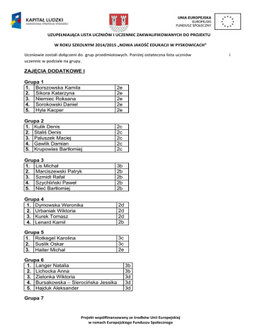 UZUPEŁNIAJĄCA LISTA UCZNIÓW I UCZENNIC ZAKWALIFIKOWANYCH DO PROJEKTU W ROKU SZKOLNYM 2014/2015 „NOWA JAKOŚĆ EDUKACJI W PYSKOWICACH” Uczniowie zostali dołączeni do grup przedmiotowych. Poniżej ostateczna lista uczniów uczennic w podziale na grupy. ZAJĘCIA DODATKOWE I Grupa 1 1. Borszowska Kamila 2. Sikora Katarzyna 3. Niemiec Roksana 4. Sorokowski Daniel 5. Hyla Kacper 2e 2e 2e 2e 2e Grupa 2 1. Kulik Denis 2. Staliś Denis 3. Paluszek Maciej 4. Gawlik Damian 5. Krupowies Bartłomiej 2c 2c 2c 2c 2c Grupa 3 1. Lis Michał 2. Marciszewski Patryk 3. Szmidt Rafał 4. Szychliński Paweł 5. Nieć Bartłomiej 3b 2b 2b 2b 2b Grupa 4 1. Dymowska Weronika 2. Urbaniak Wiktoria 3. Kurek Tomasz 4. Lenard Kamil 2d 2d 2d 2b Grupa 5 1. Rotkegel Karolina 2. Suslik Oskar 3. Haiter Michał 3c 3c 2e Grupa 6 1. Langer Natalia 2. Lichocka Anna 3. Zielonka Wiktoria 4. Bursakowska – Sierocińska Jessika 5. Hajduk Aleksander 3b 3b 3d 3d 3d Grupa 7 Projekt współfinansowany ze środków Unii Europejskiej w ramach Europejskiego Funduszu Społecznego i 1. 2. 3. 4. Dybał Krzysztof Pisanko Łukasz Jarzombek Filip Zdebel Emilia 2a 2a 2a 2b Grupa 8 1. Rozkosz Dominik 2. Podgórska Helena 3. Omylak Tomasz 4. Małczak Daniel 5. Nogieć Maciej 1c 1c 1c 1c 1c Grupa 9 1. Kasperczyk Artur 2. Niemczynowski Kacper 3. Kończyk Aleksandra 4. Skowronek Bartłomiej 5. Bączkowski Adam 3a 3a 3a 1a 1a ZAJĘCIA Dodatkowe II Grupa 1 1. Kopczyk Nikola 2. Kopczyk Patrycja 3c 3c Grupa 2 1. Kubosz Oliver 2. Kałużna Nikola 3. Wieczorek Sławomir Grupa 3 1. Adamczyk Szymon 2d 2c 2c 2d ZAJĘCIA Dodatkowe III 1. Paluszek Maciej 2. Czempik Mateusz 2c 2d INDYWIDUALNE KONSULTACJE Z DORADCĄ ZAWODOWYM 1. 2. 3. 4. 5. 6. 7. 8. 9. 10. Bajowska Oliwia Barszcz Damian Bednorz Maciej Blabuś Wiktor Brentek Karol Brummer Bożena Brym Patryk Bujak Wiktoria Drapała Patryk 3c 3d 3b 3a 3b 3a 3b 3b 3d 3c Eisenbeis Katarzyna Projekt współfinansowany ze środków Unii Europejskiej w ramach Europejskiego Funduszu Społecznego 11. 3a Gajewski Piotr 12. Godula Aleksandra 3a 13. Grocholski Rafał 3c 14. Hajduk Aleksander 3d 15. Jagiełło Paulina 3c 16. Kasperczyk Artur 3a 17. Kata Paweł 3b 18. Kijanowski Przemysław 3a 19. Kończyk Aleksandra 3a 20. Krok David 3a 21. Kwaśniok Natalia 3b 22. Langer Natalia 3b 23. Lichocka Anna 3b 24. Lis Michał 3d 25. Łozińska Anna 3b 26. Maciążek Marzena 3c 27. Malec Angelika 3c 28. Mazur Sandra 3d 29. Mężyński Tomasz 3d 30. Michałowski Wojciech 3c 31. Michałuszko Ewa 3a 32. Morawska Aleksandra 3a 33. Niemczynowski Kacper 3a 34. Obarzanek Dawid 3b 35. Okupny Magdalena 3c Projekt współfinansowany ze środków Unii Europejskiej w ramach Europejskiego Funduszu Społecznego 36. 3c Olechno Jacek 37. 3d Pasieka Arkadiusz 38. 3b Pawlik Marta 39. 3b Pawłowska Dominika 40. 3a Pejta Wiktoria 41. 3d Piechula Sebastian 42. 3d Poloczek Mateusz 43. 3a Przewoźna Karolina 44. 3a Pyra Anna 45. 3d Ratajczak Karolina 46. 3b Remus Arkadiusz 47. 3a Rotkegel Bartłomiej 48. 3c Rotkegel Karolina 49. 3b Schlenga Joanna 50. 3d Sierocińska – Bursakowska Jessika 51. 3a Skowronek Wojciech 52. 3c Sławik Katarzyna 53. 3b Sowińska Weronika 54. 3d Styblińska Natalia 55. 3b Sulik Agnieszka 56. 3c Suslik Oskar 57. 3a Szelaszuk Patrycja 58. 3c Wichrowska Jagoda 59. 3d Więckowska Jesika Projekt współfinansowany ze środków Unii Europejskiej w ramach Europejskiego Funduszu Społecznego 60. 3a Więcław Marta 61. Wiża Szymon 3a 62. Wręczycki Mateusz 3c 63. Zawistowski Łukasz 3c 64. Zienkiewicz Ewelina 3d 65. Zubrzycki Szymon 3c Zajęcia z języka polskiego Grupa 1 Lp IMIĘ I NAZWISKO 1 CZARNECKA Julia .2 KAMIŃSKA Julia 3 4 5 6 7 8 2e 2b 2a 2a 2b 2e 2b 2e NIEMKIEWICZ Aleksandra SYDOR Szymon SZCZEPANIAK Kamil ŚWIETLAK Justyna WOJDYŁA Patryk ZDEBEL Emilia Grupa 2 Lp. IMIĘ I NAZWISKO 1. 2. 3. 4. 6. 5. 7. 8. 9. ADAMCZYK Szymon CIESIELSKI Bartłomiej HELIOS Sara KOCIUBIŃSKI Paweł KRUPOWIES Bartłomiej LENARD Kamil MAŁCZAK Szymon WYROBA Wiktoria ZBEREZIŃSKA Weronika 2d 2d 2a 2d 2a 2d 2e 2d 2d Zajęcia z języka angielskiego Grupa 1 IMIĘ I NAZWISKO CZARNECKA Julia HAITER Michał 2e 2e Projekt współfinansowany ze środków Unii Europejskiej w ramach Europejskiego Funduszu Społecznego KASZUBA Alicja MARCINISZYN Oliwia PYKA Szymon 2e 2e 2e Grupa 2 IMIĘ I NAZWISKO ADAMCZYK Szymon KOŚCIEŃ Natalia WACŁAWEK Wiktoria WICHER Sonia ZDEBEL Emilia 2d 2c 2c 2c 2e Projekt współfinansowany ze środków Unii Europejskiej w ramach Europejskiego Funduszu Społecznego