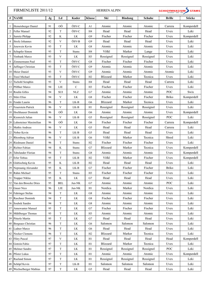 FIRMENLISTE 2011/12 HERREN ALPIN # NAME Jg Ld Kader Klasse Ski Bindung Schuhe Brille Stöcke 1 Hemetsberger Daniel 91 OÖ ÖSV-C A1 Atomic Atomic Atomic Carrera Komperdell 2 Feller Manuel 92 T ÖSV-C H4 Head Head Head Uvex Leki 3 Sarnitz Philipp 92 K LK G9 Fischer Fischer Fischer Uvex Komperdell 4 Strolz Johannes 92 V ÖSV-B G9 Head Head Head Uvex Leki 5 Jenewein Kevin 93 T LK G8 Atomic Atomic Atomic Uvex Leki 6 Schupfer Simon 93 T Stams H4 Völkl Marker Lange Uvex Leki 7 Vonbank Marco 93 V LK H3 Rossignol Rossignol Rossignol Uvex Leki 8 Zimmermann Paul 93 T ÖSV-C G8 Fischer Fischer Fischer Uvex Leki 9 Juffinger Christian 93 T ÖSV-C G9 Atomic Atomic Atomic Uvex Leki 10 Meier Daniel 93 V ÖSV-C G9 Atomic Atomic Atomic Atomic Leki 11 Traxl Michael 93 T ÖSV-C H2 Blizzard Marker Tecnica Uvex Leki 12 Tschohl Seraphin 93 V Stams H4 Head Head Head Carrera Leki 13 Pfiffner Marco 94 LIE C H3 Fischer Fischer Fischer Uvex Leki 14 Roulin Gilles 94 SUI NLZ G7 Atomic Atomic Atomic POC Swix 15 Stürz Elias 94 V LK G8 Fischer Fischer Fischer Briko Komperdell 16 Fender Laurin 96 T LK-B G6 Blizzard Marker Tecnica Uvex Leki 17 Feuerstein Patrick 96 V LK-B H1 Rossignol Rossignol Rossignol Uvex Leki 18 Hochhauser Dominik 96 OÖ LK G6 Atomic Atomic Atomic Uvex Komperdell 19 Kienreich Julian 96 V LK-B G5 Rossignol Rossignol Rossignol POC Leki 20 Lahnsteiner Maximilian 96 OÖ LK G6 Fischer Fischer Fischer Carrera Komperdell 21 Mathis Andreas 96 V LK G5 Head Head Head Carrera Leki 22 Nober Kevin 96 T LK-B G5 Head Head Head Uvex Leki 23 Rhomberg Adrian 96 V LK-B G6 Völkl Marker Tecnica Shred Leki 24 Riedmann Daniel 96 T Stams H2 Fischer Fischer Fischer Uvex Leki 25 Richter Fabian 94 K Stams G7 Blizzard Marker Tecnica Uvex Komperdell 26 Tabelander Florian 94 T Stams G8 Atomic Atomic Atomic Uvex Komperdell 27 Erler Tobias 95 T LK-B H2 Völkl Marker Fischer Uvex Komperdell 28 Glabischnig Kevin 95 K LK-B H2 Head Head Head Uvex Leki 29 Nepraunig Alexander 95 K LK-B G7 Fischer Fischer Fischer Briko Leki 30 Rahm Michael 95 T Stams H3 Fischer Fischer Fischer Uvex Leki 31 Tropper Niklas 95 K LK G7 Head Head Head Uvex Leki 32 Van den Broecke Dries 95 BEL Jun-NK G7 Atomic Atomic Atomic POC Leki 33 Gauer Nico 96 LIE Jun-NK H1 Nordica Marker Nordica Uvex Leki 34 Fahringer Stefan 94 T LK G8 Atomic Atomic Atomic Uvex Leki 35 Raschner Dominik 94 T LK G8 Fischer Fischer Fischer Uvex Leki 36 Soubek Sandro 94 T LK G8 Atomic Atomic Atomic Uvex Leki 37 Annewanter Manuel 95 T LK G7 Fischer Fischer Fischer Uvex Leki 38 Mühlberger Thomas 95 T LK H3 Atomic Atomic Atomic Uvex Leki 39 Pitterle Martin 95 T LK G7 Head Head Head Uvex Leki 40 Borgnaes Christian 96 T LK G6 Salomon Salomon Salomon Uvex Leki 41 Ladner Marco 96 T LK G6 Head Head Head Uvex Leki 42 Nocker Clemens 96 T LK H2 Blizzard Marker Tecnica Uvex Leki 43 Flöry Pascal 97 V LK H1 Head Head Head Head Komperdell 44 Gstrein Fabio 97 T LK H1 Blizzard Marker Tecnica Uvex Leki 45 Melmer Sandro 97 T LK H1 Rossignol Rossignol Rossignol POC Leki 46 Pfister Lukas 97 T LK H1 Atomic Atomic Atomic Uvex Komperdell 47 Rueland Simon 97 T LK H1 Rossignol Rossignol Rossignol Uvex Leki 48 Schöpf Kevin 97 T LK-B H1 Salomon Salomon Salomon Uvex Leki 49 Wechselberger Mathias 97 T LK G5 Head Head Head Uvex Leki