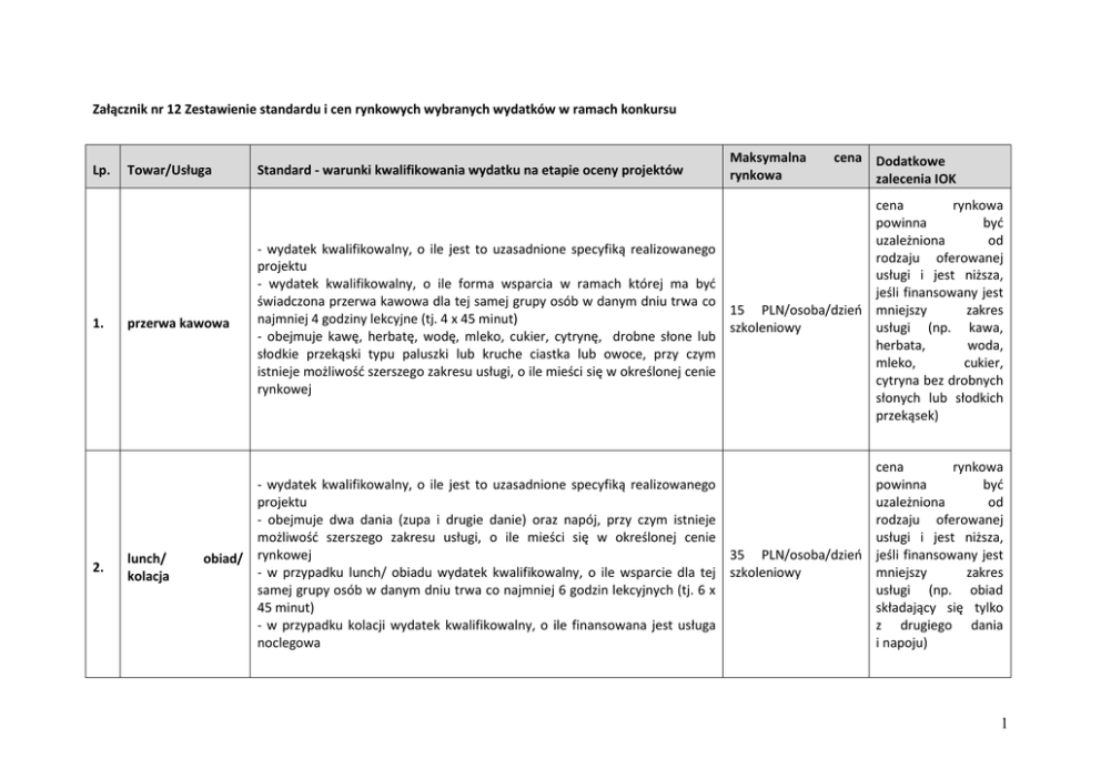 Załącznik nr 12 Zestawienie standardu i cen rynkowych wybranych wydatków w ramach konkursu Lp. 1. 2. Towar/Usługa przerwa kawowa lunch/ kolacja Standard - warunki kwalifikowania wydatku na etapie oceny projektów - wydatek kwalifikowalny, o ile jest to uzasadnione specyfiką realizowanego projektu - wydatek kwalifikowalny, o ile forma wsparcia w ramach której ma być świadczona przerwa kawowa dla tej samej grupy osób w danym dniu trwa co najmniej 4 godziny lekcyjne (tj. 4 x 45 minut) - obejmuje kawę, herbatę, wodę, mleko, cukier, cytrynę, drobne słone lub słodkie przekąski typu paluszki lub kruche ciastka lub owoce, przy czym istnieje możliwość szerszego zakresu usługi, o ile mieści się w określonej cenie rynkowej Maksymalna rynkowa cena Dodatkowe zalecenia IOK cena rynkowa powinna być uzależniona od rodzaju oferowanej usługi i jest niższa, jeśli finansowany jest 15 PLN/osoba/dzień mniejszy zakres szkoleniowy usługi (np. kawa, herbata, woda, mleko, cukier, cytryna bez drobnych słonych lub słodkich przekąsek) - wydatek kwalifikowalny, o ile jest to uzasadnione specyfiką realizowanego projektu - obejmuje dwa dania (zupa i drugie danie) oraz napój, przy czym istnieje możliwość szerszego zakresu usługi, o ile mieści się w określonej cenie 35 PLN/osoba/dzień obiad/ rynkowej - w przypadku lunch/ obiadu wydatek kwalifikowalny, o ile wsparcie dla tej szkoleniowy samej grupy osób w danym dniu trwa co najmniej 6 godzin lekcyjnych (tj. 6 x 45 minut) - w przypadku kolacji wydatek kwalifikowalny, o ile finansowana jest usługa noclegowa cena rynkowa powinna być uzależniona od rodzaju oferowanej usługi i jest niższa, jeśli finansowany jest mniejszy zakres usługi (np. obiad składający się tylko z drugiego dania i napoju) 1 3. 4. 5. - wydatek kwalifikowalny, o ile jest to uzasadnione specyfiką realizowanego projektu - możliwość zagwarantowania noclegu dotyczy uczestników, którzy posiadają miejsce zamieszkania w miejscowości innej niż ta miejscowość, w której odbywa się szkolenie - wydatek kwalifikowalny, o ile wsparcie (np. szkolenie, spotkanie) dla tej samej grupy osób trwa co najmniej dwa dni - w przypadku wsparcia trwającego nie dłużej niż jeden dzień wydatek kwalifikowalny w sytuacji, gdy miejsce prowadzenia szkolenia/spotkania jest nocleg w kraju oddalone od miejsca zamieszkania osoby w nim uczestniczącej o więcej niż 50 km (drogą publiczną, a nie w linii prostej), a jednocześnie wsparcie zaczyna się przed godziną 9.00 lub kończy się po godzinie 17.00, chyba że nie ma dostępnego dojazdu publicznymi środkami transportu - obejmuje nocleg w miejscu noclegowym o standardzie maksymalnie hotelu 3* wraz ze śniadaniem, przy czym istnieje możliwość szerszego zakresu usługi, o ile mieści się w określonej cenie rynkowej i jest to uzasadnione celami projektu - obejmuje nocleg, co do zasady w pokojach 2-osobowych (nocleg w pokojach 1-osobowych jest kwalifikowalny tylko w uzasadnionych przypadkach) - wydatek kwalifikowalny w związku z uzasadnionymi potrzebami grupy docelowej (koszty dojazdów dla osób niepełnosprawnych). Osobom zatrudnionym nie przysługuje zwrot kosztów dojazdu na miejsce spotkań/szkoleń zwrot kosztów - wydatek kwalifikowalny do wysokości opłat za środki transportu publicznego dojazdu w Polsce szynowego lub kołowego (a w przypadku podróży międzynarodowych także transportu lotniczego) zgodnie z cennikiem biletów II klasy obowiązującym na danym obszarze, także w przypadku korzystania ze środków transportu prywatnego (w szczególności samochodem lub taksówką) jako refundacja wydatku faktycznie poniesionego do ww. wysokości zakup materiałów - wydatek kwalifikowalny, o ile jest to uzasadnione specyfiką realizowanego piśmienniczych dla projektu uczestników - minimalny zestaw składa się z długopisu, teczki oraz notesu projektu - materiały muszą być odpowiednio oznakowane (znak Unii Europejskiej hotel o maksymalnym standardzie 3*: - 360 PLN/1 nocleg za 2 osoby w pokoju 2- osobowym, - 250 PLN/1 nocleg za 1 osobę w pokoju 1osobowy hotel o niższym standardzie niż 3* oraz pensjonat, motel itp.: - 260 PLN/1 nocleg za 2 osoby w pokoju 2osobowym - 120 PLN/1nocleg za 1 osobę w pokoju 1osobowym cena rynkowa powinna być uzależniona od rodzaju oferowanej usługi i jest niższa, jeśli finansowany jest mniejszy zakres usługi (np. nocleg w pokoju 3osobowym) cena uzależniona od cenników operatorów komunikacji publicznej 15 PLN/osoba 2 6. szkolenia językowe z nazwą Europejski Fundusz Społeczny i znak Funduszy Europejskich z nazwą programu) - wydatek kwalifikowalny, o ile jest to uzasadnione specyfiką realizowanego projektu - stawki jednostkowe mają zastosowanie do szkoleń językowych realizowanych na terenie poszczególnych województw, prowadzących do uzyskania kompetencji potwierdzonych certyfikatem, zgodnych z Europejskim Systemem Opisu Kształcenia Językowego - stawki dotyczą szkoleń z języka angielskiego, niemieckiego i francuskiego - stawka dotyczy 60 godzin lekcyjnych szkolenia (45 minut), przy czym jednorazowe zajęcia nie mogą trwać więcej niż 4 godziny lekcyjne dziennie, a po 2 godzinach szkoleniowych wymagana jest co najmniej 15 minutowa przerwa - stawka dotyczy 1 osoby przy liczebności grupy nie przekraczającej 12 osób -stawka dotyczy usługi szkoleniowej w pełnym zakresie kosztów tj. obejmującej w szczególności koszt organizacji szkolenia, koszt zakwalifikowania uczestnika projektu do odpowiedniej grupy, koszt zgodnie wykładowcy w zakresie przygotowania się do zajęć, ich prowadzenia tabelą: i weryfikacji prac domowych opracowywanych przez uczestników projektu, wyposażonej sali (w tym udogodnień dla osób z niepełnosprawnościami dostosowanych do typu niepełnosprawności w przypadku obejmowania wsparciem osób z niepełnosprawnościami), materiałów szkoleniowych, w tym również dostosowanych do specjalnych potrzeb osób z niepełnospr