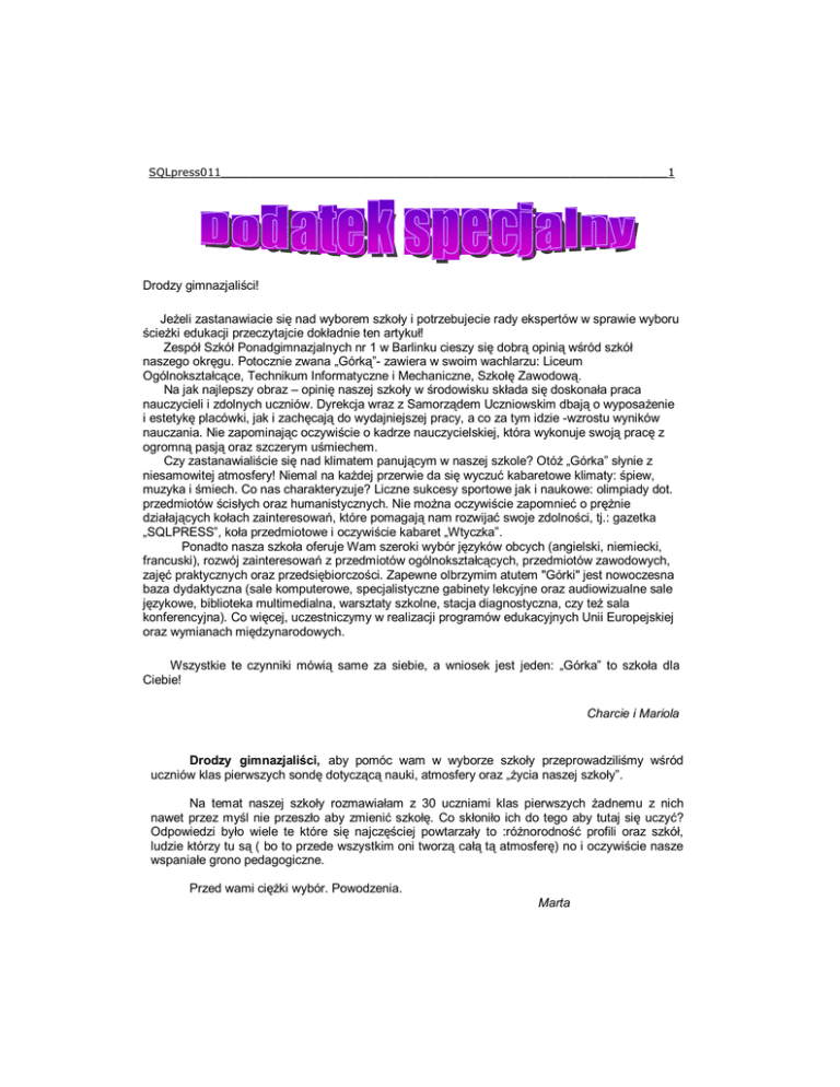 SQLpress011________________________________________________________________1 Drodzy gimnazjaliści! Jeżeli zastanawiacie się nad wyborem szkoły i potrzebujecie rady ekspertów w sprawie wyboru ścieżki edukacji przeczytajcie dokładnie ten artykuł! Zespół Szkół Ponadgimnazjalnych nr 1 w Barlinku cieszy się dobrą opinią wśród szkół naszego okręgu. Potocznie zwana „Górką”- zawiera w swoim wachlarzu: Liceum Ogólnokształcące, Technikum Informatyczne i Mechaniczne, Szkołę Zawodową. Na jak najlepszy obraz – opinię naszej szkoły w środowisku składa się doskonała praca nauczycieli i zdolnych uczniów. Dyrekcja wraz z Samorządem Uczniowskim dbają o wyposażenie i estetykę placówki, jak i zachęcają do wydajniejszej pracy, a co za tym idzie -wzrostu wyników nauczania. Nie zapominając oczywiście o kadrze nauczycielskiej, która wykonuje swoją pracę z ogromną pasją oraz szczerym uśmiechem. Czy zastanawialiście się nad klimatem panującym w naszej szkole? Otóż „Górka” słynie z niesamowitej atmosfery! Niemal na każdej przerwie da się wyczuć kabaretowe klimaty: śpiew, muzyka i śmiech. Co nas charakteryzuje? Liczne sukcesy sportowe jak i naukowe: olimpiady dot. przedmiotów ścisłych oraz humanistycznych. Nie można oczywiście zapomnieć o prężnie działających kołach zainteresowań, które pomagają nam rozwijać swoje zdolności, tj.: gazetka „SQLPRESS”, koła przedmiotowe i oczywiście kabaret „Wtyczka”. Ponadto nasza szkoła oferuje Wam szeroki wybór języków obcych (angielski, niemiecki, francuski), rozwój zainteresowań z przedmiotów ogólnokształcących, przedmiotów zawodowych, zajęć praktycznych oraz przedsiębiorczości. Zapewne olbrzymim atutem "Górki" jest nowoczesna baza dydaktyczna (sale komputerowe, specjalistyczne gabinety lekcyjne oraz audiowizualne sale językowe, biblioteka multimedialna, warsztaty szkolne, stacja diagnostyczna, czy też sala konferencyjna). Co więcej, uczestniczymy w realizacji programów edukacyjnych Unii Europejskiej oraz wymianach międzynarodowych. Wszystkie te czynniki mówią same za siebie, a wniosek jest jeden: „Górka” to szkoła dla Ciebie! Charcie i Mariola Drodzy gimnazjaliści, aby pomóc wam w wyborze szkoły przeprowadziliśmy wśród uczniów klas pierwszych sondę dotyczącą nauki, atmosfery oraz „życia naszej szkoły”. Na temat naszej szkoły rozmawiałam z 30 uczniami klas pierwszych żadnemu z nich nawet przez myśl nie przeszło aby zmienić szkołę. Co skłoniło ich do tego aby tutaj się uczyć? Odpowiedzi było wiele te które się najczęściej powtarzały to :różnorodność profili oraz szkół, ludzie którzy tu są ( bo to przede wszystkim oni tworzą całą tą atmosferę) no i oczywiście nasze wspaniałe grono pedagogiczne. Przed wami ciężki wybór. Powodzenia. Marta 2_______________________________________________________________SQLpress011 Całkiem niedawno <dokładnie w czwartek 10.04.> kilku redaktorów z naszej gazetki „Schoolpress” wraz z paniami M. Szafkowską i M. Korczak oraz z panem J. Świerczem udała się do siedziby „Gazety Lubuskiej” z nadzieją, że dowiemy się o kulisach pracy dziennikarza. Muszę przyznać, że nasze apetyty zostały w pełni zaspokojone. Przewodnik- pan Janusz Dobrzyńskiredaktor sportowy, który uchylił nam tajemnicy tegoż zawodu udzielił nam kilku informacji na temat „Gazety Lubuskiej” i co najważniejsze- zgodził się na udzielenie wywiadu. Magda: Czy ta praca jest stresująca? Pan Janusz: Oczywiście są chwilen kiedy jest naprawdę stresująca zwłaszcza, gdy musimy uważać na nieubłaganie biegnący czas, podczas imprez często zagranicznych, które późno się kończą i dostęp do informacji jest trudny. Po drugie ze względu na niesfornych kibiców, którzy nie zawsze potrafią zrozumieć cudze racje i pokazują usilnie swoje zdanie, a wiadomo do wszystkiego trzeba mieć obiektywne podejście, czego czytelnicy często oczekują od nas. Jednakże jest to praca dająca wiele satysfakcji i radości. Musimy umieć zachowywać obiektywizm w każdej sytuacji. Jednak wiadomo często utożsamiamy się z niektórymi zespołami, ich sukcesami. Magda: Czy należy skończyć studia humanistyczne, aby dostać się do redakcji? Pan Janusz: Nie jest to formalnie istotna sprawa, warto jednak je skończyć. Wielu z nas ich nie ma. Niektórzy mają inne wykształcenie często odlegle od humanistyki. Decyduje tu przede wszystkim pasja, zamiłowanie i pewne umiejętności. Magda: Czy nadchodzi taki czas, że się Pan tutaj nudzi? Pan Janusz: Nudzić się nie nudzę, ale jak w każdej pracy zdarzają się rożne sytuacje. Przychodzi zniechęcenie, głównie wtedy, gdy spotyka się z niesprawiedliwą oceną swojej pracy. Jednakże są to głównie cienie w słonecznym dniu. SQLpress011________________________________________________________________3 Magda: Jak pan wspomina początki pracy redaktora? Pan Janusz: Zaczynałem w katowickim sporcie w 1973 roku, to już 35 lat temu. Zaczynałem od krytyki redakcji, jak się okazało często wiedziałem więcej niż tamtejsi redaktorzy. Zebrałem 10 ostatnich nr i na pierwszej stronie wytknąłem im błędy. Okazało się, że zgodzili się z moją krytyką twierdzą, że mam rację i zaprosili mnie do współpracy. Napisałem tam pierwszy artykuł. Później druga, trzecia redakcja- wszędzie nowe doświadczenia, poznawałem nowych ludzi. Często również ze świecznika redakcyjnego w naszym kraju. Po 20 latach zacząłem współpracować z lokalnymi gazetami i teraz pracuje etatowo w dziennikarstwie. Magda: Jakie są dobre i złe strony tego zawodu? Pan Janusz: Dobrą stroną jest to, że robimy to, co lubimy. Mamy bezpośrednią styczność z ludźmi, zawodnikami, szkoleniowcami i kibicami co jest nieodzowne w tej pracy. Minusy zaś to, że pracujemy 7 dni w tygodniu, często kosztem rodziny. Najtrudniej jest, gdy w niedziele cała rodzina spotyk