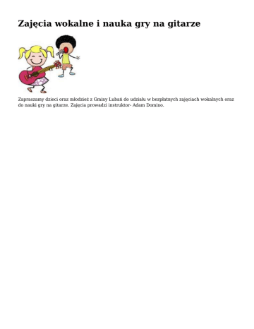 Zajęcia wokalne i nauka gry na gitarze Zapraszamy dzieci oraz młodzież z Gminy Lubań do udziału w bezpłatnych zajęciach wokalnych oraz do nauki gry na gitarze. Zajęcia prowadzi instruktor- Adam Domino.