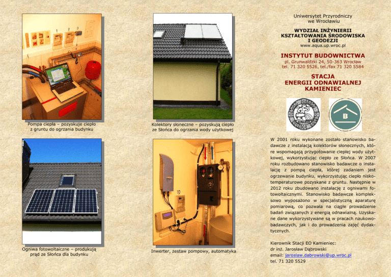 Uniwersytet Przyrodniczy we Wrocławiu WYDZIAŁ INŻYNIERII KSZTAŁTOWANIA ŚRODOWISKA I GEODEZJI www.aqua.up.wroc.pl INSTYTUT BUDOWNICTWA pl. Grunwaldzki 24, 50-363 Wrocław tel. 71 320 5526, tel./fax 71 320 5584 STACJA ENERGII ODNAWIALNEJ KAMIENIEC Pompa ciepła – pozyskuje ciepło z gruntu do ogrzania budynku Kolektory słoneczne – pozyskują ciepło ze Słońca do ogrzania wody użytkowej W 2001 roku wykonane zostało stanowisko badawcze z instalacją kolektorów słonecznych, które wspomagają przygotowanie ciepłej wody użytkowej, wykorzystując ciepło ze Słońca. W 2007 roku rozbudowano stanowisko badawcze o instalację z pompą ciepła, której zadaniem jest ogrzewanie budynku, wykorzystując ciepło niskotemperaturowe pozyskane z gruntu. Następnie w 2012 roku zbudowano instalację z ogniwami fotowoltaicznymi. Stanowisko badawcze kompleksowo wyposażono w specjalistyczną aparaturę pomiarową, co pozwala na ciągłe prowadzenie badań związanych z energią odnawialną. Uzyskane dane wykorzystywane są w pracach naukowobadawczych, jak i do prowadzenia zajęć dydaktycznych. Ogniwa fotowoltaiczne – produkują prąd ze Słońca dla budynku Inwerter, zestaw pompowy, automatyka Kierownik Stacji EO Kamieniec: dr inż. Jarosław Dąbrowski email: [email protected] tel. 71 320 5529 INSTALACJA Z POMPĄ CIEPŁA INSTALACJA Z KOLEKTORAMI SŁONECZNYMI wykorzystanie niskotemperaturowego ciepła z gruntu wykorzystanie energii promieniowania słonecznego A – pompa ciepła, B – dolne źródło ciepła, C – obieg grzewczy grzejników konwektorowych, D – bufor, E – licznik ciepła, F – czujnik temperatury, G – przepływomierz, H – licznik energii elektrycznej, I – pompa obiegowa, J – naczynie wzbiorcze, K – armatura do napełniania, L – pompa ręczna do napełniania układu, M – odpowietrznik, N – zawór bezpieczeństwa, O – rozdzielacz solanki, P – regulator. z – zasilanie, p – powrót. A – kolektory słoneczne, B – zestaw pompowy, C – zawór bezpieczeństwa, D – zbiornik na czynnik roboczy, E – naczynie wzbiorcze, F – pompa ręczna do napełniania układu, G – armatura do napełniania, H – wodomierz, I – przepływomierz, J – pętla termoizolacyjna, K – licznik ciepła, L – czujnik temperatury, M – tuleja zanurzeniowa, N – pojemnościowy podgrzewacz wody, O – punkty czerpalne, P – kocioł jednofunkcyjny, R – separator powietrza, S – automatyka, T – elastyczny przewód przyłączeniowy, U – odpowietrznik, W – moduł obsługowy kotła, Y – mieszacz. z – zasilanie, p – powrót. Aparatura pomiarowa: 1. Ciepłomierz CQM-III/WS-15-1/TS-200 na układzie kolektory-podgrzewacz, 2. Licznik energii elektrycznej KAMSTRUP 685-382-OK-64, 3. Ciepłomierz CQM-III-K/JS-15-1.5/TS-310 na układzie kocioł-podgrzewacz, 4. Dwa liczniki energii elektrycznej KAMSTRUP 684-38A, 5. Ciepłomierz CQM-III-JS/1.5/2/TOPE42 na układzie pompa ciepła-dolne źródło ciepła, 6. Piezometr, 7. Przepływomierz JS90-1.5-NC, 8. Ciepłomierz CQM-III-KJS-K15/1.5/1/TOPE42 na układzie pompa ciepła-obieg grzewczy centralnego ogrzewania, 9. Czujnik temperatury gruntu PTN1/Pt100/Fi8/Ls.1300 mm nr 1 + miernik AR233, 10. Czujnik temperatury gruntu PTN1/Pt100/Fi8/Ls.1300 mm nr 2 + miernik AR234.