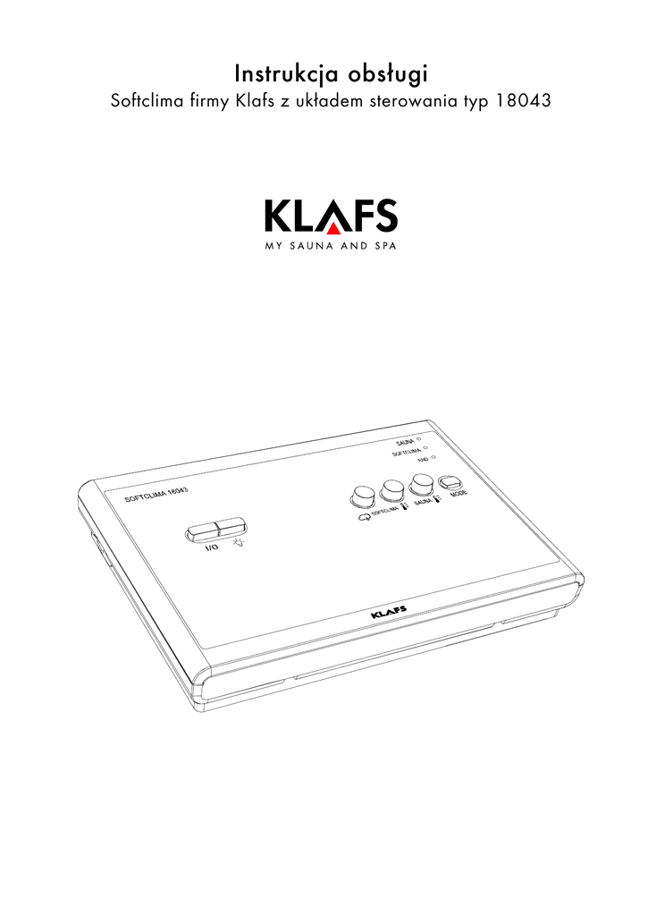 Instrukcja obsługi Softclima firmy Klafs z układem sterowania typ 18043 Spis treści Strona 1. 2. Krótki opis sterowania Softclima . . . . . . . . . . . . . . . . . . . . . . . . . . . . . . . . . . . . Kąpiel . . . . . . . . . . . . . . . . . . . . . . . . . . . . . . . . . . . . . . . . . . . . . . . . . . . . . . . . . . 3 3 2.1. 2.2. Sauna . . . . . . . . . . . . . . . . . . . . . . . . . . . . . . . . . . . . . . . . . . . . . . . . . . . . . . . . . . . . . . . . Softclima . . . . . . . . . . . . . . . . . . . . . . . . . . . . . . . . . . . . . . . . . . . . . . . . . . . . . . . . . . . . . . 3 3 3. 4. 5. 6. 7. Dane techniczne . . . . . . . . . . . . . . . . . . . . . . . . . . . . . . . . . . . . . . . . . . . . . . . . . Użytkowanie zgodne z przeznaczeniem . . . . . . . . . . . . . . . . . . . . . . . . . . . . . . Ogólne zalecenia bezpieczeństwa . . . . . . . . . . . . . . . . . . . . . . . . . . . . . . . . . . Elementy sterowania i wskaźnikowe . . . . . . . . . . . . . . . . . . . . . . . . . . . . . . . . . Obsługa . . . . . . . . . . . . . . . . . . . . . . . . . . . . . . . . . . . . . . . . . . . . . . . . . . . . . . . . 3 4 4 5 6 7.1. 7.2. 7.3. 7.4. 7.5. 7.6. 7.7. 7.8. 7.9. Włączanie/wyłączanie oświetlenia kabiny . . . . . . . . . . . . . . . . . . . . . . . . . . . . . . . . . . . . . Włączanie/wyłączanie trybu oczekiwania . . . . . . . . . . . . . . . . . . . . . . . . . . . . . . . . . . . . . Uruchomienie kąpieli Sauna . . . . . . . . . . . . . . . . . . . . . . . . . . . . . . . . . . . . . . . . . . . . . . . . Uruchomienie kąpieli Softclima . . . . . . . . . . . . . . . . . . . . . . . . . . . . . . . . . . . . . . . . . . . . . . Zmiana rodzaju kąpieli . . . . . . . . . . . . . . . . . . . . . . . . . . . . . . . . . . . . . . . . . . . . . . . . . . . . Kończenie kąpieli Sauna . . . . . . . . . . . . . . . . . . . . . . . . . . . . . . . . . . . . . . . . . . . . . . . . . . . Kończenie kąpieli Softclima . . . . . . . . . . . . . . . . . . . . . . . . . . . . . . . . . . . . . . . . . . . . . . . . . Uruchamianie parownika PLURIS . . . . . . . . . . . . . . . . . . . . . . . . . . . . . . . . . . . . . . . . . . . . . Wyłączanie parownika PLURIS . . . . . . . . . . . . . . . . . . . . . . . . . . . . . . . . . . . . . . . . . . . . . . 6 6 6 6 7 7 7 8 10 8. Ustawianie indywidualne . . . . . . . . . . . . . . . . . . . . . . . . . . . . . . . . . . . . . . . . . . 12 8.1. 8.2. 8.3. 8.4. 8.5. Temperatury Sauna, Softclima . . . . . . . . . . . . . . . . . . . . . . . . . . . . . . . . . . . . . . . . . . . . . . . Ustawianie temperatury Sauna . . . . . . . . . . . . . . . . . . . . . . . . . . . . . . . . . . . . . . . . . . . . . . Ustawianie temperatury Softclima . . . . . . . . . . . . . . . . . . . . . . . . . . . . . . . . . . . . . . . . . . . . Ustawianie wilgotności powietrza Softclima . . . . . . . . . . . . . . . . . . . . . . . . . . . . . . . . . . . . . Ustawianie przepustnicy powietrza wylotowego do napowietrzania i odpowietrzania kabiny (opcja) . . . . . . . . . . . . . . . . . . . . . . . . . . . . . . . . . . . . . . . . . . . . . . . . . . . . . . . . . . 12 12 13 13 9. Jeśli coś nie funkcjonuje . . . . . . . . . . . . . . . . . . . . . . . . . . . . . . . . . . . . . . . . . . . 14 9.1. 9.2. Wskazania zakłóceń za pomocą diod świecących trybu pracy . . . . . . . . . . . . . . . . . . . . . . Możliwe dalsze usterki . . . . . . . . . . . . . . . . . . . . . . . . . . . . . . . . . . . . . . . . . . . . . . . . . . . . 14 14 10. Konserwacja i czyszczenie . . . . . . . . . . . . . . . . . . . . . . . . . . . . . . . . . . . . . . . . . 15 10.1. 10.2. Czyszczenie kabiny saunowej . . . . . . . . . . . . . . . . . . . . . . . . . . . . . . . . . . . . . . . . . . . . . . Softclima . . . . . . . . . . . . . . . . . . . . . . . . . . . . . . . . . . . . . . . . . . . . . . . . . . . . . . . . . . . . . . 15 16 11. 12. Notatki . . . . . . . . . . . . . . . . . . . . . . . . . . . . . . . . . . . . . . . . . . . . . . . . . . . . . . . . . Adresy korespondencyjne . . . . . . . . . . . . . . . . . . . . . . . . . . . . . . . . . . . . . . . . . . 17 20 13 Softclima 1. Krótki opis sterowania Softclima Sterowanie Softclima firmy Klafs zapewnia możliwość komfortowego korzystania z sauny. Warunki kąpieli można zmieniać przed rozpoczęciem kąpieli i w czasie jej trwania w ramach zakresów nastawczych. I/O włącznik główny 2. Kąpiel 2.1. Sauna Elementy sterowania SAUNA Temperatury 85 - 100 °C i mała względna wilgotność powietrza. KĄPIEL W GORĄCYM POWIETRZU Bardzo łagodny klimat, temperatury 45 - 60 °C i względna wilgotność powietrza do ok. 20 %. 2.2. Softclima Łagodna kąpiel parowa Łagodna i wilgotna kąpiel w temperaturach 50 - 60 °C i regulowana bezstopniowo wilgotność powietrza. W przypadku łagodnej kąpieli parowej temperatura i względna wilgotność powietrza regulowane są przez sterowanie mikroprocesorowe. KĄPIEL ZIOŁOWA Takie same parametry klimatu, jak przy łagodnej kąpieli parowej, jednakże z dodatkowym parowaniem wysokiej jakości ekstraktów zapachowych zmieszanych z wodą. Dzięki temu można zwiększyć oddziaływanie łagodnej kąpieli parowej. Korzystanie z sauny firmy Klafs ma służyć zdrowiu użytkowników i zapobiegać chorobom. Z tego względu: Nie wolno przesadzać! Dotyczy to zarówno temperatury, względnej wilgotności powietrza i czasu trwania kąpieli. Należy kierować się nie tylko podanymi czasami kąpieli, ale również swoim samopoczuciem. Kabinę należy opuścić, gdy tylko pojawią się oznaki złego samopoczucia. 3. Dane techniczne Sterowanie typ 18043: 3/N/PE ~400 V, maks. 9 kW. Warunki pomieszczenia: Temperatura 0 °C do 35 °C, względna wilgotność powietrza maks. 80 %. 50701260/12.10 Strona 3 Softclima 4. Użytkowanie zgodne z przeznaczeniem Sterowanie Softclima przeznaczone jest wyłącznie do sterowania dopuszczonym do użytkowania piecem do sau