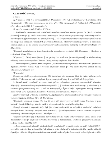 Słownik polszczyzny XVI wieku - wersja elektroniczna hasło: CZYSTOŚĆ (stan na dzień: 11-10-2015) www.spxvi.edu.pl strona 1/6 CZYSTOŚĆ (609) sb f o jasne. sg N czystość (56). ◊ G czystości (198). ◊ D czystości (19). ◊ A czystość (155). ◊ I czystością (29). ◊ L czystości (145); (cum praep „na, o, po, przy, w”) (140), (sine praep) (5) PatKaz II. ◊ pl N czystości (2). ◊ G czystości (1). ◊ A czystości (4). Sł stp, Cn notuje, Linde XVII — XVIII w. 1. Brak brudu, zanieczyszczeń; schludność; munditia, mundities, puritas, puritia Cn (5) : S tych ſlow [Dawida] ukazuye ſyą czeſcz narodzenya maryey yſz ſzwyatloſzczy przyrownanya ktora ſzwyatloſzcz myedzy ynym[y] ſtworzenym ma przeuyſſenye [...] yſz ſzwyatloſzcz yeſt nyezmyenney czyſtoſzczy bo ſyą nyepokala ſmrodem PatKaz III 87; Stymi nietrzymam/ ktorzy zwierzchnią poſtawą/ y odzienim/ okazvią cżyſtoſć ale na vmyſle y na vcżynkach/ nad nierozvmne beſtije Ią pſotliwſzy SeklWyzn f3v; Mącz 332c. Wyrażenie przyimkowe w funkcji okolicznika sposobu: »w czystości« (1): Converse ‒ Chędogo w cziſtoſzczi. Calep 256a. W przen (1) : Wżdy twoy [śmierci] iad prożny: bo ten kwiát [o zmarłej pannie] ku wiośnie Oney oſtátney y wieczney wyrośnie/ Wonie Liliey pełen y czyſtośći SzarzRyt Dv. 2. Przezroczystość, jasność, brak zamglenia (2) : Oświeć Boże ćięmnośći/ Iák ſłonecżne promienie Zganiáią przykre ćienie/ Gdy obłocżne cżyſtośći/ Przez [= bez] záchodzących chmur mienią właſności. GrabowSet D3. W przen (1) : Szereg: »czystość a przejrzoczystość« (1): Abowiem nie mniemay ábyć to thám widome perły miáły być/ ále nam ty znácżą cżyſtość á przeyrzocżyſtość drog á bran Páńſkich RejAp 184v. 3. Prawdziwość, rzetelność, szczerość, brak fałszu, całkowitość, prostota; zrozumiałość; sinceritas Mącz (6) : przez modlitwę ſwą ſzukałem mądrośći. [...] Vdałem ſerce ſwe ku niey/ y nálazłem ią w czyſtości [in agnitione Vulg 51/27; καὶ ᾽εν καθαρισμω̃ͺ ε῾υ̃ρον α᾽υτήν. Septuaginta 51/20] BibRadz Eccli 51/26 [27]; Synceritas, Szczirość/ Czyſtość. Nienáruſzność. Mącz 437a. czystość czego (2): O Izráelu ludu Boży/ [...] polecam was cżyſtości zakonu/ cnotliwym obycżáiom y dobrey ſpráwie BielKron 45v. Cf Wyrażenie. Wyrażenie: »czystość wiary« (1): Ale iż też y ći/ ktorzy przy cżyſtośći wiáry Swiętey/ y przy iednośći Kośćiołá Bożego ieſzcże zoſtáli/ niepomáłu zſobą trwożą KarnNap ktv. Szeregi: »jasność i czystość« (1): Był [św. Leon] zmłodośći we wſzytkich náukách/ zwłaſzcżá świętych bárzo ćwicżony: rozſądek miał zdrowy/ [...] y iáſną wymowę: ktora z iáſnośći y cżyſtośći wnętrzney iáko zrzodłá pochodziłá. SkarŻyw 317. »czystość i światło« (1): Gdyż ſámo ſłowo Boże trwa na wieki: ieſt prawdźiwe/ iáſne/ cżyſte y ták doſkonáłe/ żemu [!] cżyſtośći y świátłá do prawdy y doſkonáłośći/ 1udźiom przydawáć namniey/ [...] nie trzebá. CzechEp 139. 4. Bezgrzeszność, niewinność, nieskazitelność; szlachetność, prawość, cnota, zacność, świętość (594) : przyiąl ią [Maryję] kor archanielſki/ chwálątz ią z iéy cżyſtoſci/ a dziwuiątz ſie iéy chwále ſpiéwali. OpecŻyw 182v; ijż blogoſlawioná dziewitza Mariá/ nade wſſytko ſtworzenijé boſkié byla nácżyſtſſá/ Słownik polszczyzny XVI wieku - wersja elektroniczna hasło: CZYSTOŚĆ (stan na dzień: 11-10-2015) www.spxvi.edu.pl strona 2/6 tako iż po bodze więtſſá cżyſtoſtz niemogla bytz naleziona. OpecŻyw 189, 2v, 5v, 183 [2 r.], 187v; PatKaz I 10, 12, 18v [2 r.]; A przetoſch tą myla panną wzyąla zboſtwa czyſtoſzcz PatKaz II 21v; yzeſz [od uyekow] [Panno] uybrana [w] uyelykyey czyſtoſzczy przeſz grzechu pyeruorodnego PatKaz II 35v; Anyely nyemogą bycz przyrownany czyſtoſzczy panny maryey PatKaz II 81v, 21v, 22 [2 r.], 26, 30v, 37 (31); yſch marya panną taką czyſtoſzczą ſlynąla yſch pod bogyem uyączſſa nyemoze bycz nalyezyona PatKaz III 145, 87v [2 r.], 107v, 110, 130, 133 (8); BielŻyw 100; LibMal 1544/84v; KromRozm I C4v; Iáko pan pożąda áby koſcioł zebránia iego był cżiſtoſcią ochędożony. LubPs M3 marg; ſmieſz mowić y piſáć/ náprzećiwko Pánu Bogu/ nawyſſſzey dobroći y tzyſtośći/ iakoby on ktorą złą rzetz [...] poſtánowił? KrowObr 220v, 221 marg, 221v, 230, 242, Ss4; HistRzym 123; ábowiem to ieſt Pan Bog wáſz. A on dla tego chce obrzezáć a ochędożyć ſercá wáſze/ ábyſcie go imi w cżyſtośći miłowáli. RejPos 32v; WujJud 189; CzechRozm 163; SkarJedn 238; Cżyſtość fundámentem cnot Chrześćijáńſkich. SkarŻyw 178 marg, 245, 362; Bo wſzyſtki dáry ktore [Pan] ma/ z ćiáłem ſwoim iuż nam dawa/ cżyſtość, vſpráwiedliwienie/ y grzechow odpuſzcżenie ArtKanc N9v; Więc iż Pánná bez zmázy/ choćia porodźiłá/ Owſzem cżyſtośći więtſzey niżli w mátce byłá. GrabowSet Kv, O3v; Przetoż tám ſię zdobędzieſz na więtſze oświecenie rozumu/ [...] na ćichość/ ćirpliwość/ męſtwo/ cżyſtość/ trzeźwość/ y wſzelkie inſze cnoty. LatHar 204, 208, 233, 406, 423 (6); Náucza [Jezus] ſpoſobu y mocy modlitwy/ y ſtrofuie opáczną czyſtość Pháryzáyſką. WujNT przedm 37; iáko wielkiey cżyſtośći potrzebá temu/ ktory ma godnie przyiąć naświętſzy Sákráment Ciáłá y krwie iego. WujNT 361; SkarKaz 638b marg. czystość czego (14): OpecŻyw 3; PatKaz II 81v; PatKaz III 144; Y zaż by też iem to właſnie nieprzyſtało [...] też go oſobliwie wyſláwiáć á ofiaruiąc iemu cżyſtoſć vmyſlow ſwych RejPs 160; HistAl E6v; BibRadz I 161 marg; SkarŻyw 212, 452; Stan świętych w niebie [...]/ przyrownány ieſt [...] śkłu/ [...] dla cżyſtośći/ [...] y przezroczyſtośći ćiał vwielbionych. WujNT 888; SiebRozmyśl 