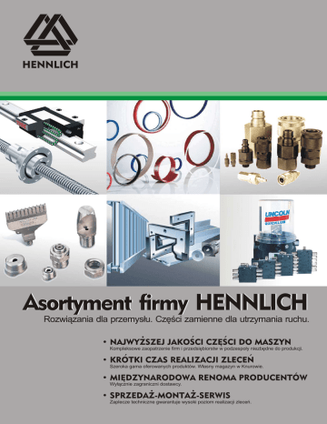 Rozwiązania dla przemysłu. Części zamienne dla utrzymania ruchu. Kompleksowe zaopatrzenie firm i przedsiębiorstw w podzespoły niezbędne do produkcji. Szeroka gama oferowanych produktów. Własny magazyn w Knurowie. Wyłącznie zagraniczni dostawcy. Zaplecze techniczne gwarantuje wysoki poziom realizacji zleceń. założyciel Grupy HENNLICH 2 44-190 Knurów • Thomasa Wilsona 24A • Tel. +48 (32) 42 06 700 • Fax: +48 (32) 42 06 708 • e-mail: [email protected] • www.hennlich.pl maier heidenheim FÜR KLIMA-KOMFORT 3 44-190 Knurów • Thomasa Wilsona 24A • Tel. +48 (32) 42 06 700 • Fax: +48 (32) 42 06 708 • e-mail: [email protected] • www.hennlich.pl Informacje o firmie HENNLICH ............................... Strona 2/3 Układy centralnego smarowania ................................. Strona 4 Szybkozłacza ....................................................................... Strona 5 Uszczelnienia techniczne ................................................. Strona 6 Dysze przemysłowe ........................................................... Strona 7 Technika liniowa, osłony maszyn ................................. Strona 8 Złacza obrotowe ............................................................... Strona 9 Pneumatyka ....................................................................... Strona 10 Pompy przemysłowe ........................................................ Strona 11 Sprezyny techniczne ....................................................... Strona 12 Technika filtracji .............................................................. Strona 13 Przerywacze płomienia .................................................. Strona 14 Klamrowe zaciski srubowe ............................................ Strona 15 Firma HENNLICH została wyróżniona w bezpłatnym rankingu “Gazeli Biznesu” Elektryczne systemy grzewcze .................................... Strona 16 Pompy ciepła, maty kapilarne ................................... Strona 17 Rekawy załadowcze, armatki wodne ........................ Strona 18 w 2008, 2011, 2012 roku. Hydraulika sterownicza ................................................. Strona 19 Najczęstszą spotykaną przyczyną awarii maszyn i urządzeń jest niewłaściwe smarowanie. Smarowanie okresowe posiada wady, ponieważ utrudnia kontrolę (pomiar) ilości środka smarującego, aplikowanego do punktu smarowania. Nie zapewnienie właściwej obsługi maszyn, których warunki pracy zmieniają się dynamicznie w zależności od temperatury, stopnia obciążenia czy przerwy w pracy. Nowoczesne układy smarowania LINCOLN pozwalają na wbudowanie systemu do maszyn i urządzeń. Wtedy obsługa ogranicza się wyłącznie do napełniania zbiornika smarem lub olejem oraz do obserwacji układów sygnalizacji działania. Pompy do układów smarowania: elektryczne, hydrauliczne, pneumatyczne, do smarów lub olejów. Sprzęt do warsztatów: pompy beczkowe, zwijadła, smarownice ręczne. Smarowanie maszyn, pojazdów ttakich elementów jak sworznie, łożyska, tłoki, gdzie istnieje możliwość styku elementów z piaskiem, kurzem, pyłem lub następuje wypłukiwanie środka smarnego przez wodę. Linie produkcyjne, przemysł papierniczy, produkcja szkła oraz hutnictwo: zapewniają ciągłość produkcji, eliminując postoje maszyn, zwiększając tym samym wydajność. Układy, które mogą swobodnie pracować w wysokich temperaturach. Pompy ręczne i smarownice: pompy beczkowe, zwijadła, smarownice ręczne, smarownice elektryczne, smarownice pneumatyczne. Typowe zalety zastosowania: przedłużenie żywotności maszyn, minimalizacja tarcia, przerw i postojów, zmniejszenie zużycia energii oraz smaru, absorpcja wstrząsów, tłumienie hałasu, prosta budowa i obsługa, łatwa regulacja dawkowania środka smarnego, modułowa budowa umożliwiająca łatwą rozbudowę, różnorodność wariantów i typów. Smarowanie łańcuchów: układy progresywne umożliwiające smarowanie łańcuchów za pomocą szczotek, bądź smarowanie natryskowe. Autoryzowany serwis: doradztwo, projektowanie, sprzedaż, montaż i serwis układów smarowania Lincoln. Świadczymy również usługi serwisowe dla układów smarowania takich firm jak: SKF, VOGEL, Tribotec oraz innych. Kontakt: Błażej Owczarek - Kierownik działu kom. 508 208 382 [email protected] Paweł Herzyk kom. 512 821 640 [email protected] Wyłączne przedstawicielstwo w Polsce 4 Daniel Rogalski kom. 512 821 644 [email protected] Dariusz Domański kom. 516 147 217 [email protected] W sprawie realizacji zamówień: Anna Widera lub Karolina Cisoń - Asystentki działu tel.: (32) 420 67 32 lub 33 e-mail: [email protected] 44-190 Knurów • Thomasa Wilsona 24A • tel. +48 (32) 42 06 700 • fax: +48 (32) 42 06 708 • e-mail: [email protected] • www.hennlich.pl Oferta monozłączy, multizłączy i systemów dokujących, obejmuje ponad 300 000 wariantów spełniających niemal każde wymagania. Monozłącza, multizłącza i systemy dokujące przeznaczone do łączenia przewodów cieczy, gazów, sygnałów optycznych i elektrycznych oraz ich bezpiecznego rozłączania. Opracowane rozwiązania spełniają najwyższe wymagania, sprawdzone w trudnych warunkach oraz chroniące środowisko. Ważnymi obszarami zastosowań są: przemysł samochodowy, przemysł lotniczy, branża chemiczna, farmaceutyczna, a także budowa maszyn, instalacji oraz technika obronna. Multizłącza. Podłączane automatyczne lub podłączane ręcznie. Do jednoczesnego podłączenia wielu linii przepływowych, pneumatycznych i elektrycznych. Skraca czas podłączenia maszyny, podczas ich pracy, badań, kontroli. Wymiana narzędzi, system TOOL-MASTER. System multizłączy zapewnia szybką i łatwą wymianę narzędzi robotów przemysłowych, zapewniając uproszczenie konstrukcji i redukcję kosztów pracy. Złącza niskociśnieniowe - Seria LP: średnica: 2.5, 3, 4, 6, 7, 9, 12, 19, 32 oraz 50mm. Ciśnienie: aż do 100 bar – poj