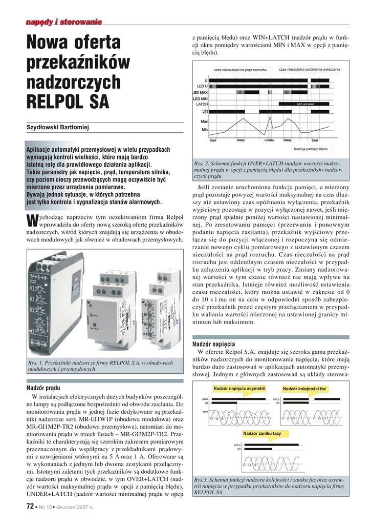 Nowa oferta przekaźników nadzorczych RELPOL SA z pamięcią błędu) oraz WIN+LATCH (nadzór prądu w funkcji okna pomiędzy wartościami MIN i MAX w opcji z pamięcią błędu). Szydłowski Bartłomiej Aplikacje automatyki przemysłowej w wielu przypadkach wymagają kontroli wielkości, które mają bardzo istotną rolę dla prawidłowego działania aplikacji. Takie parametry jak napięcie, prąd, temperatura silnika, czy poziom cieczy przewodzących mogą oczywiście być mierzone przez urządzenia pomiarowe. Bywają jednak sytuacje, w których potrzebna jest tylko kontrola i sygnalizacja stanów alarmowych. W ychodząc naprzeciw tym oczekiwaniom firma Relpol wprowadziła do oferty nową szeroką ofertę przekaźników nadzorczych, wśród których znajdują się urządzenia w obudowach modułowych jak również w obudowach przemysłowych. Rys. 1. Przekaźniki nadzorcze firmy RELPOL S.A. w obudowach modułowych i przemysłowych Nadzór prądu W instalacjach elektrycznych dużych budynków poszczególne lampy są podłączone bezpośrednio od obwodu zasilania. Do monitorowania prądu w jednej fazie dedykowane są przekaźniki nadzorcze serii MR-EI1W1P (obudowa modułowa) oraz MR-GI1M2P-TR2 (obudowa przemysłowa), natomiast do monitorowania prądu w trzech fazach – MR-GI3M2P-TR2. Przekaźniki te charakteryzują się szerokim zakresem pomiarowym przeznaczonym do współpracy z przekładnikami prądowymi z uzwojeniami wtórnymi na 5 A oraz 1 A. Oferowane są w wykonaniach z jednym lub dwoma zestykami przełącznymi. Istotnymi zaletami tych przekaźników są dodatkowe funkcje nadzoru prądu w obwodzie, w tym OVER+LATCH (nadzór wartości maksymalnej prądu w opcji z pamięcią błędu), UNDER+LATCH (nadzór wartości minimalnej prądu w opcji 72 NR 12 GRUDZIEŃ 2007 R. Rys. 2. Schemat funkcji OVER+LATCH (nadzór wartości maksymalnej prądu w opcji z pamięcią błędu) dla przekaźników nadzorczych prądu Jeśli zostanie uruchomiona funkcja pamięci, a mierzony prąd pozostaje powyżej wartości maksymalnej na czas dłuższy niż ustawiony czas opóźnienia wyłączenia, przekaźnik wyjściowy pozostaje w pozycji wyłączonej nawet, jeśli mierzony prąd spadnie poniżej wartości nastawionej minimalnej. Po zresetowaniu pamięci (przerwaniu i ponownym podaniu napięcia zasilania), przekaźnik wyjściowy przełącza się do pozycji włączonej i rozpoczyna się odmierzanie nowego cyklu pomiarowego z ustawionym czasem nieczułości na prąd rozruchu. Czas nieczułości na prąd rozruchu jest oddzielnym czasem nieczułości w przypadku załączenia aplikacji w tryb pracy. Zmiany nadzorowanej wartości w tym czasie również nie mają wpływu na stan przekaźnika. Istnieje również możliwość ustawienia czasu nieczułości, który można ustawić w zakresie od 0 do 10 s i ma on na celu w odpowiedni sposób zabezpieczyć przekaźnik przed częstym przełączaniem w przypadku wahania wartości mierzonej na ustawionej granicy minimum lub maksimum. Nadzór napięcia W ofercie Relpol S.A. znajduje się szeroka gama przekaźników nadzorczych do monitorowania napięcia, które mają bardzo dużo zastosowań w aplikacjach automatyki przemysłowej. Jednym z głównych zastosowań są układy sterowa- Rys.3. Schemat funkcji nadzoru kolejności i zaniku faz oraz asymetrii napięcia w przypadku przekaźników do nadzoru napięcia firmy RELPOL SA reklama nia agregatów prądotwórczych i zestawów baterii wykorzystywanych do zasilania systemów w przypadku zaniku napięcia w głównej sieci. Możliwość nadzorowania sieci zasilania i systemu rezerwowego zasilania pozwala na wykorzystanie przekaźników do nadzoru napięcia w układach Samoczynnego Załączania Rezerwy SZR. Firma Relpol posiada w ofercie przekaźniki do nadzoru napięć jednofazowych AC lud DC: MR-EU1W1P (obudowa modułowa) i MR-GU1M2P-TR2 (obudowa przemysłowa), jak i również przekaźniki do nadzoru napięć trójfazowych: MR-EU3M1P, MR-EU31UW1P (obudowa modułowa) i MR-GU32P-TR2, MR-GU3M2P-TR2, MR-GU3M2P (obudowa przemysłowa). Istotnymi zaletami tych przekaźników jest przede wszystkim szeroki zakres nadzoru napięć trójfazowych w tym nadzór kolejności faz, nadzór zaniku fazy oraz nadzór napięcia asymetrii. Nadzór temperatury silnika W przypadku pomp i silników elektrycznych temperatura uzwojeń jest monitorowana za pomocą czujnika rezystancyjnego PTC, którego wyprowadzenia często znajdują się na płycie wyprowadzeń silnika. Kiedy temperatura silnika wzrasta zmienia się rezystancja czujnika PTC. Może to być monitorowane przez przekaźniki nadzorcze firmy Relpol S.A. i w przypadku zbyt dużej temperatury silnik może zostać wyłączony. Przekaźniki do nadzoru temperatury są to serie MR-ET1P w obudowie modułowej oraz MR-GT2P-TR2 w obudowie przemysłowej. Urządzenia te oprócz tego, że mierzą temperaturę za pomocą czujnika PTC reagują również na zwarcie lub zerwanie przewodów. Posiadają również przycisk służący do funkcji testu i resetu, ale również istnieje możliwość podłączenia zewnętrznego przycisku kasującego RESET. Warto zwrócić uwagę na w tym urządzeniu na funkcję pamięci błędu, dzięki której w przypadku wyłączenia silnika przez przekaźnik nadzorczy możemy łatwo zdiagnozować obserwując stan przekaźnika wyjściowego i diody sygnalizacyjnej, że powodem była zbyt wysoka temperatura uzwojeń. Rys. 4 Zastosowanie zewnętrznego klawisza Reset Nadzór poziomu cieczy Przekaźniki do nadzoru poziomu cieczy dedykowane są głównie to monitorowania poziomu cieczy przewodzących w różnego rodzaju zbiornikach. Za pomocą wbudowanych różnych czujników poziomu cieczy typu SK1, SK2, lub SK3 podłączonych do odpowiednich wejść przekaźnika nadzorczego typu MR-GP2P mamy możliwość kontroli poziomu cieczy i w przypadku za niskiego lub za wysokiego poziomu przekaźnik ma możliwość załączenia pompy do uzupełnienia lub wyNR 12 GRUDZIEŃ 2007 R. 73 próżnienia 