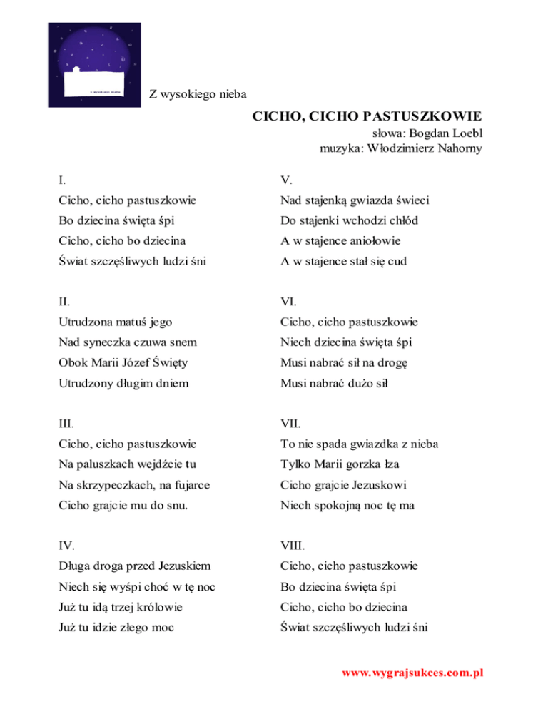 Z wysokiego nieba CICHO, CICHO PASTUSZKOWIE słowa: Bogdan Loebl muzyka: Włodzimierz Nahorny I. V. Cicho, cicho pastuszkowie Nad stajenką gwiazda świeci Bo dziecina święta śpi Do stajenki wchodzi chłód Cicho, cicho bo dziecina A w stajence aniołowie Świat szczęśliwych ludzi śni A w stajence stał się cud II. VI. Utrudzona matuś jego Cicho, cicho pastuszkowie Nad syneczka czuwa snem Niech dziecina święta śpi Obok Marii Józef Święty Musi nabrać sił na drogę Utrudzony długim dniem Musi nabrać dużo sił III. VII. Cicho, cicho pastuszkowie To nie spada gwiazdka z nieba Na paluszkach wejdźcie tu Tylko Marii gorzka łza Na skrzypeczkach, na fujarce Cicho grajcie Jezuskowi Cicho grajcie mu do snu. Niech spokojną noc tę ma IV. VIII. Długa droga przed Jezuskiem Cicho, cicho pastuszkowie Niech się wyśpi choć w tę noc Bo dziecina święta śpi Już tu idą trzej królowie Cicho, cicho bo dziecina Już tu idzie złego moc Świat szczęśliwych ludzi śni www.wygrajsukces.com.pl IX. Długa droga przed Jezuskiem Niech się wyśpi choć w tę noc Już tu idą trzej królowie Już tu idzie złego moc Nad stajenką gwiazda świeci Do stajenki wchodzi chłód A w stajence aniołowie A w stajence stał się cud X. Cicho, cicho bo dziecina Świat szczęśliwych ludzi śni www.wygrajsukces.com.pl