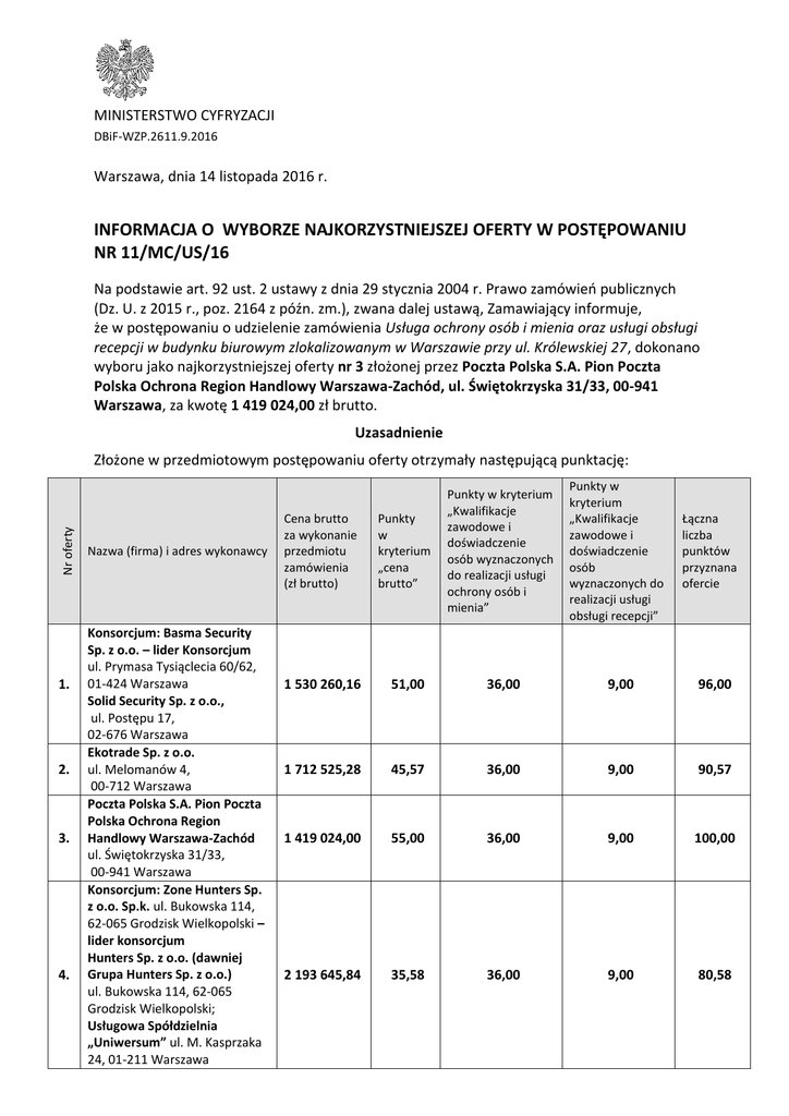 MINISTERSTWO CYFRYZACJI DBiF-WZP.2611.9.2016 Warszawa, dnia 14 listopada 2016 r. INFORMACJA O WYBORZE NAJKORZYSTNIEJSZEJ OFERTY W POSTĘPOWANIU NR 11/MC/US/16 Na podstawie art. 92 ust. 2 ustawy z dnia 29 stycznia 2004 r. Prawo zamówień publicznych (Dz. U. z 2015 r., poz. 2164 z późn. zm.), zwana dalej ustawą, Zamawiający informuje, że w postępowaniu o udzielenie zamówienia Usługa ochrony osób i mienia oraz usługi obsługi recepcji w budynku biurowym zlokalizowanym w Warszawie przy ul. Królewskiej 27, dokonano wyboru jako najkorzystniejszej oferty nr 3 złożonej przez Poczta Polska S.A. Pion Poczta Polska Ochrona Region Handlowy Warszawa-Zachód, ul. Świętokrzyska 31/33, 00-941 Warszawa, za kwotę 1 419 024,00 zł brutto. Uzasadnienie Nr oferty Złożone w przedmiotowym postępowaniu oferty otrzymały następującą punktację: 1. 2. 3. 4. Nazwa (firma) i adres wykonawcy Konsorcjum: Basma Security Sp. z o.o. – lider Konsorcjum ul. Prymasa Tysiąclecia 60/62, 01-424 Warszawa Solid Security Sp. z o.o., ul. Postępu 17, 02-676 Warszawa Ekotrade Sp. z o.o. ul. Melomanów 4, 00-712 Warszawa Poczta Polska S.A. Pion Poczta Polska Ochrona Region Handlowy Warszawa-Zachód ul. Świętokrzyska 31/33, 00-941 Warszawa Konsorcjum: Zone Hunters Sp. z o.o. Sp.k. ul. Bukowska 114, 62-065 Grodzisk Wielkopolski – lider konsorcjum Hunters Sp. z o.o. (dawniej Grupa Hunters Sp. z o.o.) ul. Bukowska 114, 62-065 Grodzisk Wielkopolski; Usługowa Spółdzielnia „Uniwersum” ul. M. Kasprzaka 24, 01-211 Warszawa Punkty w kryterium „Kwalifikacje zawodowe i doświadczenie osób wyznaczonych do realizacji usługi obsługi recepcji” Cena brutto za wykonanie przedmiotu zamówienia (zł brutto) Punkty w kryterium „cena brutto” Punkty w kryterium „Kwalifikacje zawodowe i doświadczenie osób wyznaczonych do realizacji usługi ochrony osób i mienia” 1 530 260,16 51,00 36,00 9,00 96,00 1 712 525,28 45,57 36,00 9,00 90,57 1 419 024,00 55,00 36,00 9,00 100,00 2 193 645,84 35,58 36,00 9,00 80,58 Łączna liczba punktów przyznana ofercie Nr oferty Nazwa (firma) i adres wykonawcy Cena brutto za wykonanie przedmiotu zamówienia (zł brutto) Punkty w kryterium „cena brutto” Punkty w kryterium „Kwalifikacje zawodowe i doświadczenie osób wyznaczonych do realizacji usługi ochrony osób i mienia” 5. Konsorcjum: Konsalnet Ochrona Sp. z o.o. ul. Jana Kazimierza 55, 01-267 Warszawa – lider Konsorcjum; Konsalnet Security Sp. z o.o. ul. Jana Kazimierza 55, 01-267 Warszawa 1 948 518,48 40,05 24,00 Ministerstwo Cyfryzacji ul. Królewska 27, 00-060 Warszawa Punkty w kryterium „Kwalifikacje zawodowe i doświadczenie osób wyznaczonych do realizacji usługi obsługi recepcji” 9,00 Łączna liczba punktów przyznana ofercie 73,05