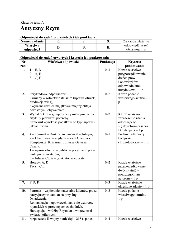 Klucz do testu A Antyczny Rzym Odpowiedzi do zadań zamkniętych i ich punktacja 6. 8. Numer zadania Właściwa D. B. odpowiedź 9. B. Za kaŜdą właściwą odpowiedź uczeń otrzymuje 1 p. Odpowiedzi do zadań otwartych i kryteria ich punktowania Nr Właściwa odpowiedź Punktacja Kryteria zad. punktowania 0–3 KaŜde właściwe 1. 1 – E, D 2 – A, B przyporządkowanie 3 – C, F dwóch praw i obowiązków odpowiedniemu urzędnikowi – 1 p. 0–2 KaŜde podanie 2. Przykładowe odpowiedzi: • zmiany w rolnictwie italskim (uprawa oliwek, właściwego skutku – 1 p. produkcja wina), • wyraźne róŜnice majątkowe między elitą a pozostałymi obywatelami. 0–2 KaŜde właściwe 3. Wydał dekret regulujący ceny maksymalne na artykuły pierwszej potrzeby. zaznaczenie zdania UzaleŜnił wysokość podatków od typu upraw i odnoszącego jakości ziemi. się do reform cesarza Dioklecjana – 1 p. 0–1 Podanie właściwej 4. 4 – dominat – Dioklecjan panem absolutnym, 2 – I triumwirat – rządy w rękach Gnejusza kolejności Pompejusza, Krassusa i Juliusza Gajusza chronologicznej – 1 p. Cezara, 1 – wprowadzenie republiki – przyznanie praw wolnym obywatelom, 3 – Juliusz Cezar – „dyktator wieczysty” 0–2 KaŜde właściwe 5. Horacy: A, D Tacyt: C, F przyporządkowanie dwóch tytułów poszczególnym autorom – 1 p. 0–3 KaŜde właściwie 7. F, P, F określone zdanie – 1 p. 0–3 KaŜde podanie 10. Patronat – wspieranie materialne klientów przez patrycjuszy w zamian za przysługi i właściwego terminu – świadczenia. 1 p. Romanizacja – upowszechnianie się wzorców rzymskich w prowincjach zachodnich. Haruspicja – wróŜby Rzymian z wnętrzności zwierząt ofiarnych. 0–4 KaŜde właściwe 11. rozpoczęcie II wojny punickiej – 218 r. p.n.e. 1 12. 13. 14. wybuch powstania w Judei – 66 r. n.e. klęska Macedonii w bitwie pod Pydną – 168 r. p.n.e. zwycięstwo Oktawiana w bitwie pod Akcjum 31 r. p.n.e. 395 r. n.e. Zaznaczenie na mapie terenów zasiedlonych przez Wandalów (północna Afryka) oraz Swewów (zachodnia Hiszpania). Zdjęcie ukazuje rybę, która w pierwszych wiekach chrześcijaństwa symbolizowała Chrystusa. przyporządkowanie – 1 p. 0–1 0–1 0–1 Podanie właściwej odpowiedzi – 1 p. Właściwe zaznaczenie terenów – 1 p. Podanie właściwej odpowiedzi – 1 p. 2