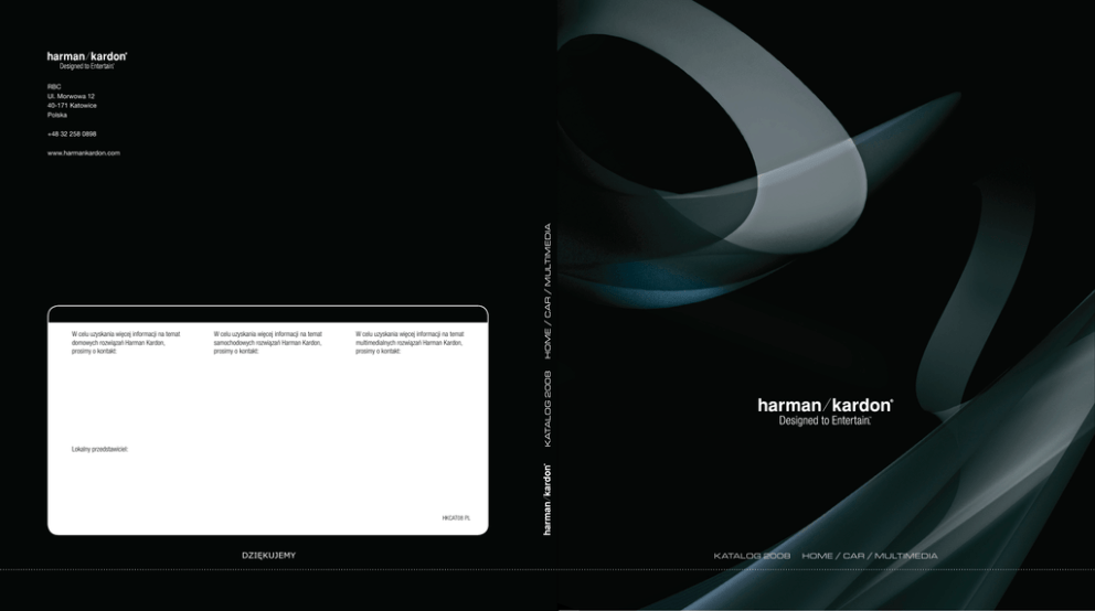RBC Ul. Morwowa 12 40-171 Katowice Polska +48 32 258 0898 W celu uzyskania więcej informacji na temat samochodowych rozwiązań Harman Kardon, prosimy o kontakt: W celu uzyskania więcej informacji na temat multimedialnych rozwiązań Harman Kardon, prosimy o kontakt: KATALOG 2008 W celu uzyskania więcej informacji na temat domowych rozwiązań Harman Kardon, prosimy o kontakt: HOME / CAR / MULTIMEDIA www.harmankardon.com Lokalny przedstawiciel: HKCAT08 PL DZIĘKUJEMY KATALOG 2008 HOME / CAR / MULTIMEDIA 02 SPIS ZAWARTOŚCI W DOMU 06 W SAMOCHODZIE 48 W RUCHU 56 DANE TECHNICZNE 60 PORÓWNANIE 69 03 WITAMY Jako firma produkująca sprzęt elektroniczny przeznaczony na rynek konsumencki, Harman Kardon w swojej działalności sięga czasów dźwięków mono i lamp elektronowych. A jednak nadal jesteśmy, ciągle w dobrej kondycji po ponad 50 latach, nadal kierowani przez założyciela, Dr. Sidneya Harmana oraz nadal dążymy swoją własną ścieżką, na swój własny sposób. Przez lata, produkty pod znakiem Harman Kardon® doprowadziły do przejścia od lamp elektronowych do elektroniki półprzewodnikowej, od mono do hi-fi oraz od formatów analogowych do cyfrowych. Z właściwościami, które często są przełomowe i działaniem zawsze wyznaczającymi najwyższe standardy, żaden inny produkt wcześniej nie wyglądał ani nie brzmiał tak jak elementy Harman Kardon. To droga, której zawsze pragnęliśmy. Tą drogą nadal kroczymy. 04 05 W DOMU 06 360° Rozrywki Systemy Harman Kardon Digital Lounge nie tylko otaczają nas dźwiękiem, otaczają nas najdoskonalszymi, najwyższej klasy wysokosprawnymi elementami by stworzyć całkowicie fascynujące doświadczenia widowiskowe z praktycznie każdego źródła. Ze znakomitym płaskim ekranem o wysokiej rozdzielczości, skomplikowanym systemem elektronicznym oraz zestawami kompaktowych solidnie zbudowanych multikanałowych głośników, zintegrowany system Digital Lounge połączy każdego z teraźniejszością i przyszłością rozrywki domowej z nieporównywalną łatwością ustawień i użytkowania. Udaje nam się również ustanawiać nowe zwycięskie standardy indurstrialnego wyglądu. 07 / DIGITAL LOUNGE W DOMU DL 646HD / DL 640HD / DL 632EX Na początek zdumiewający full-HD 117cm lub 102cm ekran lub 82cm ekran HD-ready. Dodajmy 5 x 65 watowy amplituner o wysokiej mocy z odtwarzaczem DVD-Audio ze zintergrowanym progresywnym skanowaniem, który pozwala na łatwe podłączanie odtwarzaczy MP3, konsoli gier, kamer, komputerów – praktycznie każdego urządzenia elektronicznego. Na koniec, zestaw głośników, zawierający cztery identyczne głośniki satelitarne z dwoma przetwornikami, zestrojony brzmieniowo głośnik centralny z dwoma przetwornikami oraz 200 watowy subwoofer. Domowe centrum rozrywki nigdy nie wyglądało ani nie brzmiało lepiej. 08 W DOMU DL 240HD / 232EX Ze wspaniałym 102cm płaskoekranowym telewizorem full HD lub przepięknym 82cm ekranem HD-ready , pełnofunkcyjny odtwarzacz/ nadajnik DVD wraz z eleganckim zestawem głośników, te systemy 2.1kanałowe Digital Lounge są w formacie wystarczająco kompaktowym by zabrać je prawie wszędzie. Jednak z technologią Dolby® Virtual Speaker wykonują swoje zadanie tak dobrze jak ich 5.1-kanałowi odpowiednicy. Nawiasem mówiąc, środki dopingujące działanie są problemem jedynie w sportach profesjonalnych, a nie w dziedzinie domowej rozrywki. DL Rack Stojak LCD dla systemów Digital Lounge 240 i 232 Zaprojektowany specjalnie dla telewizorów Digital Lounge do 102cm, z przystosowanymi do dużych obciążeń kółkami oraz tylnymi rurami do chowania kabli, stojak DL pozwala na precyzyjne dostosowanie wysokości, nachylenia i kąta ekranu aby obraz był idealny z każdego miejsca pokoju. 09 10 Zintegrowane systemy kina domowego Wchodzisz do kina, kupujesz popcorn i dobrze się bawisz. Proces oglądania filmów powinien być tak samo prosty w zaciszu domowym. Lecz bez domowych techników, którzy poradziliby sobie z ustawieniem systemu oraz rozwiązywaniem problemów, czy może to kiedykolwiek okazać się łatwe? Systemy kina domowego Harman Kardon sprawiają, że jest to łatwiejsze niż myślisz. Wraz z wysokosprawnym odbiornikiem A/V zestawionym w pojedynczy element kontrolowany za pomoca jednego pilota, idealnie dopasowany do kompletnych zestawów głośnikowym, Harman Kardon zaprojektował mało skomplikowany system kina domowego bez uszczerbku dla jego cenionej charakterystyki pracy. 11 / ZINTEGROWANE SYSTEMY KINA DOMOWEGO W DOMU HS 350 5 x 35W 5.1-Kanałowy Zintegrowany System Domowego Kina oraz Muzyki z HDMI™ i DivX® Wykorzystaj w pełni ekran wizyjny o wysokiej rozdzielczości Z konwertowaniem obrazu video piksel za pikselem oraz skalowaniem do 720p lub 1080i przez wyjście HDMI, filmy w formacie DVD osiągają najlepszą jakość Lecz tym, co wyróżnia HS 350 jest najwyższa jakość dźwięku . Wysokoprądowy amplituner z formatami Logic 7® oraz technologią EzSet/EQ™, jednorodnym, 360-stopniowym obrazowaniem poprzez pięć dwudrożnych głośników oraz wewnetrznym podbiciem subwoofera o mocy 200W, mocą i czystością każdego wejścia audio – DVD-Audio, CD oraz nagrywanych płyt DVD, nośników USB, nawet plików AAC czy MP3 z iPoda – może zaskoczyć każdego. 12 W DOMU HS 250 2 x 65W 2.1-Kanałowy Zintegrowany System Domowego Kina i Muzyki z HDMI, DivX oraz The Bridge Więcej rozrywki przy mniejszej ilości elementów. Ze skalowaniem obrazu do 720p i technologią Dolby Virtual Speaker, HS 250 dostarcza prawdziwie kinowych wrażeń każdej płyty DVD. Lecz ze złączem The Bridge oraz iPodem dla doskonałej jakości odtwarzania muzyki, HS 250 jest kompletnym, wysocesprawnym systemem rozrywki domowej. Wszystko to w jednym, kompaktowym opakowaniu. iPod nie jest dołączony do zestawu HS 200 2,1-Kanałowowy System Domowego Kina i Muzyki z HDMI i DivX Małe cudo. Technologia Dolby Virtual Speaker może stworzyć realne 5,1-kanałowe doświadcze