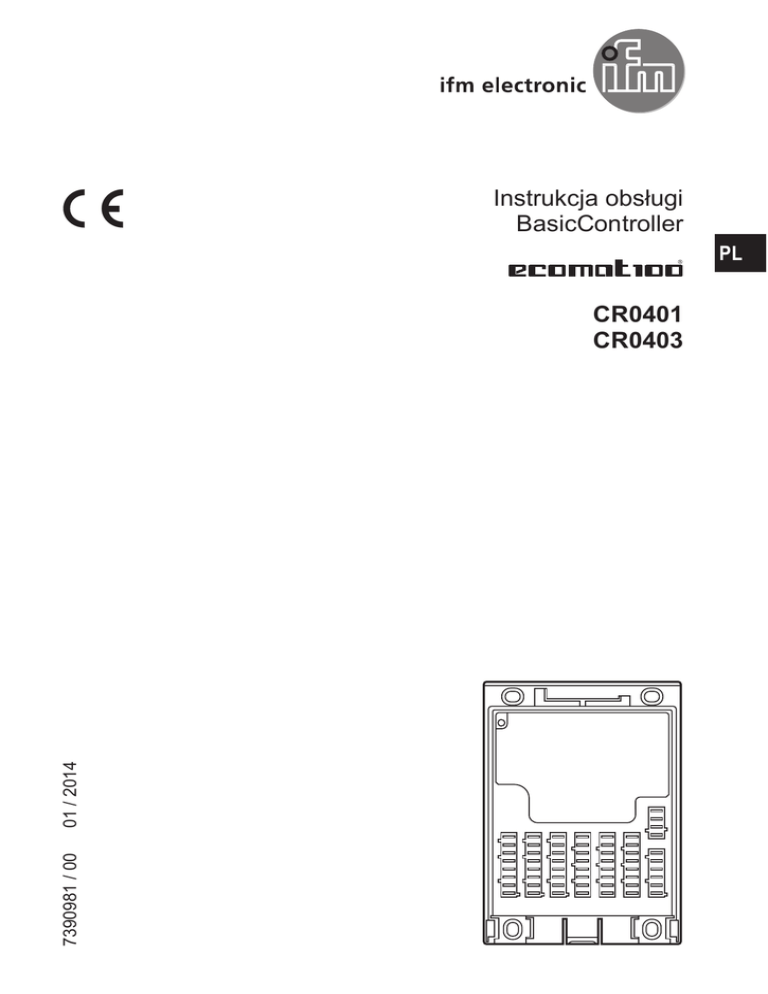 Instrukcja obsługi BasicController PL 7390981 / 00 01 / 2014 CR0401 CR0403 BasicController Spis treści 1 Uwaga wstępna��������������������������������������������������������������������������������������������������� 4 1.1 Symbole ����������������������������������������������������������������������������������������������������� 4 1.2 Użyte znaki ostrzegawcze��������������������������������������������������������������������������� 4 2 Instrukcje dotyczące bezpieczeństwa����������������������������������������������������������������� 5 2.1 Ogólne��������������������������������������������������������������������������������������������������������� 5 2.2 Grupa docelowa ����������������������������������������������������������������������������������������� 5 2.3 Podłączenie elektryczne����������������������������������������������������������������������������� 5 2.4 Ingerencja w urządzenie����������������������������������������������������������������������������� 5 3 Funkcje i własności��������������������������������������������������������������������������������������������� 6 3.1 Przegląd głównych danych������������������������������������������������������������������������� 6 3.2 Przykład zastosowania������������������������������������������������������������������������������� 6 3.3 Urządzenia serii produktów Basic (przykłady)��������������������������������������������� 7 4 Montaż����������������������������������������������������������������������������������������������������������������� 8 4.1 Ogólne instrukcje dotyczące montażu��������������������������������������������������������� 8 4.1.1 Stopień ochrony ��������������������������������������������������������������������������������� 8 4.1.2 Powierzchnia montażu����������������������������������������������������������������������� 8 4.2 Mocowanie ������������������������������������������������������������������������������������������������� 8 4.3 Pokrywa i uszczelnienie kablowe ������������������������������������������������������������� 10 4.3.1 Instalacja uszczelnienia kablowego ������������������������������������������������� 10 4.3.2 Demontaż uszczelnienia kablowego������������������������������������������������� 10 4.3.3 Instalacja pokrywy������������������������������������������������������������������������������11 4.3.4 Demontaż pokrywy����������������������������������������������������������������������������11 5 Podłączenie elektryczne �������������������������