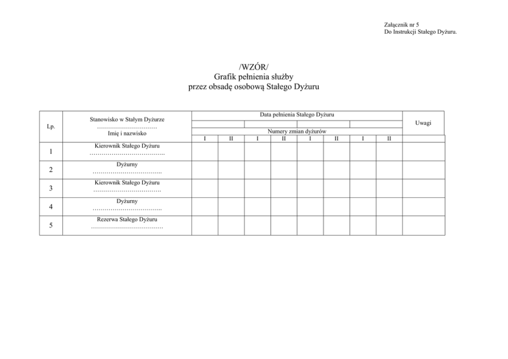 Załącznik nr 5 Do Instrukcji Stałego Dyżuru. /WZÓR/ Grafik pełnienia służby przez obsadę osobową Stałego Dyżuru Lp. Stanowisko w Stałym Dyżurze ………………………… Imię i nazwisko 1 Kierownik Stałego Dyżuru ……………………………….. 2 Dyżurny …………………………….. 3 Kierownik Stałego Dyżuru ……………………………. 4 Dyżurny …………………………….. 5 Rezerwa Stałego Dyżuru ……………………………… Data pełnienia Stałego Dyżuru Uwagi I II I Numery zmian dyżurów II I II I II