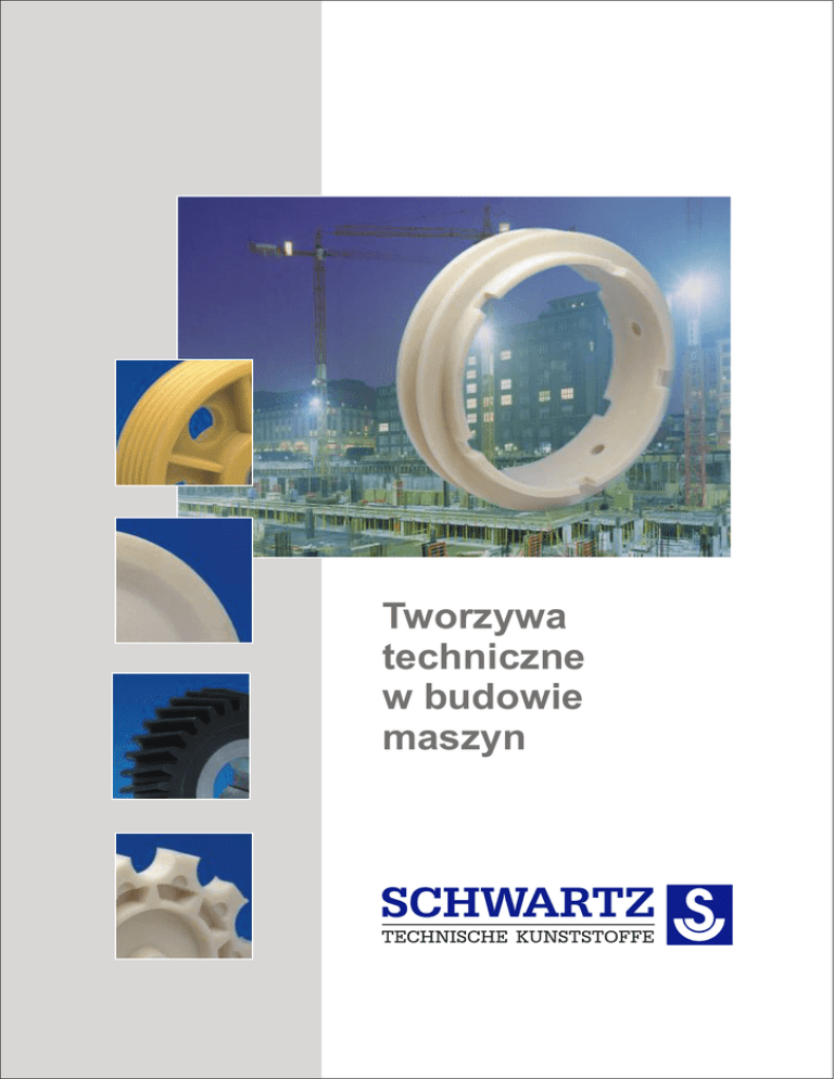 Tworzywa techniczne w budowie maszyn Wasze wymagania to dla nas wyzwanie W ostatnich dekadach podzespo³y wykonane z wysokiej jakoœci tworzyw sztucznych maj¹ coraz wiêksze znaczenia w produkcji maszyn i urz¹dzeñ. Tendencja ta jest silnie widoczna g³ównie w ostatnich kilku latach. Za³o¿ona w 1924 roku firma Schwartz by³a pierwszym europejskim producentem niemetalicznych ³o¿ysk œlizgowych przeznaczonych dla walcowni blach. Dziœ jest wiod¹cym producentem technicznych tworzyw sztucznych oraz rzetelnym partnerem przemys³u w tej dynamicznie rozwijaj¹cej siê dziedzinie. Zastrze¿one znaki handlowe LAMIGAMID ®, LAMINEX ® oraz OPTAMID ® to nazwy doskona³ych termo- i duroplastów, znanych na ca³ym œwiecie ze swojej wysokiej jakoœci. Wœród ich zalet mo¿na wymieniæ: + niski ciê¿ar w³aœciwy, + du¿¹ sztywnoœæ i twardoœæ, + wysoki wspó³czynnik odpornoœci na uderzenia nawet przy niskich temperaturach, + odpornoœæ na tarcie i œcieranie, + doskona³e w³aœciwoœci œlizgowe i pracy przy skrajnych obci¹¿eniach, + odpornoœæ na korozjê, + brak lub bardzo nisk¹ absorpcjê wilgoci, + dobr¹ do bardzo dobrej odpornoœæ na chemikalia i hydrolizê, + stabilnoœæ wymiarów, + praktycznie nieograniczon¹ ró¿norodnoœæ wymiarów i kszta³tów, + minimalne wymagania konserwacyjne. LAMIGAMID® LAMINEX® OPTAMID ® Dziêki swoim doskona³ym w³aœciwoœciom mog¹ byæ u¿yte w bardzo ró¿nych urz¹dzeniach Nasz wk³ad w wynalezienie ko³a Ko³a linowe, pasowe oraz klinowe stosowane w ró¿norakich ¿urawiach oraz w systemach transportowych i windach to klasyka naszej oferty skierowana do bran¿y dŸwigowej i transportowej. Nasze produkty znajduj¹ tak¿e zastosowanie w urz¹dzeniach budowlanych, podnoœnikach wid³owych, urz¹dzeniach linowych, maszynach i sprzêcie rolniczym, urz¹dzeniach do produkcji papieru, systemach sk³adowania i lokalizacji dla magazynów, wagonikach linowych, transporcie ci¹g³ym i wielu innych. W zale¿noœci od indywidualnych potrzeb ko³a linowe oraz pasowe klinowe produkowane s¹ z gatunków LAMIGAMIDu ® od 300 do 324/327 oraz 1200. Ko³a linowe odchylaj¹ce w dŸwigach s¹ wykonane z tworzywa OPTAMID ®. Produkcja kó³ pasowych linowych z powy¿szych materia³ów ma niew¹tpliwe zalety: s¹ one o wiele l¿ejsze ni¿ te, z tradycyjnych materia³ów, emituj¹ mniej ha³asu, s¹ odporne na warunki pogodowe i korozjê, a tak¿e poch³aniaj¹ drgania, uderzenia i szarpniêcia. Od ponad 70 lat zajmujemy siê produkcj¹ ³o¿ysk, tarcz oraz innych elementów œlizgowych. Jesteœmy ich dostawc¹ dla zak³adów przetwórstwa minera³ów, maszyn budowlanych, teleskopów samojezdnych ¿urawi, przenoœników, ³adowarek, zak³adów rozlewniczych i przetwórstwa drewna, pojazdów g¹sienicowych, podnoœników wid³owych oraz osprzêtu walcowni. Dysponujemy szerok¹ gam¹ materia³ów, z których dobieramy najlepsze takie, które nadaj¹ siê do ka¿dego konkretnego zastosowania: LAMIGAMID ® 310, 314, 319, 510, 600, 700, 1200. LAMINEX ® 2000, 2010, 2085 lub 2088. Wymienione materia³y przeznaczone s¹ do du¿ych obci¹¿eñ, s¹ tak¿e odporne na œcieranie i tarcie. Niektóre maj¹ w³aœciwoœci samosmaruj¹ce i charakteryzuj¹ siê œwietnymi w³asnoœciami ciernymi nawet na sucho. W zale¿noœci od zastosowania i u¿ytego materia³u, maksymalne dopuszczalne ciœnienie powierzchniowe plasuje siê miêdzy 25 a 90 N/mm2 (dla ³o¿ysk œlizgowych obracaj¹cych siê z prêdkoœci¹ do 3,5 m/s). Funkcja okreœla kszta³t Szeroka gama podzespo³ów wykonanych z technicznych tworzyw sztucznych jest ju¿ stosowana np. w: zasobnikach przenoœników wstrz¹sowych wibracyjnych, tarczach oporowych dla ¿urawi samojezdnych oraz tarczach dozuj¹cych wtryskarek pokazanych na tej stronie. Te i wiele innych elementów idealnie nadaj¹ siê do odlewania w formach. Komponenty do œrednich i du¿ych maszyn, nawet te o skomplikowanych kszta³tach, mog¹ byæ produkowane w ten sposób z zachowaniem rentownoœci. Dziêki temu obróbka mechaniczna zostaje ca³kowicie wyeliminowana lub przynajmniej w znacznym stopniu ograniczona. Zastosowanie naszych tworzyw sztucznych jest korzystne z wielu powodów: + podzespo³y z tworzyw LAMIGAMID® i OPTAMID® s¹ znacznie l¿ejsze od odpowiedników wykonanych z metalu, + wytrzymuj¹ du¿e obci¹¿enia, + wykazuj¹ d³u¿sz¹ ¿ywotnoœæ ni¿ ich odpowiedniki wykonane z innych materia³ów, + podzespo³y wykonane z tworzywa LAMIGAMID® oraz OPTAMID® cechuje cicha praca oraz redukcja wibracji i drgañ, + tworzywa techniczne firmy Schwartz mog¹ byæ stosowane w szerokim zakresie temperatur, + s¹ ekologiczne i nadaj¹ siê do recyklingu. LAMIGAMID ® 1200 LAMIGAMID ® 1200 (PA 12 G) to jeden z wa¿niejszych produktów w naszej bogatej ofercie technicznych tworzyw sztucznych. LAMIGAMID ® 1200 (PA 12 G) jest wysokowydajnym poliamidem, cenionym za swoje nadzwyczajne w³aœciwoœci i odpornoœæ na dzia³anie œrodków chemicznych. Nadaje siê przede wszystkim do stosowania w napêdach i obrabiarkach. Materia³ ten idealnie sprawdza siê w ko³ach zêbatych, œlimakowych, ³añcuchowych i zwrotnych, a tak¿e w wielu innych zastosowaniach, w których wczeœniej nie móg³ byæ wykorzystany z powodu ograniczeñ technicznych. Wiêcej o tym materiale mo¿na dowiedzieæ siê z broszury „LAMIGAMID ® 1200”. Napêdzani innowacjami Elementy napêdów, takie jak ko³a zêbate i ³añcuchowe, s¹ stosowane w ró¿nych ga³êziach przemys³u: oczyszczalniach œcieków, sprzêcie transportowym, maszynach do produkcji napojów, papieru i tekstyliów, robotach i obrabiarkach oraz wielu innych. LAMIGAMID ® w gatunkach od 300 do 319 oraz 1200 (PA 12G), a tak¿e LAMINEX ® 2101 doskonale sprawdzaj¹ siê w produkcji podzespo³ów do wy¿ej wymienionych ga³êzi przemys³u, posiadaj¹ tak¿e wiêcej zalet ni¿ takie same elementy z metalu. Dziêki niskiemu ciê¿arowi w³aœciwemu, elementy napêdowe wykonane z tworzyw LAMIGAMID ® i LAMI