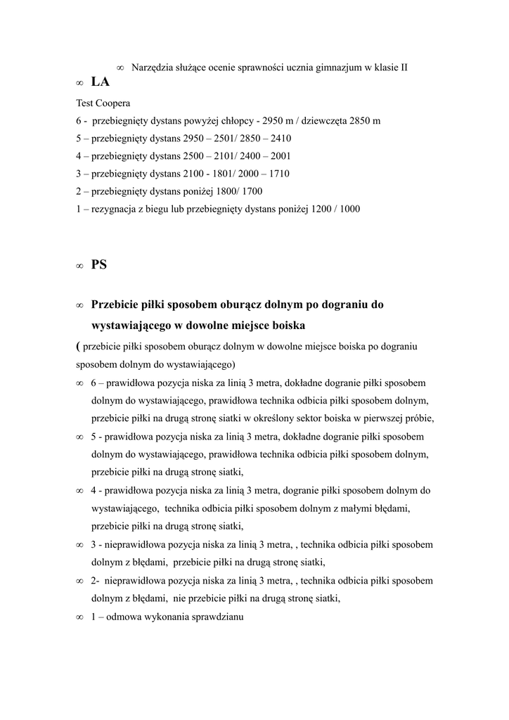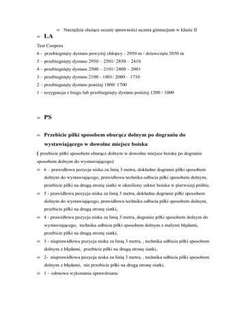• LA • Narzędzia służące ocenie sprawności ucznia gimnazjum w klasie II Test Coopera 6 - przebiegnięty dystans powyżej chłopcy - 2950 m / dziewczęta 2850 m 5 – przebiegnięty dystans 2950 – 2501/ 2850 – 2410 4 – przebiegnięty dystans 2500 – 2101/ 2400 – 2001 3 – przebiegnięty dystans 2100 - 1801/ 2000 – 1710 2 – przebiegnięty dystans poniżej 1800/ 1700 1 – rezygnacja z biegu lub przebiegnięty dystans poniżej 1200 / 1000 • PS • Przebicie piłki sposobem oburącz dolnym po dograniu do wystawiającego w dowolne miejsce boiska ( przebicie piłki sposobem oburącz dolnym w dowolne miejsce boiska po dograniu sposobem dolnym do wystawiającego) • 6 – prawidłowa pozycja niska za linią 3 metra, dokładne dogranie piłki sposobem dolnym do wystawiającego, prawidłowa technika odbicia piłki sposobem dolnym, przebicie piłki na drugą stronę siatki w określony sektor boiska w pierwszej próbie, • 5 - prawidłowa pozycja niska za linią 3 metra, dokładne dogranie piłki sposobem dolnym do wystawiającego, prawidłowa technika odbicia piłki sposobem dolnym, przebicie piłki na drugą stronę siatki, • 4 - prawidłowa pozycja niska za linią 3 metra, dogranie piłki sposobem dolnym do wystawiającego, technika odbicia piłki sposobem dolnym z małymi błędami, przebicie piłki na drugą stronę siatki, • 3 - nieprawidłowa pozycja niska za linią 3 metra, , technika odbicia piłki sposobem dolnym z błędami, przebicie piłki na drugą stronę siatki, • 2- nieprawidłowa pozycja niska za linią 3 metra, , technika odbicia piłki sposobem dolnym z błędami, nie przebicie piłki na drugą stronę siatki, • 1 – odmowa wykonania sprawdzianu • Wykonanie zagrywki tenisowej z dowolnego miejsca na boisku w dowolny sektor • 6 – wykonanie zagrywki prawidłową techniką zza linii końcowej boiska w określony sektor ( zagrywka po prostej i po skosie) w dwóch próbach • 5 - wykonanie zagrywki prawidłową techniką zza linii końcowej boiska w dowolny sektor w dwóch próbach • 4 - wykonanie zagrywki z małymi błędami zza linii końcowej boiska w dowolny sektor w dwóch próbach • 3 - wykonanie zagrywki z małymi błędami z dowolnego miejsca na boisku w dowolny sektor w dwóch próbach • 2 – próba wykonania zagrywki tenisowej bez skutecznego przejścia piłki na drugą stronę boiska w dwóch próbach • 1 - odmowa wykonania sprawdzianu PN • Uderzenie piłki do bramki po zwodzie pojedynczym wykonanym w biegu po podaniu piłki do partnera • 6 – poprawne technicznie przyjęcie piłki i wykonanie zwodu pojedynczego, strzał celny na bramkę górą • 5 - poprawne technicznie przyjęcie piłki i wykonanie zwodu pojedynczego, strzał celny na bramkę po ziemi • 4 - technicznie przyjęcie piłki i wykonanie zwodu pojedynczego z małymi błędami, strzał celny na bramkę po ziemi • 3 - technicznie przyjęcie piłki i wykonanie zwodu pojedynczego z małymi błędami, strzał niecelny na bramkę po ziemi • 2 – niepoprawne technicznie przyjęcie piłki i wykonanie zwodu pojedynczego, strzał niecelny na bramkę po ziemi • 1 - odmowa wykonania sprawdzianu • KOSZYKÓWKA • Zwód pojedynczy w biegu po podaniu piłki do partnera - piwot • 6 - zatrzymanie na jedno lub dwa tempa w pozycji koszykarskiej po otrzymaniu piłki od • partnera, wykonanie prawidłowo technicznie zwodu na określoną stronę, prawidłowe • rozpoczęcie poruszania się z piłką. Ćwiczenie wykonane płynnie w szybkim tempie. • 5 - zatrzymanie na jedno lub dwa tempa w pozycji koszykarskiej po otrzymaniu piłki od • partnera, wykonanie prawidłowo technicznie zwodu na określoną stronę, prawidłowe • rozpoczęcie poruszania się z piłką. • 4 - zatrzymanie na jedno lub dwa tempa w pozycji koszykarskiej po otrzymaniu piłki od • partnera, wykonanie prawidłowo technicznie zwodu na określoną stronę , prawidłowe • rozpoczęcie poruszania się z piłką. Ćwiczenie wykonane mało dynamicznie. • 3 - zatrzymanie na jedno lub dwa tempa w pozycji koszykarskiej po otrzymaniu piłki od • partnera, wykonanie prawidłowo technicznie zwodu na określoną stronę , prawidłowe • rozpoczęcie poruszania się z piłką. Ćwiczenie wykonane mało dynamicznie w sposób • nieskoordynowany. • 2 - sprawdzian wykonany nieprawidłowo technicznie z dużymi błędami. • 1 - odmowa wykonania sprawdzianu • Zwód pojedynczy zakończony rzutem z biegu • 6 - zatrzymanie na jedno lub dwa tempa w pozycji koszykarskiej po otrzymaniu piłki od • partnera, wykonanie prawidłowo technicznie zwodu na określoną stronę, prawidłowe • rozpoczęcie poruszania się z piłką zakończone celnym rzutem z biegu. Ćwiczenie • wykonane płynnie w szybkim tempie. • 5 - zatrzymanie na jedno lub dwa tempa w pozycji koszykarskiej po otrzymaniu piłki od • partnera, wykonanie prawidłowo technicznie zwodu na określoną stronę, prawidłowe • rozpoczęcie poruszania się z piłką zakończone celnym rzutem z biegu. • 4 - zatrzymanie na jedno lub dwa tempa w pozycji koszykarskiej po otrzymaniu piłki od • partnera, wykonanie prawidłowo technicznie zwodu na określoną stronę , prawidłowe • rozpoczęcie poruszania się z piłką zakończone rzutem z biegu. Ćwiczenie wykonane mało • dynamicznie. • 3 - zatrzymanie na jedno lub dwa tempa w pozycji koszykarskiej po otrzymaniu piłki od • partnera, wykonanie prawidłowo technicznie zwodu na określoną stronę , prawidłowe • rozpoczęcie poruszania się z piłką zakończone rzutem z biegu. Ćwiczenie wykonane mało • dynamicznie w sposób nieskoordynowany. • 2 - sprawdzian wykonany nieprawidłowo technicznie z dużymi błędami. • 1 – odmowa wykonania sprawdzianu • GIMNASTYKA Układ ćwiczeń równoważnych • • Wykonać dowolny krótki układ gimnastyczny na równoważni z wykorzystaniem chodów, zwrotów, siadów, skoków. • 6 – wykonanie prawidłowo techniczn