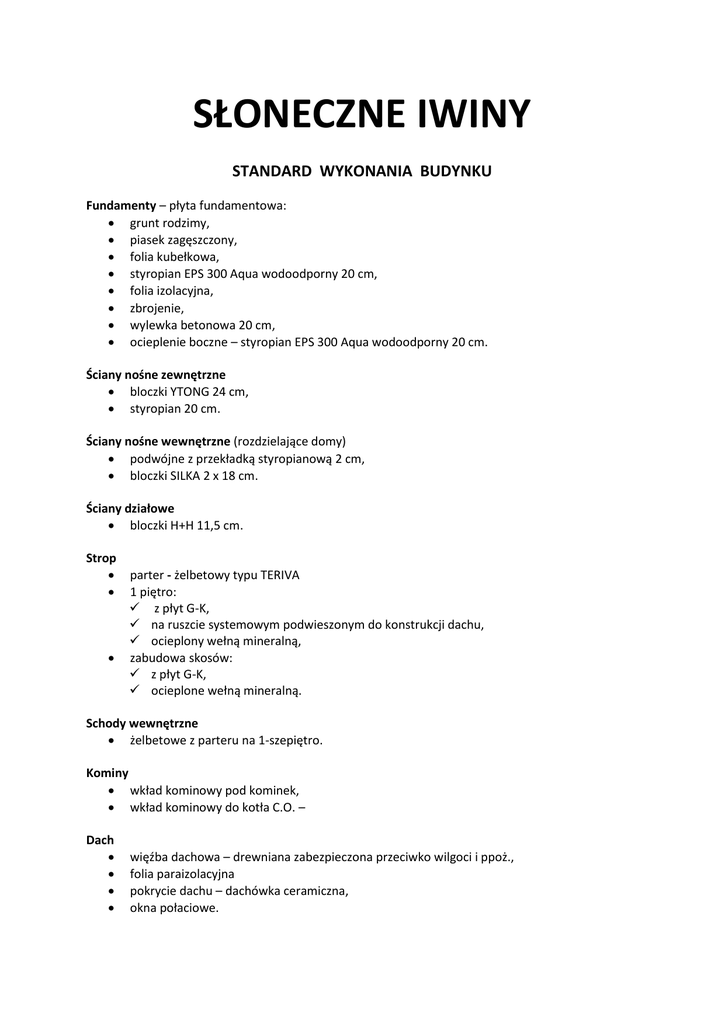 SŁONECZNE IWINY STANDARD WYKONANIA BUDYNKU Fundamenty – płyta fundamentowa: grunt rodzimy, piasek zagęszczony, folia kubełkowa, styropian EPS 300 Aqua wodoodporny 20 cm, folia izolacyjna, zbrojenie, wylewka betonowa 20 cm, ocieplenie boczne – styropian EPS 300 Aqua wodoodporny 20 cm. Ściany nośne zewnętrzne bloczki YTONG 24 cm, styropian 20 cm. Ściany nośne wewnętrzne (rozdzielające domy) podwójne z przekładką styropianową 2 cm, bloczki SILKA 2 x 18 cm. Ściany działowe bloczki H+H 11,5 cm. Strop parter - żelbetowy typu TERIVA 1 piętro: z płyt G-K, na ruszcie systemowym podwieszonym do konstrukcji dachu, ocieplony wełną mineralną, zabudowa skosów: z płyt G-K, ocieplone wełną mineralną. Schody wewnętrzne żelbetowe z parteru na 1-szepiętro. Kominy wkład kominowy pod kominek, wkład kominowy do kotła C.O. – Dach więźba dachowa – drewniana zabezpieczona przeciwko wilgoci i ppoż., folia paraizolacyjna pokrycie dachu – dachówka ceramiczna, okna połaciowe. 2 Poddasze zabudowa połaci dachowych poddasza – płyty G-K, ocieplenie połaci dachowych poddasza – wełna mineralna. Elewacja tynk cienkowarstwowy, boazeria drewniana, rynny i opierzenie, parapety zewnętrzne. Okna i drzwi stolarka okienna: PVC, trzywarstwowa szyba, na parterze rolety, drzwi zewnętrzne wejściowe antywłamaniowe, brama garażowa segmentowa sterowana pilotem. Przyłącza woda, kanalizacja, prąd, gaz, linia telefoniczna. STANDARD DEWELOPERSKI Tynki wewnętrzne ściany - maszynowe gipsowe, strop parteru – maszynowe gipsowe. Posadzki jastrych cementowy. Instalacje wodna - rozprowadzona po budynku, zakooczona podejściami pod urządzenia, kanalizacyjna – w systemie rur PCV , rozprowadzona po budynku, zakooczona podejściami pod urządzenia, elektryczna - z osprzętem (gniazdka, włączniki)/rozprowadzona po budynku, zakooczona podejściami pod gniazdka i wyłączniki oraz kuchnię elektryczną, gazowa – doprowadzona do kotłowni (wraz z kotłem gazowym), c.o. – kocioł dwufunkcyjny z zasobnikiem i regulacją pogodową, instalacja podłogowa, RTV – gniazdo antenowe TV, Zagospodarowanie terenu ogrodzenie podjazdy, chodniki i taras – kostka betonowa, zieleo – wyrównanie terenu humusem.