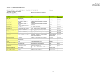 Z2/PS-07.04 edycja procedury: 4 edycja załącznika: 2 Załącznik nr 2-Szkolny zestaw podręczników ZESPÓŁ SZKÓŁ NR 1 IM. WŁADYSŁAWA GRABSKIEGO W LUBLINIE Technikum Ekonomiczno-Handlowe rok szkolny 2016/2017 Wychowawca: Małgorzata Biernacka Zawód: technik ekonomista Klasa 4ct Tytuł Wydawnictwo Nr dopuszczenia M. Chmiel, A. Równy Ponad słowami klasa III Nowa Era 425/3/2013 M. Umińska, B. Hastings, D. Chandler M. Umińska, B. Hastings, D. Chandler S. Rapacka, M. Lewandowska, J. Nawrotkiewicz Longman repetytorium maturalne 2015 poziom podstawowy Longman repetytorium maturalne 2015 poziom podstawowy Pearson 696/2014 Pearson 696/2014 Hier und da 3 (kontynuacja) PWN 332/3/2013 j. niemiecki gr.2 A. Kryczyńska-Pham, J. Szczęk Abitur – poziom podstawowy (kontynuacja) WSiP 676/2014 historia i społeczeństwo - p. uzupełniający M. Markowicz, O. Pytlińska, A. Wyroda M. Markowicz, O. Pytlińska, A. Wyroda Historia i społeczeństwo. Rządzący i rządzeni. Podręcznik do liceum i technikum. Historia i społeczeństwo. Europa i świat. Podręcznik do liceum i technikum. WSiP 667/4/2013 WSiP 667/1/2013 matematyka M. Kurczab, E. Kurczab, E. Świda Matematyka. Podręcznik do liceów i techników. Klasa 3. Zakres podstawowy Oficyna Edukacyjna Krzysztof Pazdro 412/3/2012 geografia rozszerzona Z. Zaniewicz Geografia „Ciekawi świata 3” cz. 2 Polski Z.R OPERON 502/4/2015 wf bez podręcznika religia R. Lis Z Chrystusem na drogach życia Gaudium sprawozdawczość i analiza finansowa Grażyna Borowska Sprawozdawczość i analiza finansowa WSIP 64/2013 rachunkowość I. Borowska, I. Frymark Ksiegowość i kalkulacja cz 2 WSiP 62/2013 pracownia rachunkowości Bożena Padurek "Biuro rachunkowe", " Rachunkowość Finansowa cz. Bożena Padurek III" język angielski zawodowy R. Richey English for banking and finance 2 Przedmiot Autor podręcznika godz. wych bez podręcznika j. polski j. angielski gr.1 j. angielski gr.2 j. niemiecki gr.1 Pearson Longman 1z1