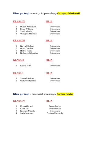 Klasa perkusji – nauczyciel prowadzący Grzegorz Masłowski KLASA IV 1 2 3 4 Dudek Arkadiusz Pajor Wiktoria Stach Marcin Waligóra Mateusz KLASA III 1 2 3 4 Burgiel Hubert Orzeł Damian Hołyst Iwona Bednarek Sebastian KLASA II 1 Rokita Filip KLASA I 1 2 Stanuch Wiktor Gołąb Małgorzata FILIA Dobrociesz Dobrociesz Dobrociesz Dobrociesz FILIA Dobrociesz Dobrociesz Dobrociesz Dobrociesz FILIA Dobrociesz FILIA Dobrociesz Dobrociesz Klasa perkusji – nauczyciel prowadzący Bartosz Sałdan KLASA IV 1 2 3 4 Kornaś Paweł Koza Jan Kurzacz Mikołaj Jania Mateusz FILIA Domosławice Domosławice Dobrociesz Porąbka Uszewska KLASA III 1 2 3 Pachel Krzysztof Łach Katarzyna Topolski Tomasz 4 Styrna Ksawery KLASA II 1 Piech Michał 2 Sowa Jakub 3 Dzień Antoni KLASA I 1 2 3 Pattocy Patryk Wojakiewicz Krystian Skwarło Hubert 4 Morys Filip 5 Gurgul Norbert FILIA Domosławice Domosławice Domosławice Porąbka Uszewska FILIA Domosławice Porąbka Uszewska Porąbka Uszewska FILIA Domosławice Domosławice Domosławice Porąbka Uszewska Porąbka Uszewska Klasa perkusji – nauczyciel prowadzący Grzegorz Jakieła KLASA IV 1 2 3 4 5 6 7 8 Mikos Patryk Uchwat Michał Turska Gabriela Wójcik Max Piotr Pajor Wójcik Jakub Grzegorz Garncarek Chorabik Brajan FILIA Gromnik Gromnik Gromnik Gromnik Gromnik Gromnik Gromnik Gromnik KLASA III 1 2 Gancarczyk Natalia Wolszczuk Łukasz KLASA II 1 Hołda Maksymilian FILIA Gromnik Gromnik FILIA Gromnik Klasa perkusji – nauczyciel prowadzący Łukasz Romański KLASA IV 1 2 3 4 Gąsior Jakub Bartosik Jakub Górecki Mateusz Konarski Kacper KLASA II 1 2 Ludwa Marek Śliwa Mateusz KLASA I 1 2 3 4 5 6 7 8 9 10 Kogut Filip Ludwa Maciej Batko Kacper Niemiec Bartosz Szkarłat Piotr Pałka Nina Szkarłat Dawid Chochliński Bartosz Weber Artur Dąbrowski Hubert FILIA Gromnik Gromnik Gromnik Gromnik FILIA Milówka Milówka FILIA Milówka Milówka Milówka Milówka Tęgoborze Tęgoborze Tęgoborze Tęgoborze Tęgoborze Tęgoborze