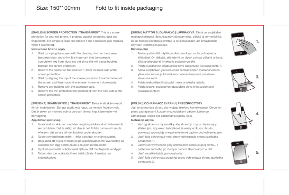 Size: 150*100mm Fold to fit inside packaging [ENGLISH] SCREEN PROTECTION | TRANSPARENT. This is a screen protection for your cell phone. It protects against scratches, dust and fingerprints. It is simple to fixate and remove it and it leaves no glue residues when it is removed. Instructions how to apply 1. Start by wiping the screen with the cleaning cloth so the screen becomes clean and shiny. It is important that the screen is completely free from dust and dirt since this will cause bubbles beneath the screen protection. 2. Remove the protection film (marked 1) from the back side of the screen protection. 3. Start by aligning the top of the screen protection towards the top of the screen and then mount it in an even movement downwards. 4. Remove any bubbles with the squeegee card. 5. Remove the thin protection film (marked 2) from the front side of the screen protection. [SUOMI] NÄYTÖN SUOJAKALVO | LÄPINÄKYVÄ. Tämä on suojakalvo matkapuhelimeesi. Se suojaa näyttöä naarmuilta, pölyltä ja sormenjäljiltä. Se on helppo kiinnittää ja irrottaa ja se ei myöskään jätä liimajäänteitä näyttöön irrottamisen jälkeen. Kiinnitysohje 1. Aloita pyyhkimällä näyttö puhdistuskankaan avulla puhtaaksi ja kiiltäväksi. On tärkeää, että näyttö on täysin puhdas pölystä ja liasta, sillä ne aiheuttavat ilmakuplia suojakalvon alle. 2. Poista suojakalvon takapuolella oleva suojamuovi (kuvassa kohta 1). 3. Aseta suojakalvon yläreuna ensin samaan linjaan matkapuhelimen yläreunan kanssa ja kiinnitä kalvo edeten tasaisesti puhelimen alareunaa kohti. 4. Poista mahdolliset ilmakuplat mukana tulleella lastalla. 5. Poista lopuksi suojakalvon etupuolella oleva ohut suojamuovi (kuvassa kohta 2). [SVENSKA] SKÄRMSKYDD | TRANSPARENT. Detta är ett skärmskydd för din mobiltelefon. Det ger skydd mot repor, damm och fingeravtryck. Det är enkelt att montera och ta bort och lämnar inga klisterrester vid borttagning. Applikationsanvisning 1. Torka först av skärmen med den rengöringsduken så att skärmen blir ren och blank. Det är viktigt att den är helt fri från damm och smuts eftersom det annars blir det bubblor under skyddet. 2. Ta bort skyddsfilmen (märkt 1) från baksidan av skärmskyddet. 3. Börja med att linjera överkanten på skärmskyddet mot överkanten på skärmen och lägg sedan på det i en jämn rörelse nedåt. 4. Tryck ut eventuella bubblor med hjälp av det medföljande verktyget. 5. Ta bort den tunna skyddsfilmen (märkt 2) från framsidan av skärmskyddet. [POLSKI] OCHRANIACZ EKRANU | PRZEZROCZYSTY Jest to ochraniacz ekranu dla twojego telefonu komórkowego. Chroni on przed zadrapaniami, kurzem oraz odciskami palców. Łatwo go zamocować i zdjąć bez zostawiania śladów kleju. Instrukcje użycia 1. Wytrzyj ekran suchą szmatką, aby ekran był czysty i błyszczący. Ważne jest, aby ekran był całkowicie wolny od kurzu i brudu, ponieważ spowodują one pojawienie się bąblów pod ochraniaczem. 2. Usuń folię ochronną z tylnej strony ochraniacza ekranu (zakładka oznaczona 1). 3. Zacznij od wyrównania góry ochraniacza ekranu z górą ekranu, a następnie zamontuj go równym ruchem skierowanym w dół. 4. Usuń wszelkie bąble gumową kartą. 5. Usuń folię ochronną z przedniej strony ochraniacza ekranu (zakładka oznaczona 2). 1. 3. 4. 5.