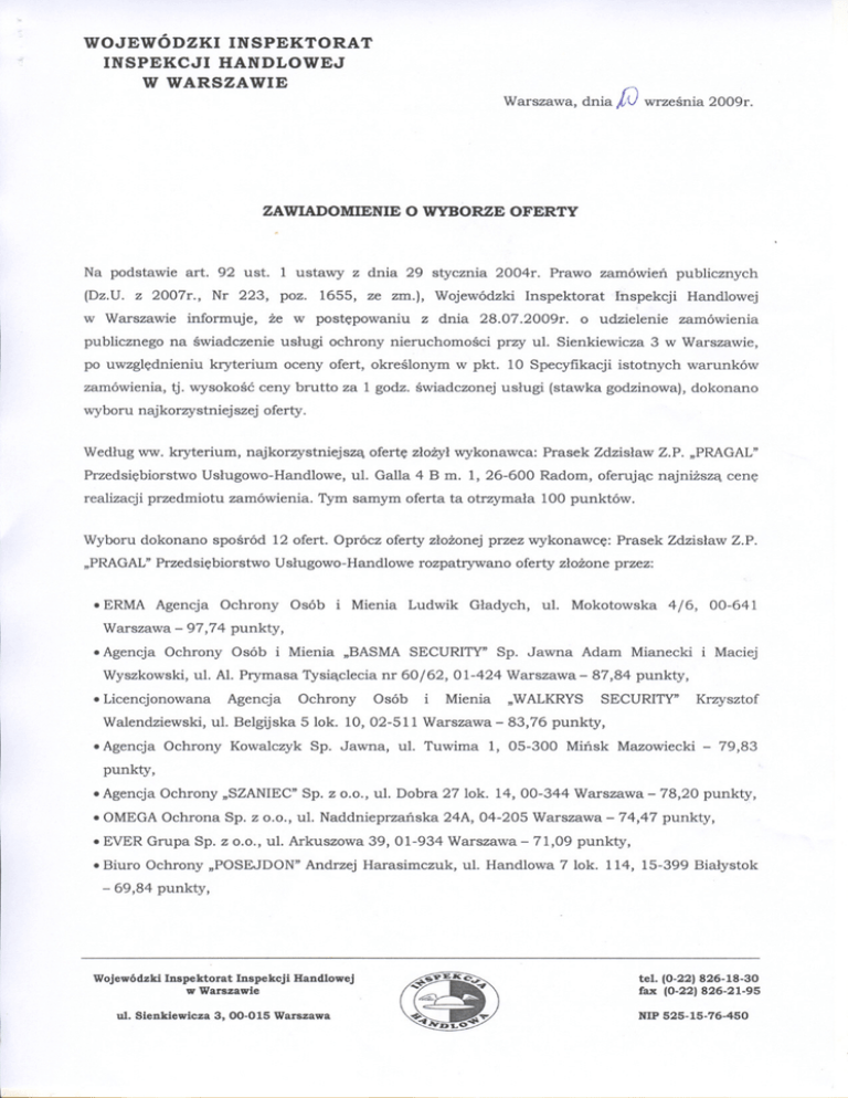 '" WOJEWÓDZKI INSPEKTORAT INSPEKCJI HANDLOWEJ W WARSZA WI E f;J wrzesnia Warszawa, dnia ZAWIADOMIENIE Na podstawie (Dz.U. z 2007r., w Warszawie publicznego ust. Nr 223, 1655, ze zm.), ze w postepowaniu na swiadczenie uslugi kryterium tj. wysokosc O WYBORZE OFERTY 1 ustawy z dnia 29 stycznia poz. informuje, po uwzglednieniu zamówienia, 92 art. ochrony wyboru najkorzystniejszej 2004r. Wojewódzki z dnia Prawo Handlowej o udzielenie 10 Specyfikacji uslugi publicznych Inspekcji przy ul. Sienkiewicza w pkt. za 1 godz. swiadczonej zamówien Inspektorat 28.07.2009r. nieruchomosci oceny ofert, okreslonym ceny brutto 2009r. (stawka zamówienia 3 w Warszawie, istotnych warunków godzinowa), dokonano oferty. Wedlug ww. kryterium, najkorzystniejsza Przedsiebiorstwo Uslugowo-Handlowe, oferte zlozyl wykonawca: Prasek Zdzislaw Z.P. "PRAGAL" ul. Galla 4 B m. 1, 26-600 Radom, oferujac najnizsza cene realizacji przedmiotu zamówienia. Tym samym oferta ta otrzymala 100 punktów. Wyboru dokonano sposród 12 ofert. Oprócz oferty zlozonej przez wykonawce: Prasek Zdzislaw Z.P. "PRAGAL"Przedsiebiorstwo Uslugowo-Handlowe rozpatrywano oferty zlozone przez: . ERMA Agencja Ochrony Osób i Mienia Ludwik Gladych, ul. Mokotowska 4/6, 00-641 Warszawa - 97,74 punkty, . Agencja Ochrony Osób i Mienia "BASMA SECURITY" Sp. Jawna Adam Wyszkowski,ul. Al. Prymasa Tysiaclecia nr 60/62,01-424Warszawa- . Licencjonowana Agencja Ochrony Osób i Mienia Mianecki i Maciej 87,84 punkty, "WALKRYS SECURITY" Krzysztof Walendziewski, ul. Belgijska 5 lok. 10, 02-511 Warszawa - 83,76 punkty, . Agencja Ochrony Kowalczyk Sp. Jawna, ul. Tuwima 1, 05-300 Minsk Mazowiecki - 79,83 punkty, . Agencja Ochrony "SZANIEC" Sp. z 0.0., ul. Dobra 27 lok. 14, 00-344 Warszawa - 78,20 punkty, . OMEGAOchrona Sp. z 0.0., ul. Naddnieprzanska 24A, 04-205 Warszawa - 74,47 punkty, . EVER Grupa Sp. z 0.0., ul. Arkuszowa . Biuro Ochrony "POSEJDON" 39, 01-934 Warszawa Andrzej Harasimczuk, - 71,09 punkty, ul. Handlowa 7 lok. 114, 15-399 Bialystok - 69,84 punkty, Wojewódzki Inspektorat Inspekcji Handlowej w Warszawie ul. Sienkiewicza 3, 00-015 Warszawa tel. (0-22) 826-18-30 fax (0-22) 826-21-95 NIP 525-15-76-450 '- . WOHL Sp. z 0.0., ul. Wierchów 20,04-653 . G4S Security Sp. . Agencja Ochrony Warszawa - 60,61 punkty, z 0.0., ul. Prosta 69, 00-838 Warszawa - 60,15 punkty, "ARGUS" Sp. z 0.0., ul. Pilsudskiego 16B lok. 5, 96-500 Sochaczew - 57,99 punkty . Ponadto, Inspektorat informuje, ze na podstawie art. 24 ust. 2 pkt 3 ww. ustawy, w zwiazku z niezlozeniem dokumentów potwierdzajacych spelnienie warunków udzialu w postepowaniu o udzielenie zamówienia, wykluczono nizej wymienionych wykonawców: . Biuro Ochrony . SPARTA . . "PANTERA" - Bozenna Grzelecka, SECURITY Sp. z 0.0., ul. Duza 1,05-270 ul. Armii Ludowej 9 lok. 2,00-575 Warszawa, Marki, Uslugowa Spóldzielnia "UNIWERSUM", ul. Marcina Kasprzaka nr 24,01-211 Warszawa, "EURO SECURITY" Sp. z 0.0., ul. Polczynska 21A, 01-377 Warszawa. Na podstawie art. 89 ust. 1 pkt 5 ww. ustawy, z uwagi na wykluczenie ww. wykonawców z udzialu w postepowaniu o udzielenie zamówienia, oferty przez nich zlozone, zostaly odrzucone. -2-