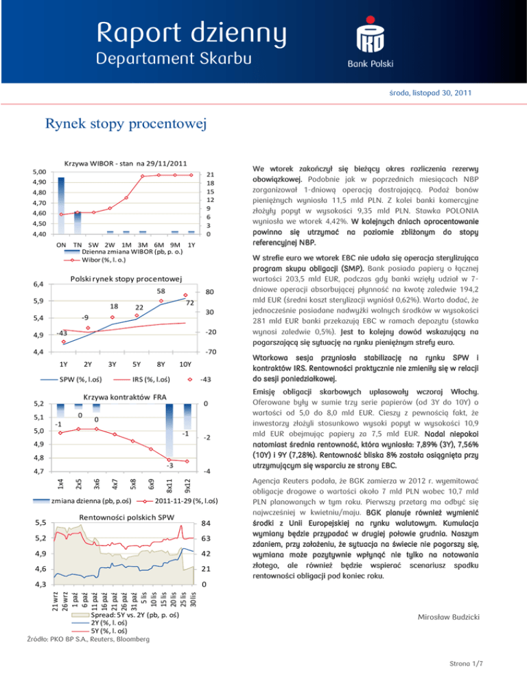 Raport dzienny Departament Skarbu środa, listopad 30, 2011 Rynek stopy procentowej Krzywa WIBOR - stan na 29/11/2011 5,00 21 18 15 12 9 6 3 0 4,90 4,80 4,70 4,60 4,50 4,40 ON TN SW 2W 1M 3M 6M 9M 1Y Dzienna zmiana WIBOR (pb, p. o.) Wibor (%, l. o.) Polski rynek stopy procentowej 6,4 58 5,9 18 72 22 30 -9 5,4 4,9 80 -20 -43 4,4 -70 1Y 2Y 3Y 5Y SPW (%, l.oś) 10Y IRS (%, l.oś) -43 Krzywa kontraktów FRA 5,2 0 5,1 5,0 8Y -1 0 0 -1 -2 4,9 4,8 5,5 -4 9x12 6x9 5x8 4x7 3x6 2x5 1x4 zmiana dzienna (pb, p.oś) 8x11 -3 4,7 2011-11-29 (%, l.oś) Rentowności polskich SPW 84 63 4,9 42 4,6 21 4,3 0 W strefie euro we wtorek EBC nie udała się operacja sterylizująca program skupu obligacji (SMP). Bank posiada papiery o łącznej wartości 203,5 mld EUR, podczas gdy banki wzięły udział w 7dniowe operacji absorbującej płynność na kwotę zaledwie 194,2 mld EUR (średni koszt sterylizacji wyniósł 0,62%). Warto dodać, że jednocześnie posiadane nadwyżki wolnych środków w wysokości 281 mld EUR banki przekazują EBC w ramach depozytu (stawka wynosi zaledwie 0,5%). Jest to kolejny dowód wskazujący na pogarszającą się sytuację na rynku pieniężnym strefy euro. Wtorkowa sesja przyniosła stabilizację na rynku SPW i kontraktów IRS. Rentowności praktycznie nie zmieniły się w relacji do sesji poniedziałkowej. Emisję obligacji skarbowych uplasowały wczoraj Włochy. Oferowane były w sumie trzy serie papierów (od 3Y do 10Y) o wartości od 5,0 do 8,0 mld EUR. Cieszy z pewnością fakt, że inwestorzy złożyli stosunkowo wysoki popyt w wysokości 10,9 mld EUR obejmując papiery za 7,5 mld EUR. Nadal niepokoi natomiast średnia rentowność, która wyniosła: 7,89% (3Y), 7,56% (10Y) i 9Y (7,28%). Rentowność bliska 8% została osiągnięta przy utrzymującym się wsparciu ze strony EBC. Agencja Reuters podała, że BGK zamierza w 2012 r. wyemitować obligacje drogowe o wartości około 7 mld PLN wobec 10,7 mld PLN planowanych w tym roku. Pierwszy przetarg ma odbyć się najwcześniej w kwietniu/maju. BGK planuje również wymienić środki z Unii Europejskiej na rynku walutowym. Kumulacja Kumulacja wymiany będzie przypadać w drugiej połowie grudnia. Naszym zdaniem, przy założeniu, że sytuacja na świecie nie pogorszy się, wymiana może pozytywnie wpłynąć nie tylko na notowania złotego, ale również będzie wspierać scenariusz spadku rentowności obligacji pod koniec roku. roku. 21 wrz 26 wrz 1 paź 6 paź 11 paź 16 paź 21 paź 26 paź 31 paź 5 lis 10 lis 15 lis 20 lis 25 lis 30 lis 5,2 We wtorek zakończył się bieżący okres rozliczenia rezerwy obowiązkowej. Podobnie jak w poprzednich miesiącach NBP zorganizował 1-dniową operacją dostrajającą. Podaż bonów pieniężnych wyniosła 11,5 mld PLN. Z kolei banki komercyjne złożyły popyt w wysokości 9,35 mld PLN. Stawka POLONIA wyniosła we wtorek 4,42%. W kolejnych dniach dniach oprocentowanie powinno się utrzymać na poziomie zbliżonym do stopy referencyjnej NBP. Spread: 5Y vs. 2Y (pb, p. oś) 2Y (%, l. oś) 5Y (%, l. oś) Mirosław Budzicki Źródło: PKO BP S.A., Reuters, Bloomberg Strona 1/7 PKO Bank Polski Raport dzienny 30.11.2011 Rynek walutowy EUR/PLN 4,560 4,520 4,480 30 lis 29 lis 28 lis 25 lis 24 lis 23 lis 4,440 USD/PLN 3,450 3,410 3,370 30 lis 29 lis 28 lis 25 lis 24 lis 23 lis 3,330 CHF/PLN 3,710 3,680 3,650 30 lis 29 lis 28 lis 25 lis 24 lis 23 lis 3,620 EUR/USD 1,353 1,342 1,331 Źródło: PKO BP S.A., Reuters, Bloomberg 30 lis 29 lis 28 lis 25 lis 24 lis 23 lis 1,320 Na rynkach finansowych sytuacja niewiele się zmienia. zmienia. We wtorek doszło do ponownego pogorszenia nastrojów, nastrojów, a dzisiaj z rana do dalszego nasilenia się pesymizmu. pesymizmu. Do wzrostu awersji do ryzyka początkowo przyczyniła się informacja, iż agencja Fitch obniżyła perspektywę ratingu USA do negatywnej ze stabilnej po poniedziałkowym zamknięciu notowań w USA. Głównym powodem tej decyzji był brak porozumienia Komisji Kongresu w sprawie redukcji deficytu budżetowego o 1,2 bln USD. Wczoraj od rana indeksy europejskich giełd zaczęły więc zniżkować, wytracając silne zwyżki z poprzedniej sesji, zaś na rynku walutowym ponownie dolar zaczął umacniać się wobec głównych walut, w tym przede wszystkim wobec euro. Co więcej, inwestorzy zaczęli obawiać się kolejnych obniżek ratingów zadłużonych krajów po tym jak francuski dziennik La Tribune podał, że S&P’s rozważa obniżkę perspektywy ratingu Francji w najbliższych dniach, a Moody's przestrzegł jednocześnie, że może obniżyć ocenę długu podporządkowanego 87 banków z 15 europejskich krajów z powodu obaw, że rządy mogą nie być gotowe pomóc im w razie pojawienia się problemów. Chwilowe wsparcie w postaci informacji, iż Włochom udało się uplasować na rynku obligacje o wartości 7,5 mld EUR z oferty na poziomie 5-8 mld EUR (pomimo wysokiej ceny jaką musiał zapłacić za to Rzym), pozwoliło na odreagowanie wtorkowo-porannych spadków. Nad kreskę chwilowo wróciły indeksy na giełdach europejskich, zaś wspólna waluta umocnili się do 1,344 USD. Złoty, który przed aukcją oscylował w okolicach 4,53 wobec euro umocnił się do 4,505. Inwestorzy widzą jednak, że nadal brak brak jest konkretnego planu działania mogącego uratować pogrążoną w kryzysie strefę euro, natomiast na rynek coraz częściej napływają pesymistyczne analizy wskazujące na duże prawdopodobieństwo upadku strefy euro. Aprecjacja euro była więc krótkotrwała i jeszcze jeszcze podczas sesji europejskiej kurs EUR/USD powrócił poniżej 1,33. Wieczorem ministrowie finansów krajów strefy euro zgodzili się na wypłacenie wartej osiem miliardów euro transzy pomocy finansowej dla Grecji. Wypłata transzy, która jest częścią wartego 110 mld EUR pakietu pomocowego dla Aten zapewnionego przez UE i MFW była wstrzymana przez miesiąc, ponieważ Grecja spóźniała się z wprowadzeniem programu cięcia wydatków i podwy