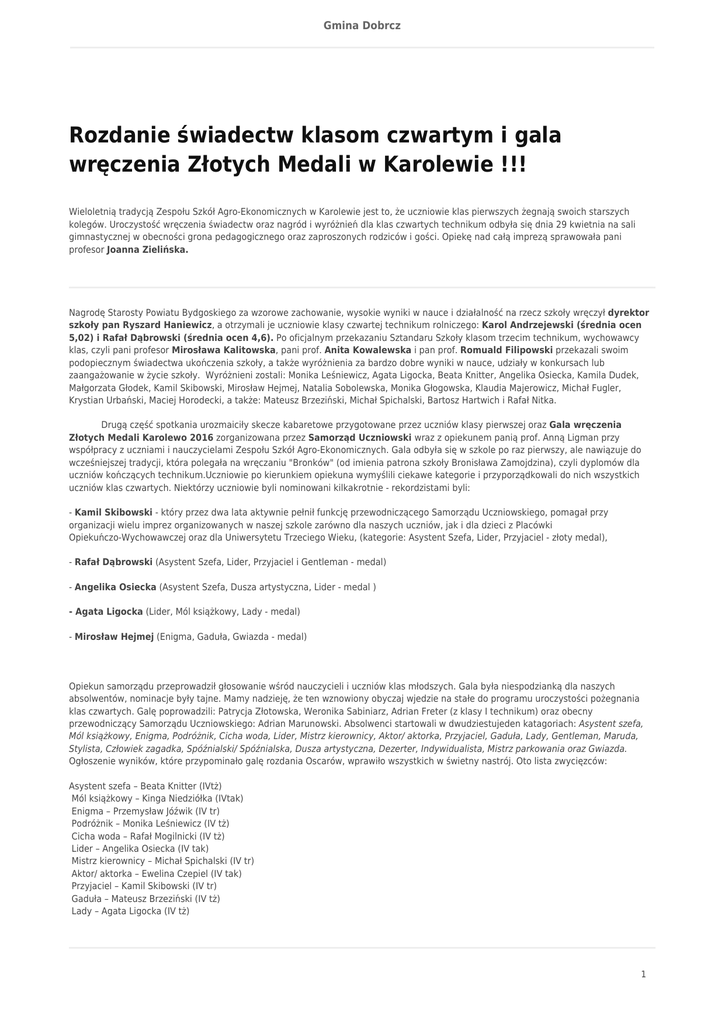 Gmina Dobrcz Rozdanie świadectw klasom czwartym i gala wręczenia Złotych Medali w Karolewie !!! Wieloletnią tradycją Zespołu Szkół Agro-Ekonomicznych w Karolewie jest to, że uczniowie klas pierwszych żegnają swoich starszych kolegów. Uroczystość wręczenia świadectw oraz nagród i wyróżnień dla klas czwartych technikum odbyła się dnia 29 kwietnia na sali gimnastycznej w obecności grona pedagogicznego oraz zaproszonych rodziców i gości. Opiekę nad całą imprezą sprawowała pani profesor Joanna Zielińska. Nagrodę Starosty Powiatu Bydgoskiego za wzorowe zachowanie, wysokie wyniki w nauce i działalność na rzecz szkoły wręczył dyrektor szkoły pan Ryszard Haniewicz, a otrzymali je uczniowie klasy czwartej technikum rolniczego: Karol Andrzejewski (średnia ocen 5,02) i Rafał Dąbrowski (średnia ocen 4,6). Po oficjalnym przekazaniu Sztandaru Szkoły klasom trzecim technikum, wychowawcy klas, czyli pani profesor Mirosława Kalitowska, pani prof. Anita Kowalewska i pan prof. Romuald Filipowski przekazali swoim podopiecznym świadectwa ukończenia szkoły, a także wyróżnienia za bardzo dobre wyniki w nauce, udziały w konkursach lub zaangażowanie w życie szkoły. Wyróżnieni zostali: Monika Leśniewicz, Agata Ligocka, Beata Knitter, Angelika Osiecka, Kamila Dudek, Małgorzata Głodek, Kamil Skibowski, Mirosław Hejmej, Natalia Sobolewska, Monika Głogowska, Klaudia Majerowicz, Michał Fugler, Krystian Urbański, Maciej Horodecki, a także: Mateusz Brzeziński, Michał Spichalski, Bartosz Hartwich i Rafał Nitka. Drugą część spotkania urozmaiciły skecze kabaretowe przygotowane przez uczniów klasy pierwszej oraz Gala wręczenia Złotych Medali Karolewo 2016 zorganizowana przez Samorząd Uczniowski wraz z opiekunem panią prof. Anną Ligman przy współpracy z uczniami i nauczycielami Zespołu Szkół Agro-Ekonomicznych. Gala odbyła się w szkole po raz pierwszy, ale nawiązuje do wcześniejszej tradycji, która polegała na wręczaniu "Bronków" (od imienia patrona szkoły Bronisława Zamojdzina), czyli dyplomów dla uczniów kończących technikum.Uczniowie po kierunkiem opiekuna wymyślili ciekawe kategorie i przyporządkowali do nich wszystkich uczniów klas czwartych. Niektórzy uczniowie byli nominowani kilkakrotnie - rekordzistami byli: - Kamil Skibowski - który przez dwa lata aktywnie pełnił funkcję przewodniczącego Samorządu Uczniowskiego, pomagał przy organizacji wielu imprez organizowanych w naszej szkole zarówno dla naszych uczniów, jak i dla dzieci z Placówki Opiekuńczo-Wychowawczej oraz dla Uniwersytetu Trzeciego Wieku, (kategorie: Asystent Szefa, Lider, Przyjaciel - złoty medal), - Rafał Dąbrowski (Asystent Szefa, Lider, Przyjaciel i Gentleman - medal) - Angelika Osiecka (Asystent Szefa, Dusza artystyczna, Lider - medal ) - Agata Ligocka (Lider, Mól książkowy, Lady - medal) - Mirosław Hejmej (Enigma, Gaduła, Gwiazda - medal) Opiekun samorządu przeprowadził głosowanie wśród nauczycieli i uczniów klas młodszych. Gala była niespodzianką dla naszych absolwentów, nominacje były tajne. Mamy nadzieję, że ten wznowiony obyczaj wjedzie na stałe do programu uroczystości pożegnania klas czwartych. Galę poprowadzili: Patrycja Złotowska, Weronika Sabiniarz, Adrian Freter (z klasy I technikum) oraz obecny przewodniczący Samorządu Uczniowskiego: Adrian Marunowski. Absolwenci startowali w dwudziestujeden katagoriach: Asystent szefa, Mól książkowy, Enigma, Podróżnik, Cicha woda, Lider, Mistrz kierownicy, Aktor/ aktorka, Przyjaciel, Gaduła, Lady, Gentleman, Maruda, Stylista, Człowiek zagadka, Spóźnialski/ Spóźnialska, Dusza artystyczna, Dezerter, Indywidualista, Mistrz parkowania oraz Gwiazda. Ogłoszenie wyników, które przypominało galę rozdania Oscarów, wprawiło wszystkich w świetny nastrój. Oto lista zwycięzców: Asystent szefa – Beata Knitter (IVtż) Mól książkowy – Kinga Niedziółka (IVtak) Enigma – Przemysław Jóźwik (IV tr) Podróżnik – Monika Leśniewicz (IV tż) Cicha woda – Rafał Mogilnicki (IV tż) Lider – Angelika Osiecka (IV tak) Mistrz kierownicy – Michał Spichalski (IV tr) Aktor/ aktorka – Ewelina Czepiel (IV tak) Przyjaciel – Kamil Skibowski (IV tr) Gaduła – Mateusz Brzeziński (IV tż) Lady – Agata Ligocka (IV tż) 1 Gmina Dobrcz Gentleman – Rafał Dąbrowski (IVtr) Maruda – Karolina Wesołowska (IV tak) Stylista – Michał Fugler (IV tak) Człowiek zagadka – Dawid Młodzianowski (IV tr) Spóźnialski – Daniel Małecki (IV tż) Dusza artystyczna – Kamila Dudek (IV tak) Dezerter – Mateusz Bloch (IV tr) Indywidualista – Klaudia Majerowicz (IV tż) Mistrz parkowania – Rafał Zalewski (IV tr) Gwiazda – Mirosław Hejmej (IV tr) Zanim wszyscy rozeszli się do domów nastąpił moment podziękowań od uczniów klas czwartych, a ze strony prowadzących życzenia powodzenia na egzaminach maturalnych i zawodowych. Spotkanie zakończyło się pamiątkowym zdjęciem grupowym. autor zdj. Patryk Kortas i Kinga Urbańska 2