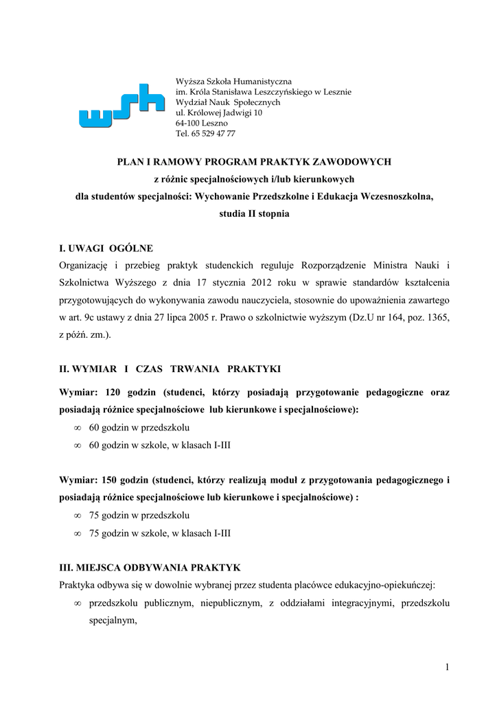 Wyższa Szkoła Humanistyczna im. Króla Stanisława Leszczyńskiego w Lesznie Wydział Nauk Społecznych ul. Królowej Jadwigi 10 64-100 Leszno Tel. 65 529 47 77 PLAN I RAMOWY PROGRAM PRAKTYK ZAWODOWYCH z różnic specjalnościowych i/lub kierunkowych dla studentów specjalności: Wychowanie Przedszkolne i Edukacja Wczesnoszkolna, studia II stopnia I. UWAGI OGÓLNE Organizację i przebieg praktyk studenckich reguluje Rozporządzenie Ministra Nauki i Szkolnictwa Wyższego z dnia 17 stycznia 2012 roku w sprawie standardów kształcenia przygotowujących do wykonywania zawodu nauczyciela, stosownie do upoważnienia zawartego w art. 9c ustawy z dnia 27 lipca 2005 r. Prawo o szkolnictwie wyższym (Dz.U nr 164, poz. 1365, z póżń. zm.). II. WYMIAR I CZAS TRWANIA PRAKTYKI Wymiar: 120 godzin (studenci, którzy posiadają przygotowanie pedagogiczne oraz posiadają różnice specjalnościowe lub kierunkowe i specjalnościowe): • 60 godzin w przedszkolu • 60 godzin w szkole, w klasach I-III Wymiar: 150 godzin (studenci, którzy realizują moduł z przygotowania pedagogicznego i posiadają różnice specjalnościowe lub kierunkowe i specjalnościowe) : • 75 godzin w przedszkolu • 75 godzin w szkole, w klasach I-III III. MIEJSCA ODBYWANIA PRAKTYK Praktyka odbywa się w dowolnie wybranej przez studenta placówce edukacyjno-opiekuńczej: • przedszkolu publicznym, niepublicznym, z oddziałami integracyjnymi, przedszkolu specjalnym, 1 • szkole podstawowej publicznej, niepublicznej, specjalnej, integracyjnej, z oddziałami integracyjnymi (pierwszy etap edukacyjny klasy I-III). IV. CEL PRAKTYKI Głównym celem praktyki jest kształtowanie kompetencji opiekuńczo- wychowawczych i dydaktycznych ,wdrażanie studenta do podejmowania samodzielnych działań pedagogicznych w kontakcie z małym dzieckiem oraz wprowadzenie w praktykę wychowania i nauczania dzieci o specjalnych potrzebach edukacyjnych . V. DOKUMNETACJA PRAKTYKI 1. Codzienne aktywność w czasie trwania praktyki dokumentowana jest przez studenta w formie dziennika praktyk. Znajdują się w nim informacje dotyczące: czynności, jakie będą realizowane w czasie trwania praktyki; czasu spędzonego w placówce w danym dniu; zadań realizowanych w placówce w danym dniu; zdobytych umiejętności; własnych spostrzeżeń dotyczących pobytu w placówce. 2.Teczka portfolio obejmująca: • scenariusze przeprowadzonych przez studenta zajęć (co najmniej 2 z każdej placówki, dodatkowo scenariusz zajęć wyrównawczych) wraz z krótką analizą zawierającą spostrzeżenia po przeprowadzonych zajęciach; • przykładowy plan (rozkład) pracy nauczyciela przedszkola i nauczyciela szkoły; • przykłady działań wspierających rozwój dziecka i niwelowania zaburzeń; praca z dzieckiem zdolnym, analizator słuchowy; • przykładowe plany współpracy (szkoły lub przedszkola) np. ze środowiskiem lokalnym, rodzicami, kalendarz imprez lub inne; • opracowane przez studenta narzędzie ewaluacji oraz inne (co najmniej 2) przykładowe narzędzia np. arkusze obserwacji pedagogicznej, karty pracy; • przykładowe wytwory pracy dziecka (prace plastyczne, wypełnione karty pracy i inne); • samodzielnie przygotowane pomoce dydaktyczne wykorzystane podczas prowadzonych przez studenta zajęć; 2 • przykładowe materiały dydaktyczne przydatne w pracy np. przykłady zabaw, wiersze, zagadki, teksty piosenek, ilustracje, obrazki, ciekawostki przyrodnicze itp.; • dokumentacja fotograficzna z praktyki (nie jest konieczna); • inne materiały wg uznania studenta. VI. ZADANIA STUDENTA W TRAKCIE PRAKTYKI: 1. Poznanie specyfiki, zasad funkcjonowania i organizacji pracy przedszkola/szkoły poprzez: • dokonanie analizy podstawowych aktów prawnych regulujących pracę placówek oświatowych, w których student odbywa praktykę (m.in. ustaw, rozporządzeń, zarządzeń, uchwał organów prowadzących); • zapoznanie się ze statutem (szczególnie zwrócenie uwagi na kompetencje organów placówki, zakres zadań i odpowiedzialności nauczyciela, formy i sposoby udzielania pomocy psychologiczno-pedagogicznej w placówce), procedurami obowiązującymi w przedszkolu/ szkole, szczególnie w zakresie bezpieczeństwa i higieny; • przeanalizowanie koncepcji pracy placówki, organizacji pomocy psychologicznopedagogicznej w przedszkolu lub szkole, planów (np. rozkładów materiału, planu działań wychowawczo-opiekuńczo-dydaktycznych, współpracy z rodzicami, współpracy ze środowiskiem lokalnym, doskonalenia zawodowego, kalendarza imprez i innych) oraz programów (np. wychowawczego, profilaktycznego); • dokonanie wstępnej analizy zadań i warsztatu pracy pedagoga/ psychologa szkolnego oraz innych specjalistów biorących udział w procesie wspomagania rozwoju dziecka ze specjalnymi potrzebami edukacyjnymi ; • zapoznanie się ze sposobem prowadzenia przez nauczyciela dokumentacji pedagogicznej (np. dziennika, dokumentacji obserwacji pedagogicznej, diagnozy itp.). 2. Zdobywanie, doskonalenie oraz rozwijanie kompetencji psychologiczno-pedagogicznych, diagnostycznych, planistycznych, dydaktyczno- metodycznych, komunikacyjnych oraz ewaluacyjnych poprzez: • obserwowanie działań wychowawczo-dydaktyczno-opiekuńczych wynikających z organizacji dnia w przedszkolu oraz zajęć zintegrowanych w szkole, w tym zajęć z dziećmi o specjalnych potrzebach edukacyjnych; 3 • asystowanie podczas różnych form aktywności dzieci (np. pomoc w organizowaniu przestrzeni do zajęć i zabaw w sali, na placu zabaw, nawiązywanie kontaktu z dziećmi, działania opiekuńcze w łazience, szatni, podejmowanie działań wychowawczych wynikających z zaistniałej sytuacji np. w sytuacji konfliktowej, naruszania praw, sprawowanie nadzoru i opieki w celu zapewnienia bezpieczeństwa) i samodzielne przeprowadzenie fragmentu zajęcia lub działania edukacyjnego o charakterze integracyjnym; • samodzielne opracowanie scenariuszy, konsultowanie ich z nauczycielem opiekunem