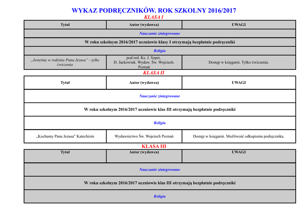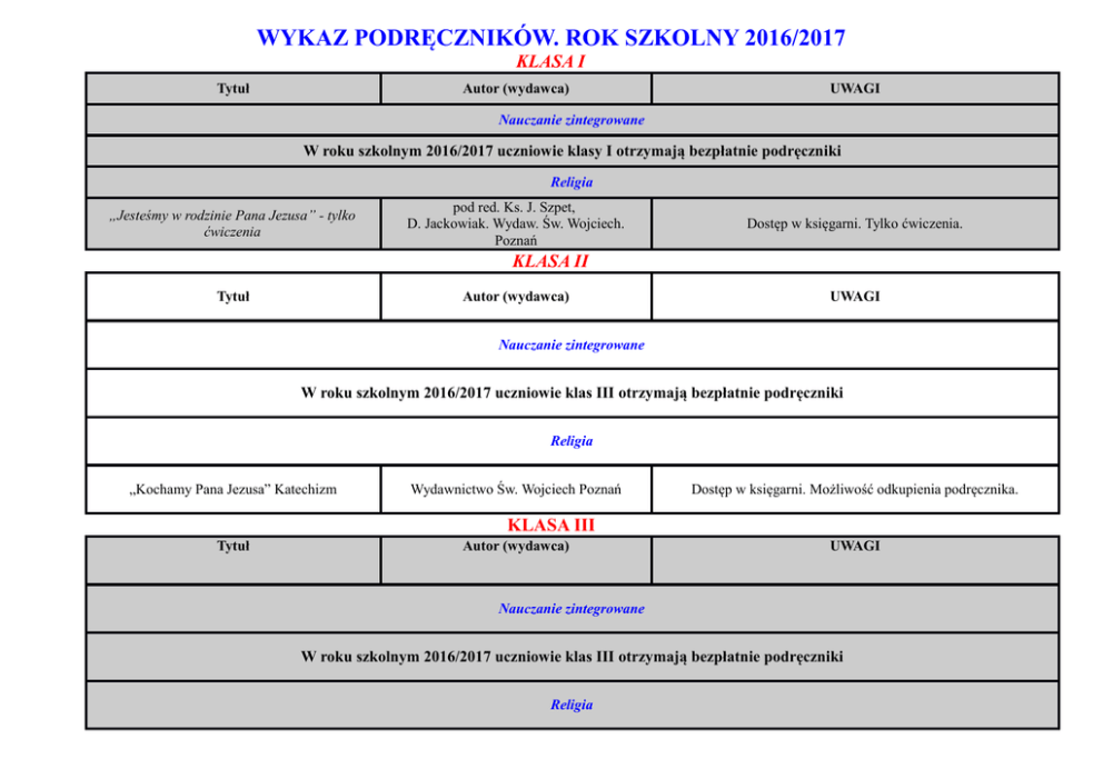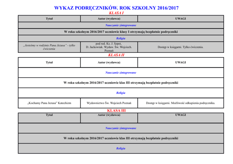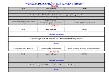 WYKAZ PODRĘCZNIKÓW. ROK SZKOLNY 2016/2017 KLASA I Tytuł Autor (wydawca) UWAGI Nauczanie zintegrowane W roku szkolnym 2016/2017 uczniowie klasy I otrzymają bezpłatnie podręczniki Religia „Jesteśmy w rodzinie Pana Jezusa” - tylko ćwiczenia pod red. Ks. J. Szpet, D. Jackowiak. Wydaw. Św. Wojciech. Poznań Dostęp w księgarni. Tylko ćwiczenia. KLASA II Tytuł Autor (wydawca) UWAGI Nauczanie zintegrowane W roku szkolnym 2016/2017 uczniowie klas III otrzymają bezpłatnie podręczniki Religia „Kochamy Pana Jezusa” Katechizm Wydawnictwo Św. Wojciech Poznań Dostęp w księgarni. Możliwość odkupienia podręcznika. KLASA III Tytuł Autor (wydawca) UWAGI Nauczanie zintegrowane W roku szkolnym 2016/2017 uczniowie klas III otrzymają bezpłatnie podręczniki Religia „Poznajemy Pana Jezusa” Podręcznik do nauki religii dla klasy III. Katechizm Wydawnictwo Św. Wojciech Poznań Ks. J. Szpet Dostęp w księgarni. KLASA IV Przedmiot Tytuł Autor (wydawca) UWAGI W roku szkolnym 2016/2017 uczniowie klas IV otrzymają bezpłatnie podręczniki Religia Jestem chrześcijaninem. Katechizm kl. IV Ks. J. Szpet, D. Jackowiak, Wydawnictwo Św. Wojciech Poznań Możliwość odkupienia podręcznika Język niemiecki Język niemiecki Punkt Klasa 4 WSiP Podręcznik wypożyczany przez szkołę Autor (wydawca) UWAGI KLASA V Przedmiot Tytuł W roku szkolnym 2016/2017 uczniowie klas V otrzymają bezpłatnie podręczniki Religia Język niemiecki Wierzę w Boga. Katechizm Język niemiecki Punkt Klasa 5 Wydaw. Św. Wojciech. Poznań Możliwość odkupienia. A. Potapowicz WSiP Istnieje możliwość odkupienia. Dostęp w księgarni. Autor (wydawca) UWAGI Dostęp w księgarni. Podręcznik „Literatura i Kultura” można odkupić, „Nauka o języku i ortografia” – zakup w księgarni KLASA VI Przedmiot Tytuł Język polski Ewa Horwath, Anita Żegleń, Słowa z uśmiechem. Literatura i kultura. Język polski klasa 6 oraz Ewa Horwath, Anita Żegleń, Słowa z uśmiechem. Nauka o języku i ortografia. Język polski klasa 6, część 1,2 WSiP Welcome Friends 3. Podręcznik Express Publishing Sprawdzian szóstoklasisty. Repetytorium z testami. Podręcznik Historia wokół nas + zeszyt ćwiczeń Przyrodo witaj. Klasa 6. Podręcznik + ćwiczenia Matematyka 2001 kl. VI. Podręcznik z płytą CD-ROM + zeszyt ćwiczeń dla klasy 6. Część Marta Rosińska, Arkadiusz Mędela Macmillan Język angielski Historia i społeczeństwo Przyroda Matematyka WSiP WSiP WSiP Dostęp w księgarni. Istnieje możliwość odkupienia. Istnieje możliwość odkupienia. Dostęp w księgarni Istnieje możliwość odkupienia. Dostęp w księgarni Dostęp w księgarni. Nowe wydanie 2014 2 Pora na sprawdzian. Istnieje możliwość odkupienia podręcznika Kontynuacja z klasy V. Bez zeszytu ćwiczeń. Dostęp w księgarni Muzyka Muzyka - odkrywamy na nowo. Podręcznik do klas IV-VI Małgorzata Rykowska, Zbigniew Szałko OPERON Plastyka Plastyka 4 - 6 Podręcznik St. K. Stopczyk, J. Chałaścińska, Plastyka 4- 6 (podręcznik) WSiP Zajęcia techniczne „Technika na co dzień” IV-VI. cz. 2. Podręcznik Zajęcia komputerowe Lubię to! Ewa Królicka, Marcin Duda WSiP M. Kęska Nowa Era Język niemiecki Język niemiecki Punkt Klasa 6 A. Potapowicz WSiP Istnieje możliwość odkupienia. Dostęp w księgarni Religia „Wierzę w Kościół”-Katechizm Aut. J. Szpet, D. Jackowiak Wydaw. Św. Wojciech. Poznań Istnieje możliwość odkupienia. Dostęp w księgarni Kontynuacja z klasy V. Dostęp w księgarni. Kontynuacja z klasy V.