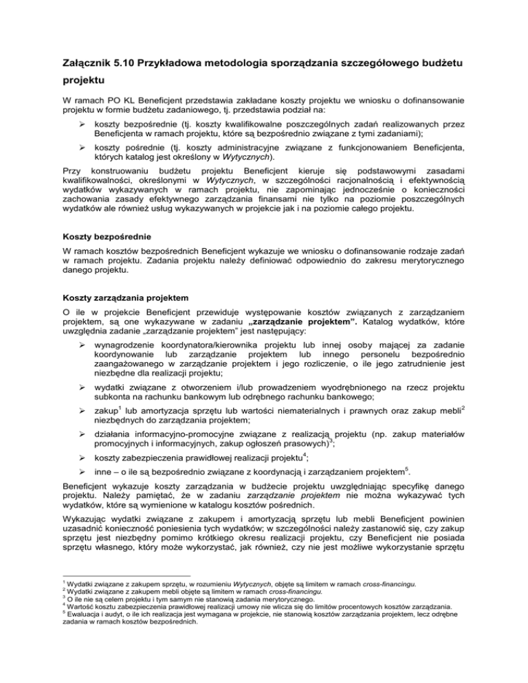 Załącznik 5.10 Przykładowa metodologia sporządzania szczegółowego budżetu projektu W ramach PO KL Beneficjent przedstawia zakładane koszty projektu we wniosku o dofinansowanie projektu w formie budżetu zadaniowego, tj. przedstawia podział na: koszty bezpośrednie (tj. koszty kwalifikowalne poszczególnych zadań realizowanych przez Beneficjenta w ramach projektu, które są bezpośrednio związane z tymi zadaniami); koszty pośrednie (tj. koszty administracyjne związane z funkcjonowaniem Beneficjenta, których katalog jest określony w Wytycznych). Przy konstruowaniu budżetu projektu Beneficjent kieruje się podstawowymi zasadami kwalifikowalności, określonymi w Wytycznych, w szczególności racjonalnością i efektywnością wydatków wykazywanych w ramach projektu, nie zapominając jednocześnie o konieczności zachowania zasady efektywnego zarządzania finansami nie tylko na poziomie poszczególnych wydatków ale również usług wykazywanych w projekcie jak i na poziomie całego projektu. Koszty bezpośrednie W ramach kosztów bezpośrednich Beneficjent wykazuje we wniosku o dofinansowanie rodzaje zadań w ramach projektu. Zadania projektu należy definiować odpowiednio do zakresu merytorycznego danego projektu. Koszty zarządzania projektem O ile w projekcie Beneficjent przewiduje występowanie kosztów związanych z zarządzaniem projektem, są one wykazywane w zadaniu „zarządzanie projektem”. Katalog wydatków, które uwzględnia zadanie „zarządzanie projektem” jest następujący: wynagrodzenie koordynatora/kierownika projektu lub innej osoby mającej za zadanie koordynowanie lub zarządzanie projektem lub innego personelu bezpośrednio zaangażowanego w zarządzanie projektem i jego rozliczenie, o ile jego zatrudnienie jest niezbędne dla realizacji projektu; wydatki związane z otworzeniem i/lub prowadzeniem wyodrębnionego na rzecz projektu subkonta na rachunku bankowym lub odrębnego rachunku bankowego; zakup lub amortyzacja sprzętu lub wartości niematerialnych i prawnych oraz zakup mebli niezbędnych do zarządzania projektem; działania informacyjno-promocyjne związane z realizacją projektu (np. zakup materiałów 3 promocyjnych i informacyjnych, zakup ogłoszeń prasowych) ; koszty zabezpieczenia prawidłowej realizacji projektu ; inne – o ile są bezpośrednio związane z koordynacją i zarządzaniem projektem . 1 2 4 5 Beneficjent wykazuje koszty zarządzania w budżecie projektu uwzględniając specyfikę danego projektu. Należy pamiętać, że w zadaniu zarządzanie projektem nie można wykazywać tych wydatków, które są wymienione w katalogu kosztów pośrednich. Wykazując wydatki związane z zakupem i amortyzacją sprzętu lub mebli Beneficjent powinien uzasadnić konieczność poniesienia tych wydatków; w szczególności należy zastanowić się, czy zakup sprzętu jest niezbędny pomimo krótkiego okresu realizacji projektu, czy Beneficjent nie posiada sprzętu własnego, który może wykorzystać, jak również, czy nie jest możliwe wykorzystanie sprzętu 1 Wydatki związane z zakupem sprzętu, w rozumieniu Wytycznych, objęte są limitem w ramach cross-financingu. Wydatki związane z zakupem mebli objęte są limitem w ramach cross-financingu. 3 O ile nie są celem projektu i tym samym nie stanowią zadania merytorycznego. 4 Wartość kosztu zabezpieczenia prawidłowej realizacji umowy nie wlicza się do limitów procentowych kosztów zarządzania. 5 Ewaluacja i audyt, o ile ich realizacja jest wymagana w projekcie, nie stanowią kosztów zarządzania projektem, lecz odrębne zadania w ramach kosztów bezpośrednich. 2 zakupionego w ramach innych projektów finansowanych z PO KL lub innych programów operacyjnych. Beneficjent musi jednocześnie wziąć pod uwagę fakt, że łączna wartość kosztów zarządzania projektem (bez uwzględnienia kosztów zabezpieczenia projektu) nie może przekroczyć. 6 a) 30% wartości projektu w przypadku projektów o wartości nieprzekraczającej 500 tys. zł, z zastrzeżeniem, że limit ten może ulec zwiększeniu wyłącznie na wniosek Beneficjenta w przypadku wykazania przez niego wysokiej efektywności kosztowej projektu, co podlega negocjacjom na etapie wyboru projektu; b) 25% wartości projektu w przypadku projektów o wartości powyżej 500 tys. i do 1 mln zł włącznie; c) 20% wartości projektu w przypadku projektów o wartości powyżej 1 mln i do 2 mln zł włącznie; d) 15% wartości projektu w przypadku projektów o wartości powyżej 2 mln i do 5 mln zł włącznie; e) 10% wartości projektu w przypadku projektów o wartości powyżej 5 mln zł. Należy zauważyć, że odstępstwa od ww. limitów są możliwe jedynie w przypadku projektów o wartości do 500 tys. zł i to wyłącznie w przypadku gdy Beneficjent jest w stanie udowodnić, że projekt z kosztami zarządzania przekraczającymi 30% jest projektem efektywnym kosztowo. Dodatkowo, w przypadku projektów realizowanych w partnerstwie ww. limity mogą ulec zwiększeniu o 2 punkty procentowe dla każdego partnera, jednak nie więcej niż łącznie o 10 punktów procentowych w ramach projektu. Przy ustalaniu wysokości zwiększenia limitu IP / IW (IP2) powinna uwzględnić zakres zadań przewidzianych do realizacji przez partnera, np. w przypadku projektu partnerskiego z udziałem jednego partnera o wartości 750 tys. zł limit kosztów zarządzania wyniesie 27% (25 pkt proc. + 2 pkt proc.). Przykład: Beneficjent opracował budżet projektu, w którym uwzględnił wszystkie niezbędne do realizacji projektu wydatki w racjonalnej i rynkowej wysokości. Wartość kosztów bezpośrednich wyniosła 700 000 zł, w tym wartość kosztów zarządzania projektem 120 000 zł, natomiast wysokość kosztów pośrednich wyniosła 56 000 zł. Całkowita wartość projektu wynosi zatem 756 000 zł. Następnie beneficjent sprawdza, czy tak skonstruowany budżet projektu spełnia wymogi w zakresie limitów na koszty zarządzania projektem