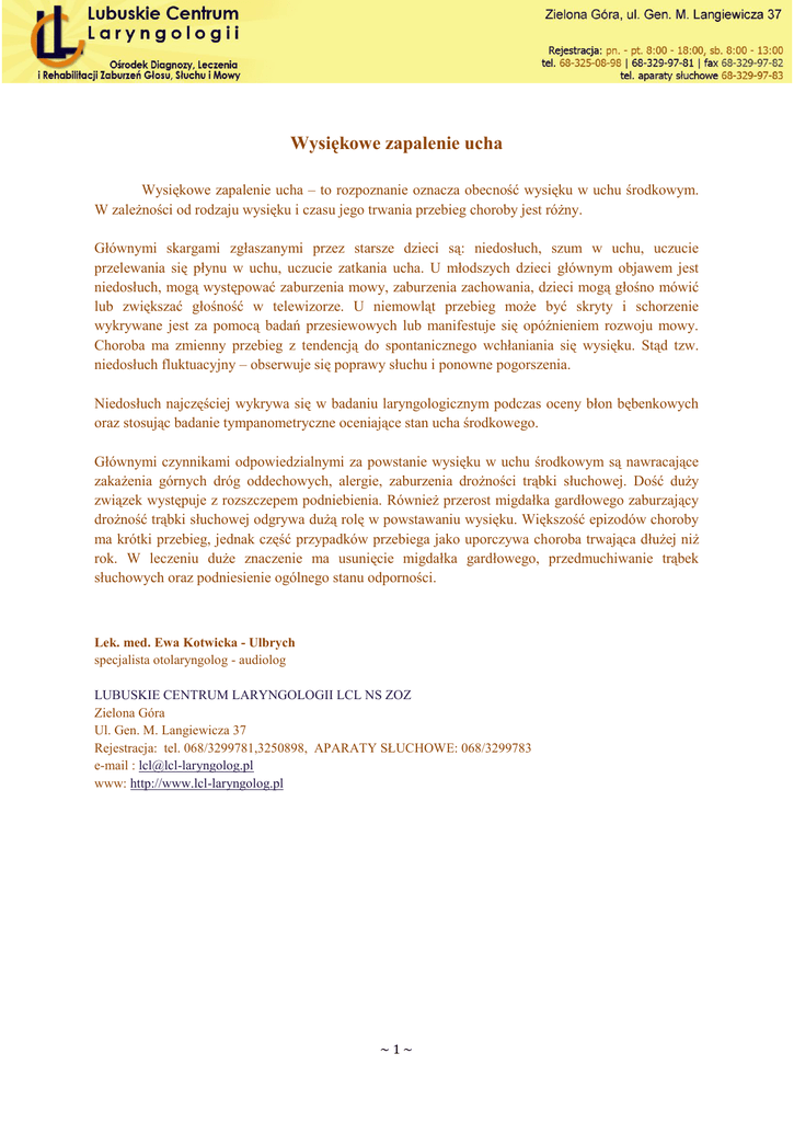 Wysiękowe zapalenie ucha Wysiękowe zapalenie ucha – to rozpoznanie oznacza obecność wysięku w uchu środkowym. W zależności od rodzaju wysięku i czasu jego trwania przebieg choroby jest różny. Głównymi skargami zgłaszanymi przez starsze dzieci są: niedosłuch, szum w uchu, uczucie przelewania się płynu w uchu, uczucie zatkania ucha. U młodszych dzieci głównym objawem jest niedosłuch, mogą występować zaburzenia mowy, zaburzenia zachowania, dzieci mogą głośno mówić lub zwiększać głośność w telewizorze. U niemowląt przebieg może być skryty i schorzenie wykrywane jest za pomocą badań przesiewowych lub manifestuje się opóźnieniem rozwoju mowy. Choroba ma zmienny przebieg z tendencją do spontanicznego wchłaniania się wysięku. Stąd tzw. niedosłuch fluktuacyjny – obserwuje się poprawy słuchu i ponowne pogorszenia. Niedosłuch najczęściej wykrywa się w badaniu laryngologicznym podczas oceny błon bębenkowych oraz stosując badanie tympanometryczne oceniające stan ucha środkowego. Głównymi czynnikami odpowiedzialnymi za powstanie wysięku w uchu środkowym są nawracające zakażenia górnych dróg oddechowych, alergie, zaburzenia drożności trąbki słuchowej. Dość duży związek występuje z rozszczepem podniebienia. Również przerost migdałka gardłowego zaburzający drożność trąbki słuchowej odgrywa dużą rolę w powstawaniu wysięku. Większość epizodów choroby ma krótki przebieg, jednak część przypadków przebiega jako uporczywa choroba trwająca dłużej niż rok. W leczeniu duże znaczenie ma usunięcie migdałka gardłowego, przedmuchiwanie trąbek słuchowych oraz podniesienie ogólnego stanu odporności. Lek. med. Ewa Kotwicka - Ulbrych specjalista otolaryngolog - audiolog LUBUSKIE CENTRUM LARYNGOLOGII LCL NS ZOZ Zielona Góra Ul. Gen. M. Langiewicza 37 Rejestracja: tel. 068/3299781,3250898, APARATY SŁUCHOWE: 068/3299783 e-mail : [email protected] www: http://www.lcl-laryngolog.pl ~1~