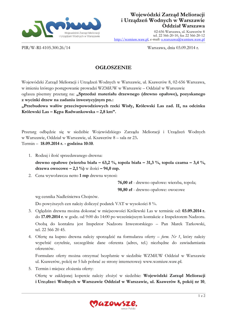 Wojewódzki Zarząd Melioracji i Urządzeń Wodnych w Warszawie Oddział Warszawa 02-656 Warszawa, ul. Ksawerów 8 tel. 22 566-20-10, fax 22 566-20-12 http://wzmiuw.waw.pl, e-mail: [email protected] PIR/W-RI-4105.300.26/14 Warszawa, dnia 03.09.2014 r. OGŁOSZENIE Wojewódzki Zarząd Melioracji i Urządzeń Wodnych w Warszawie, ul. Ksawerów 8, 02-656 Warszawa, w imieniu którego postępowanie prowadzi WZMiUW w Warszawie – Oddział w Warszawie ogłasza pisemny przetarg na: „Sprzedaż materiału drzewnego (drewno opałowe), pozyskanego z wycinki drzew na zadaniu inwestycyjnym pn.: „Przebudowa wałów przeciwpowodziowych rzeki Wisły, Królewski Las zad. II, na odcinku Królewski Las – Kępa Radwankowska – 2,8 km”. Przetarg odbędzie się w siedzibie Wojewódzkiego Zarządu Melioracji i Urządzeń Wodnych w Warszawie, Oddział w Warszawie, ul. Ksawerów 8 – sala nr 23. Termin – 18.09.2014 r. - godzina 10:10. 1. Rodzaj i ilość sprzedawanego drewna: drewno opałowe (wierzba biała – 63,2 %, topola biała – 31,3 %, topola czarna – 3,4 %, drzewa owocowe – 2,1 %) w ilości – 94,0 mp. 2. Cena wywoławcza netto 1 mp drewna wynosi: 76,00 zł - drewno opałowe: wierzba, topola; 98,80 zł - drewno opałowe: owocowe wg cennika Nadleśnictwa Chojnów. Do powyższych cen należy doliczyć podatek VAT w wysokości 8 %. 3. Oględzin drewna można dokonać w miejscowości Królewski Las w terminie od: 03.09.2014 r. do 17.09.2014 r. w godz. od 9:00 do 14:00 po wcześniejszym kontakcie z Inspektorem Nadzoru. Osobą do kontaktu jest Inspektor Nadzoru Inwestorskiego – Pan Marek Tarkowski, tel. 22 566 20 45. 4. Ofertę na kupno drewna należy sporządzić na formularzu oferty – form. Nr 1, który należy wypełnić czytelnie, szczególnie dane oferenta (adres, tel.) niezbędne do zawiadamiania oferentów. Formularz oferty można otrzymać bezpłatnie w siedzibie WZMiUW Oddział w Warszawie ul. Ksawerów, pokój nr 5 lub pobrać ze strony internetowej: www.wzmiuw.waw.pl. 5. Termin i miejsce złożenia oferty: Ofertę w zaklejonej kopercie należy złożyć w siedzibie: Wojewódzki Zarząd Melioracji i Urządzeń Wodnych w Warszawie Oddział w Warszawie, ul. Ksawerów 8, pokój nr 10, 1z2 do dnia 18.09.2014 r. do godz. 1000. Koperta z ofertą winna być zaadresowana na adres organizatora przetargu i oznaczona napisem: „Oferta na zakup drewna opałowego (Królewski Las)”. 6. Okres związania ofertą wynosi 14 dni. 7. Komisyjne otwarcie ofert nastąpi w dniu 18.09.2014r o godz. 1010 w siedzibie Wojewódzkiego Zarządu Melioracji i Urządzeń Wodnych w Warszawie Oddział w Warszawie, ul. Ksawerów 8, I piętro sala 23 (sala konferencyjna). Wskazana jest obecność oferentów w czasie otwierania ofert. 8. Wybrana zostanie oferta z najwyższą ceną. W razie ustalenia przez komisję przetargową, że kilku oferentów zaoferuje tę samą cenę, przetarg będzie kontynuowany w formie aukcji między tymi oferentami. O terminie i miejscu aukcji oferenci zostaną poinformowani. Aukcja może się odbyć również bezpośrednio po otwarciu ofert, jeżeli oferenci, którzy złożyli równorzędne oferty, będą obecni na otwarciu ofert. Postąpienie nie może wynosić mniej niż 1% ceny wywoławczej. 9. Komisja odrzuci ofertę jeżeli: – oferta została złożona po wyznaczonym terminie, w niewłaściwym miejscu, – oferta zawiera niekompletne, nieczytelne dane, – oferent nie zaoferował co najmniej ceny wywoławczej. 10. Oferent zostanie powiadomiony o wyborze oferty telefonicznie i na piśmie. 11. Osobą uprawnioną do bezpośredniego kontaktu z oferentami jest: Pan Marek Tarkowski tel. 22 566 20 45. 12. Ogłaszający przetarg zastrzega sobie prawo zamknięcia przetargu bez wybrania którejkolwiek z ofert. Zatwierdził: 2z2
