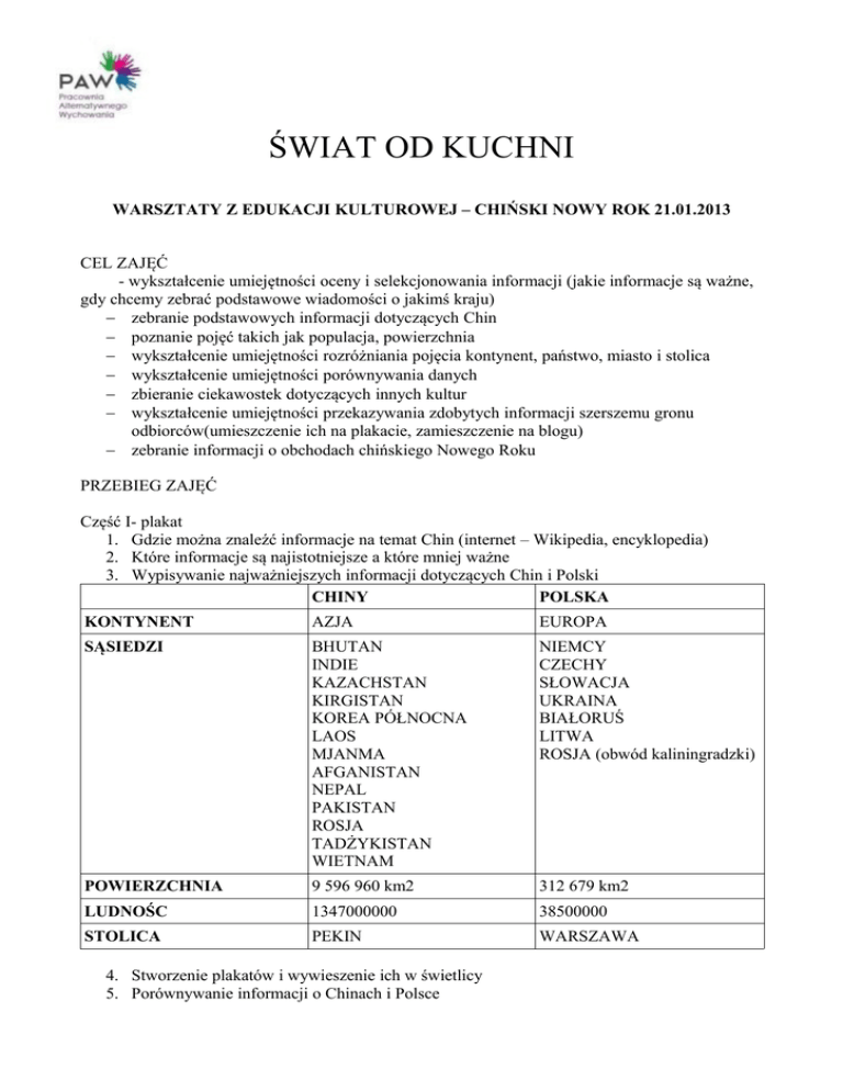 ŚWIAT OD KUCHNI WARSZTATY Z EDUKACJI KULTUROWEJ – CHIŃSKI NOWY ROK 21.01.2013 CEL ZAJĘĆ - wykształcenie umiejętności oceny i selekcjonowania informacji (jakie informacje są ważne, gdy chcemy zebrać podstawowe wiadomości o jakimś kraju) − zebranie podstawowych informacji dotyczących Chin − poznanie pojęć takich jak populacja, powierzchnia − wykształcenie umiejętności rozróżniania pojęcia kontynent, państwo, miasto i stolica − wykształcenie umiejętności porównywania danych − zbieranie ciekawostek dotyczących innych kultur − wykształcenie umiejętności przekazywania zdobytych informacji szerszemu gronu odbiorców(umieszczenie ich na plakacie, zamieszczenie na blogu) − zebranie informacji o obchodach chińskiego Nowego Roku PRZEBIEG ZAJĘĆ Część I- plakat 1. Gdzie można znaleźć informacje na temat Chin (internet – Wikipedia, encyklopedia) 2. Które informacje są najistotniejsze a które mniej ważne 3. Wypisywanie najważniejszych informacji dotyczących Chin i Polski CHINY POLSKA KONTYNENT AZJA EUROPA SĄSIEDZI BHUTAN INDIE KAZACHSTAN KIRGISTAN KOREA PÓŁNOCNA LAOS MJANMA AFGANISTAN NEPAL PAKISTAN ROSJA TADŻYKISTAN WIETNAM NIEMCY CZECHY SŁOWACJA UKRAINA BIAŁORUŚ LITWA ROSJA (obwód kaliningradzki) POWIERZCHNIA 9 596 960 km2 312 679 km2 LUDNOŚC 1347000000 38500000 STOLICA PEKIN WARSZAWA 4. Stworzenie plakatów i wywieszenie ich w świetlicy 5. Porównywanie informacji o Chinach i Polsce Część II- maski 1. Zebranie informacji czym jest Chiński Nowy Rok 2. Znalezienie odpowiedzi na pytanie czym obchody chińskiego Nowego Roku różnią się od obchodów święta Nowego Roku w Polsce Podobieństwa: pokazy sztucznych ogni, dni wolne od pracy Różnice: chiński Nowy Rok spędza się w domu, dawane są prezenty i przygotowuje się specjalną wieczerzę, składa się ofiary przodkom i okleja drzwi obrazkami noworocznymi, na ulicach odbywają się tańce i korowód ze smokiem. Chiński Nowy Rok trwa trzy dni, w Polsce Nowy Rok trwa jeden dzień. 3. Kolorowanie i wycinanie masek smoka REZULTATY − nabycie umiejętności zbierania i selekcjonowania informacji − nabycie umiejętności posługiwania się pojęciami takimi jak: kontynent, państwo, miasto, stolica, ludność, powierzchnia, granice − poszerzenie wiedzy z zakresu geografii i kultury Chin − zebranie informacji o obchodach chińskiego Nowego Roku Autor: Pracownia Alternatywnego Wychowania Projekt „Świat od kuchni” jest realizowany w ramach programu Akademia Orange LISTA UCZESTNIKÓW: 1.Aleksandra Cymer 2.Maciej Kozłowski 3.Paulina Ziółkowska 4.Marta Ziółkowska 5.Bartek Sobuń 6.Marcin Chojnacki 7.Grzegorz Pasikowski 8.Justyna Różalska 9.Paulina Rynkiewicz 10. Franciszek Charliński 11. Aleksandra Zawadowska 12. Paulina Milczarek 13. Ewelina Wieczorek 14. Patrycja Siekiera 15. Karina Lubczyńska 16. Patrycja Kozanecka 17. Hanna Janczak 18. Oliwia Szambelan 19. Julia Szambelan 20. Martyna Milczarek 21. Dawid Nowak 22. Jakub Pilarz 23. Andrzej Kozłowski 24. Ganda Reszka 25.Oliwia Jukiel 26. Dawid Jukiel 27. Gabrysia Budzyńska 28. Miłosz Szambelan 29. Hubert Pilarz 30. Franciszek Janczak 31.Mikołaj Sobuń